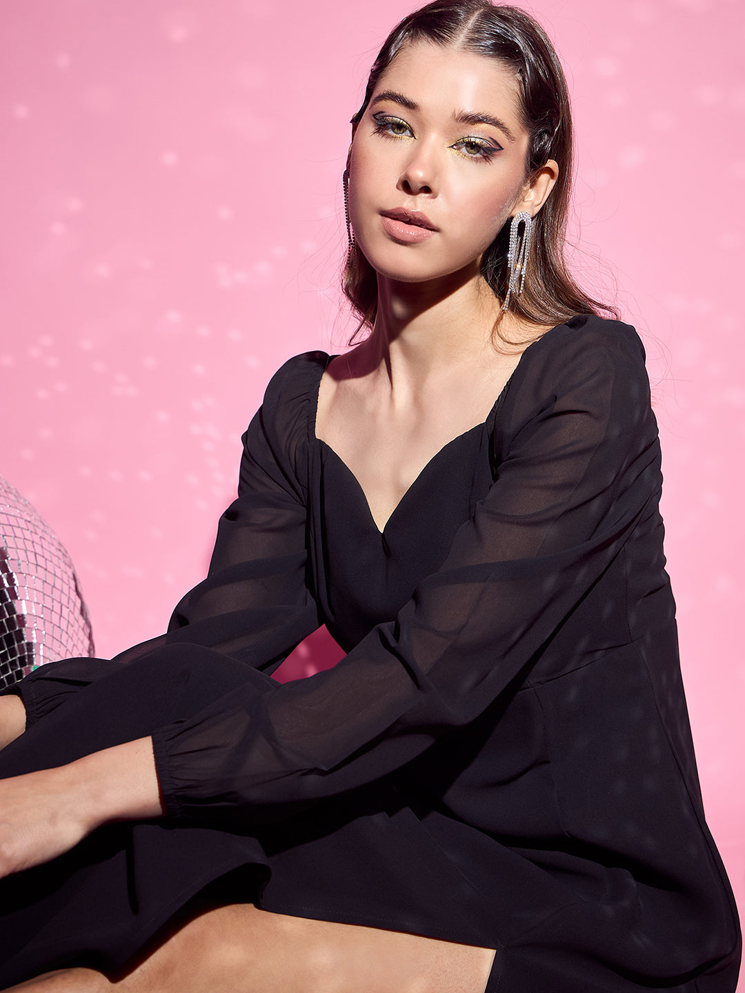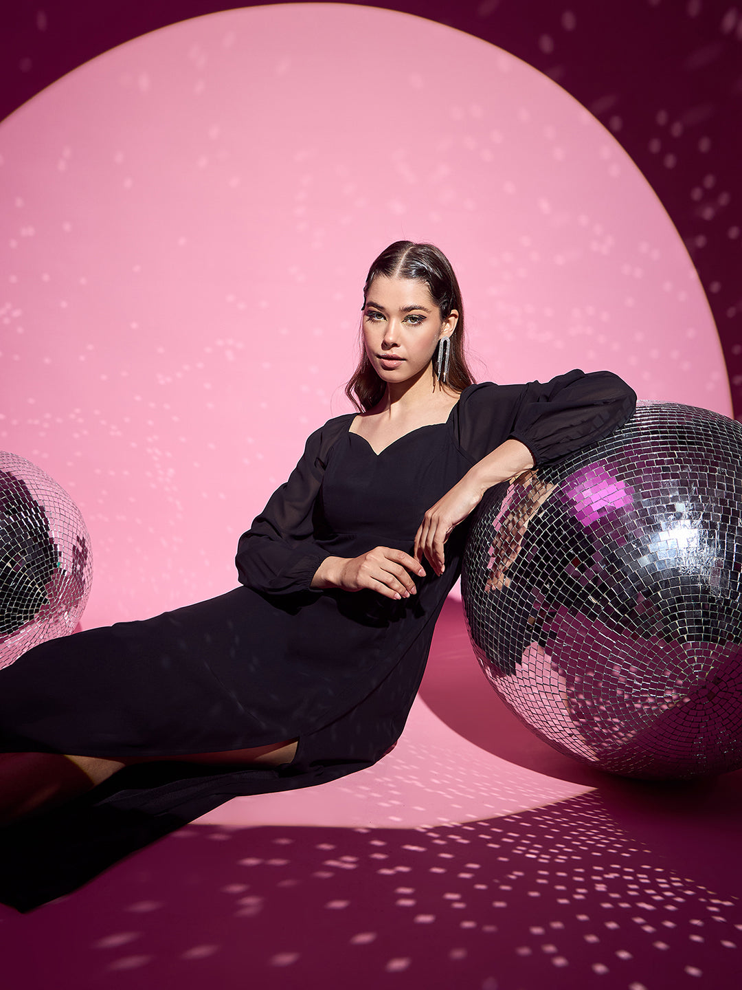Berrylush Women Solid Black Sweetheart Neck Bishop Sleeves Thigh-High Slit Straight Hem A-Line Maxi Dress