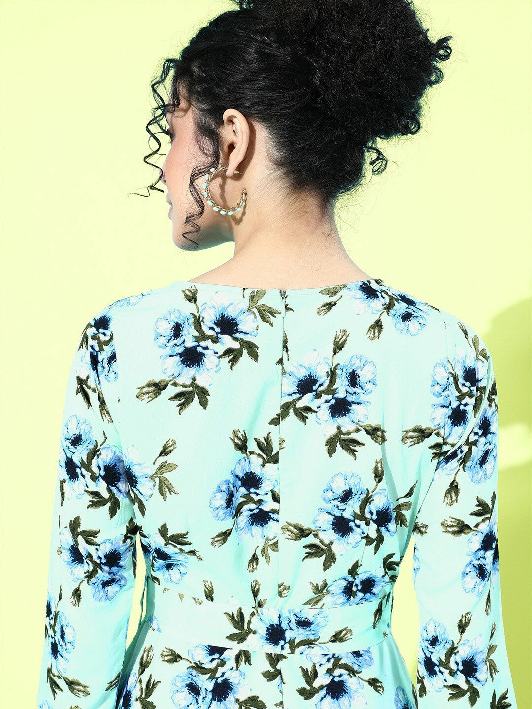 Berrylush Women Green and Blue Floral Printed Round Neck Tie-Waist Maxi Dress