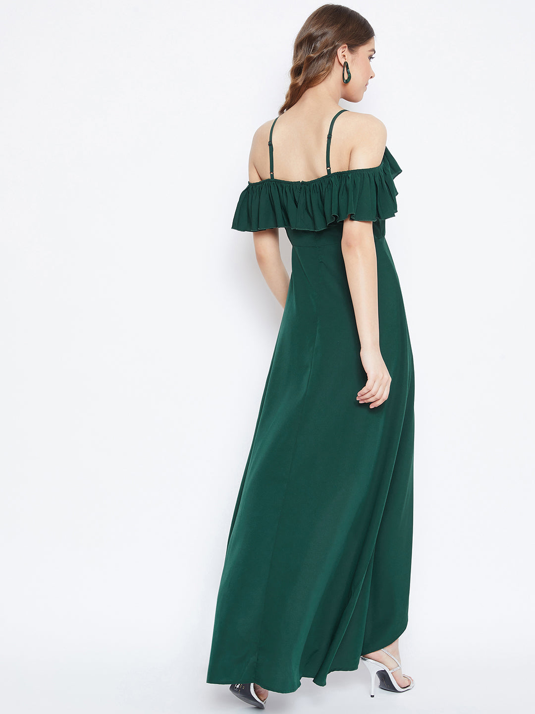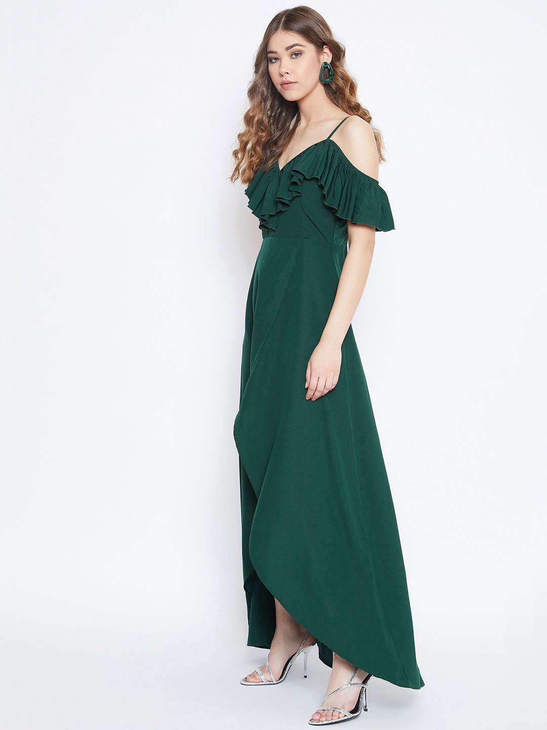 Berrylush Women Solid Dark Green V-Neck Thigh-High Slit Frilled Maxi Dress