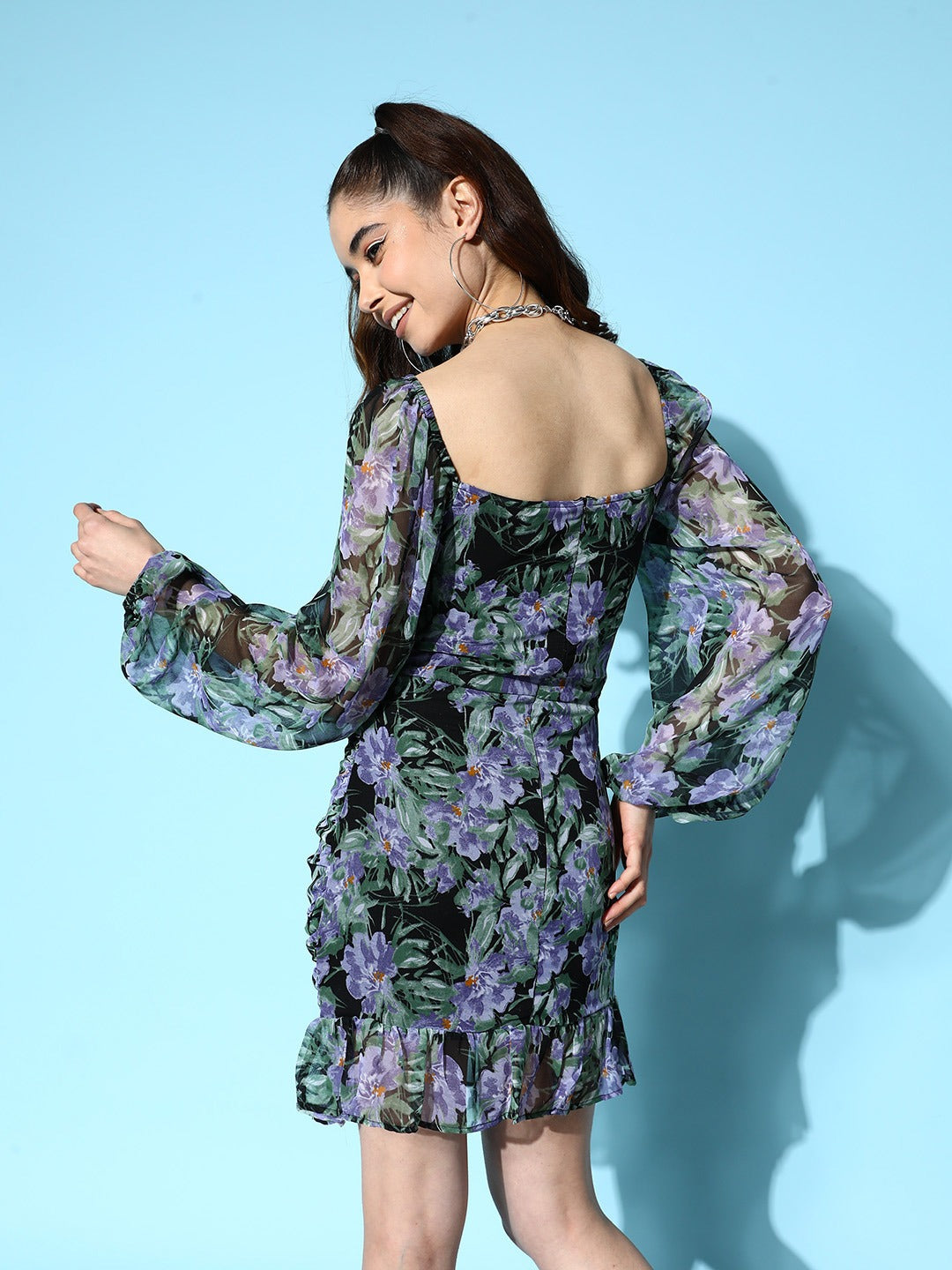 Berrylush Women Black & Blue Floral Printed Sweetheart Neck Crepe Straight Hem Pleated Bodycon Mini Dress