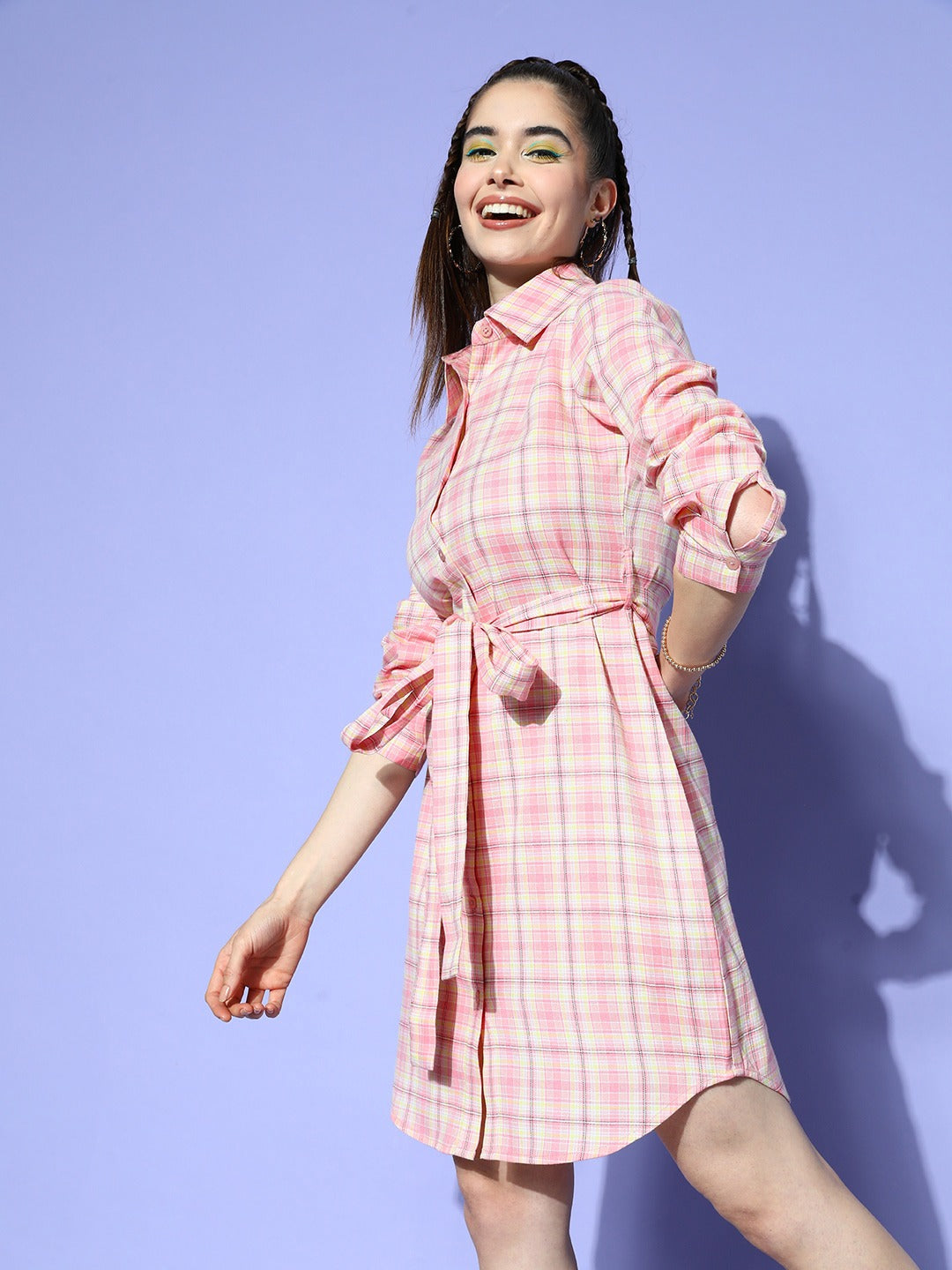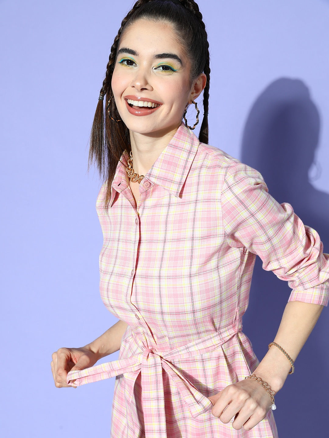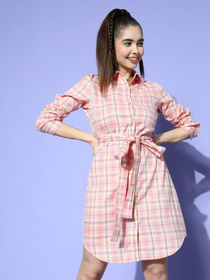 Berrylush Women Pink & White Checked Pattern Collar Neck Crepe Waist Tie-Up Curved Hem Shirt Style Mini Dress