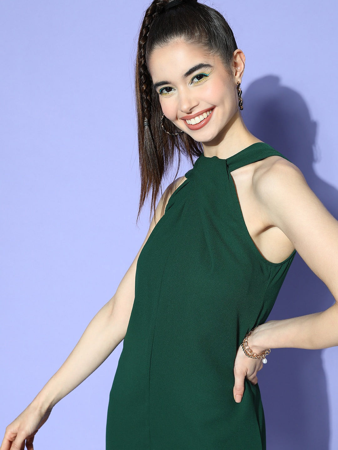 Berrylush Women Solid Green Round Neck Sleeveless Crepe Straight Hem Mini Dress