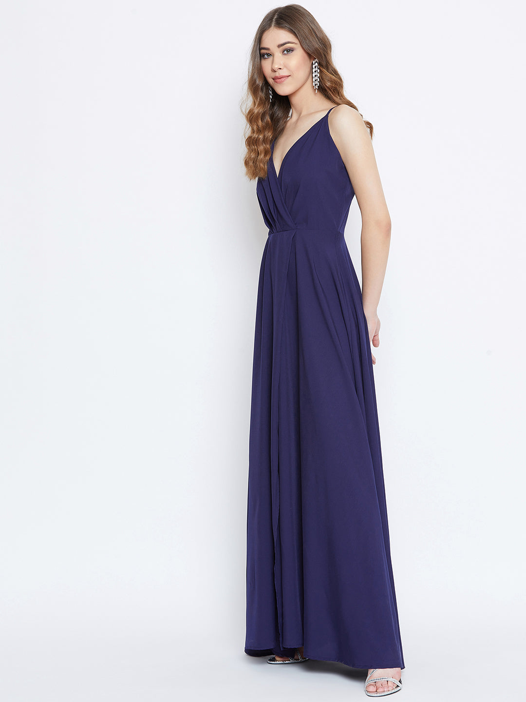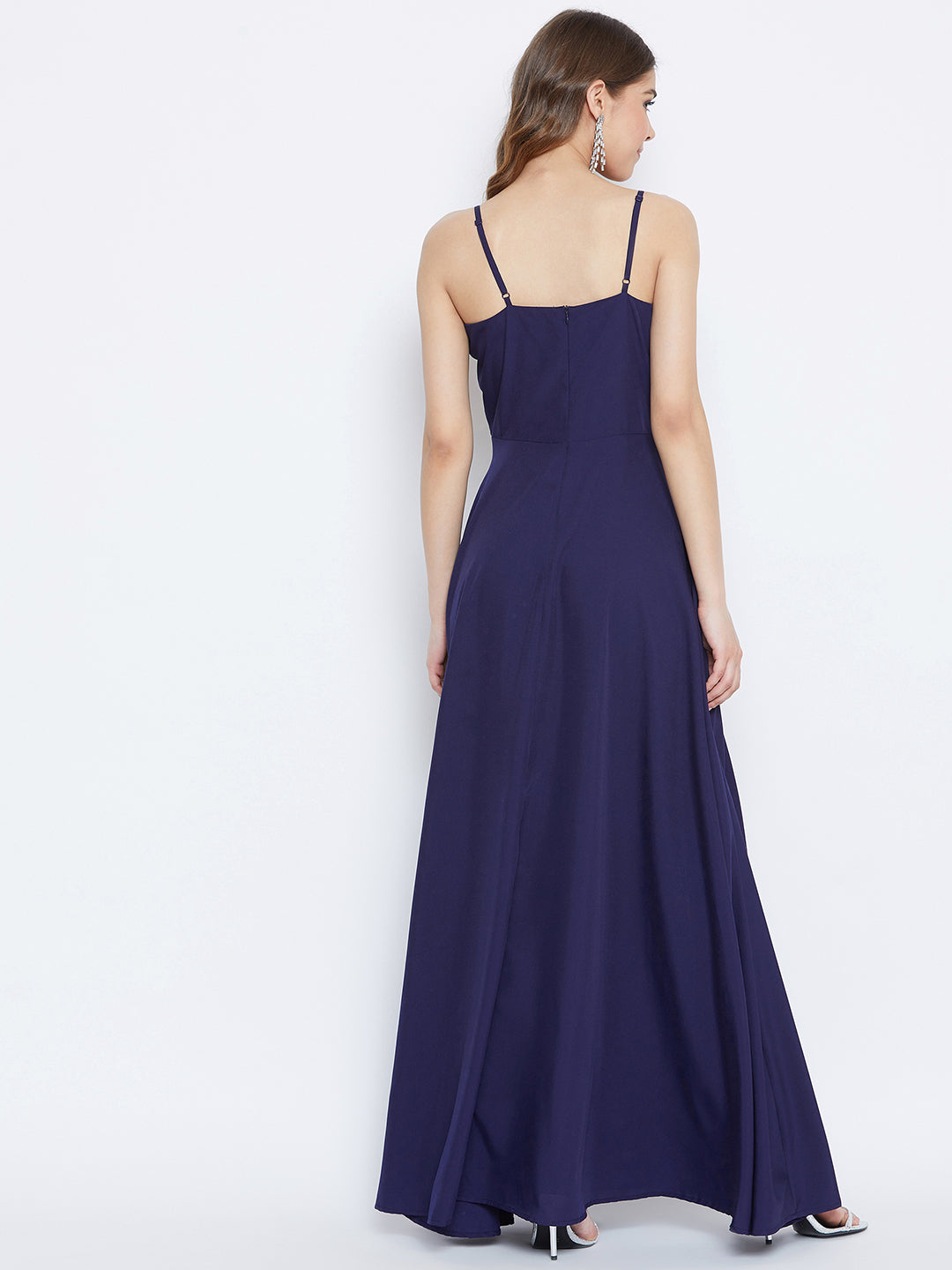 Berrylush Women Solid Navy Blue V-Neck Thigh-High Slit Fit & Flare Maxi Dress