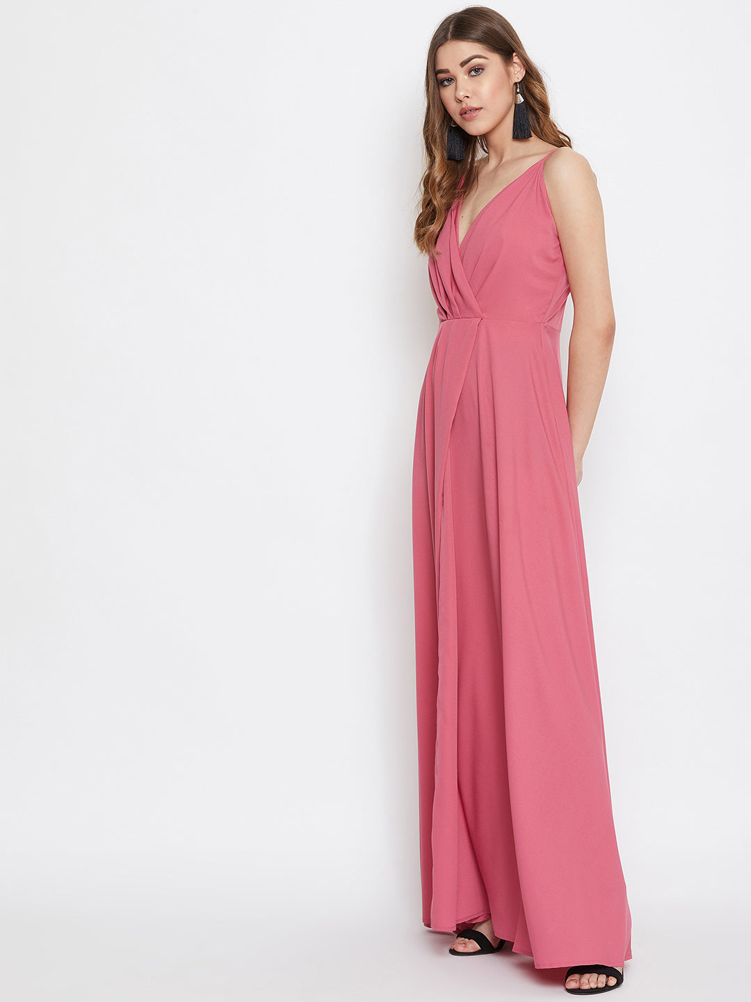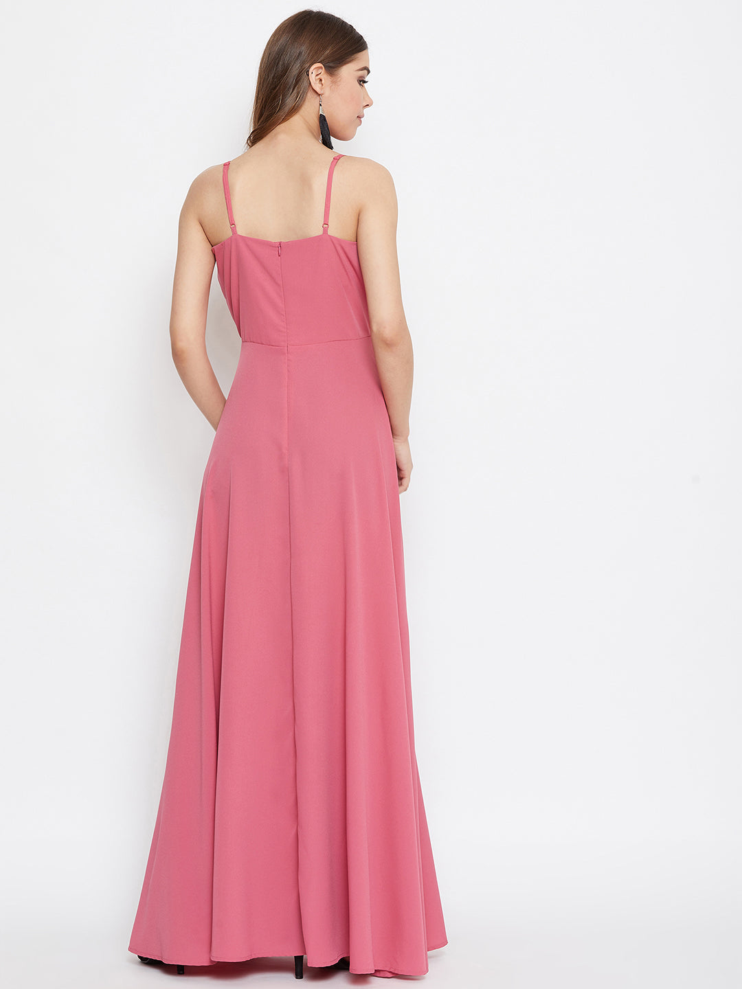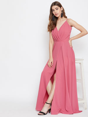 Berrylush Women Solid Pink V-Neck Sleeveless Thigh-High Slit Flared Maxi Dress