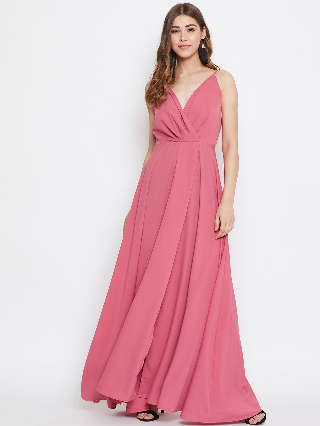 Grab all the attention with a style that can rarely go wrong for any kind of occasion just like this pretty Solid Pink V-Neck Sleeveless Thigh-High Slit Flared Maxi Dress designed by Berrylush. This maxi dress will surely add a feminine charm to your look with the amusing duo of blush pink shade and a solid pattern gives away a positive and hopeful vibe. Designed with a semi-fit silhouette that gives your curve-hugging silhouette while the flared hemline adds texture and flair to this maxi dress. Enjoy clubbing with your friends looking bewitching by pairing this beautiful blush pink maxi dress with your favourite heels and stylish handbag.