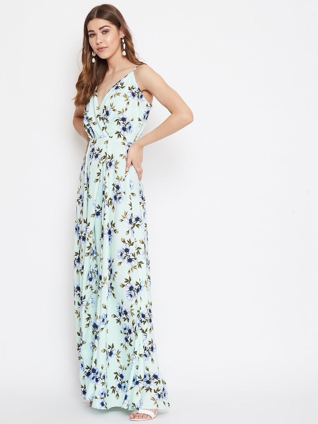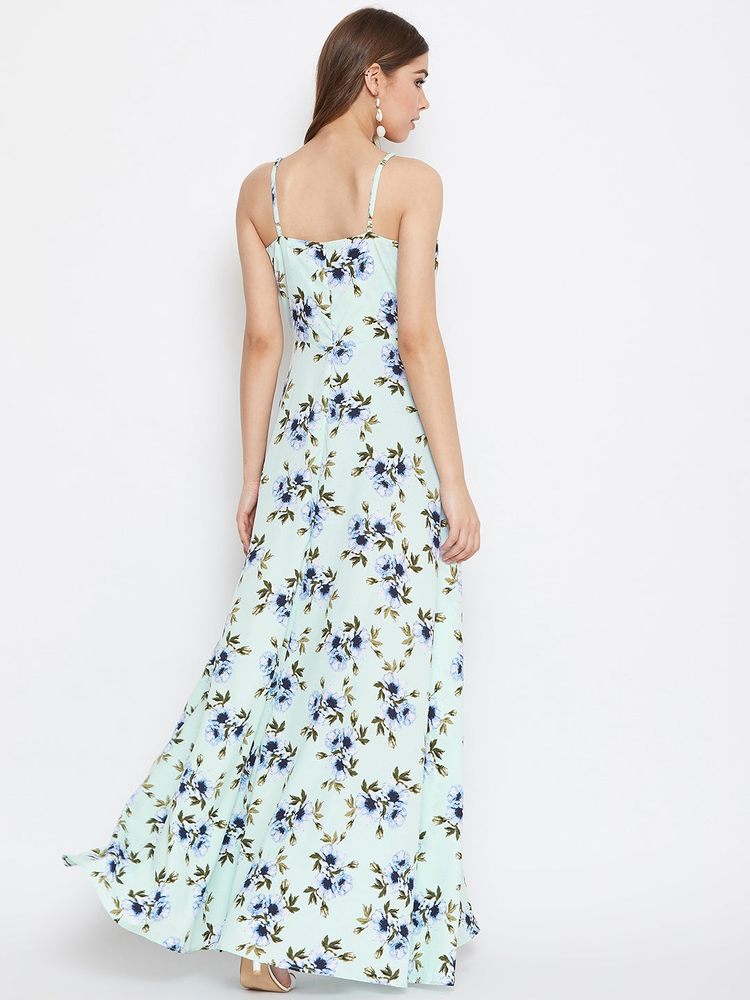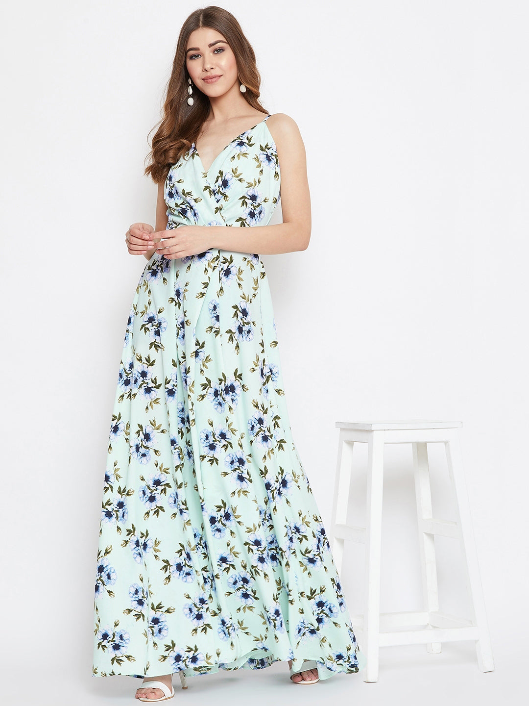 Enliven your western wear collection this spring by adding the vibrant hues of nature with this Green & Turquoise Blue Floral Printed V-Neck Thigh-High Slit Fit & Flare Maxi Dress designed by Berrylush. The most admiring element of this maxi dress is its turquoise shade which presents a beautiful combination of turquoise blue and green colour tone demonstrating the essence of the gem of the same name while the floral print injects the epitome of youthful beauty. Designed with front-slit and flared hemline to give exotic as well as a luxurious sheen to your lower body. To develop a tantalizing appearance, you can pair up this gracious maxi dress with pair of high-heels, hoop earrings, and a clutch.