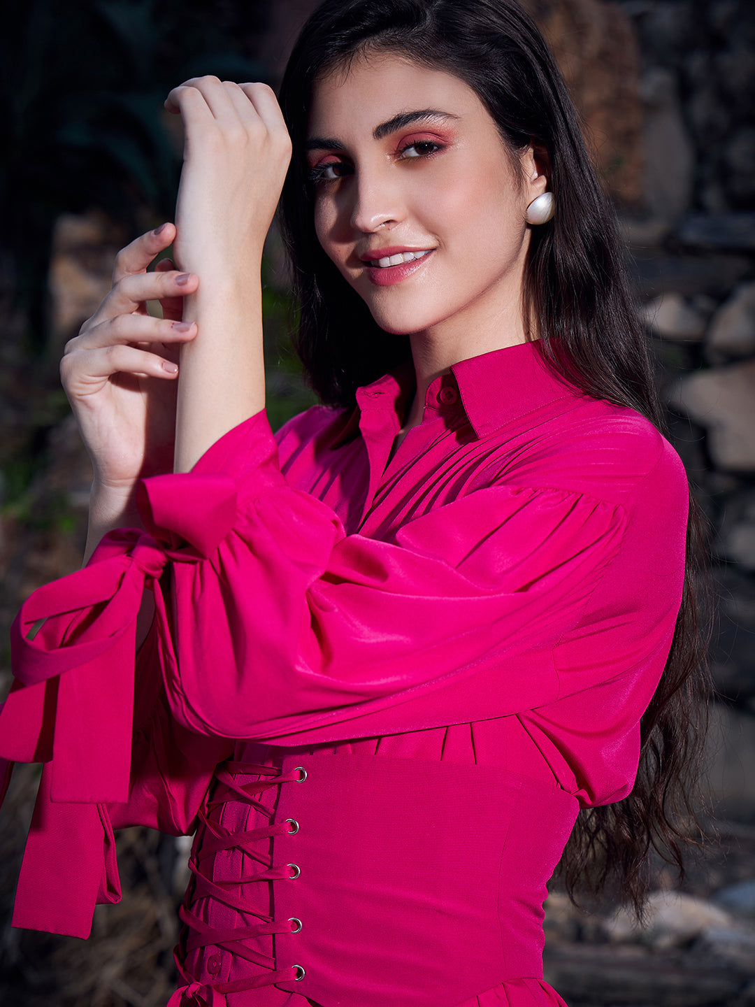 Gift your summer contingent a tint of vintage charm and aesthetic treat with this gorgeous Solid Pink Collar Neck Waist Tie-Up Corset Curved Hem Mini Shirt Dress designed by Berrylush. Fashioned with an astonishing amalgam of pink shade and solid pattern that depicts your passionate personality with classic essence. Featuring cuffed long sleeves that lend this dress a versatile styling note along with comfortable movements of your arms. The woven weave enhances the overall durability and flexibility of this dress to withstand tear issues. Put forward your stunning look while stepping out from your home by teaming up this shirt dress with a pair of cute wedges, geometric style earrings, and a chic side bag.