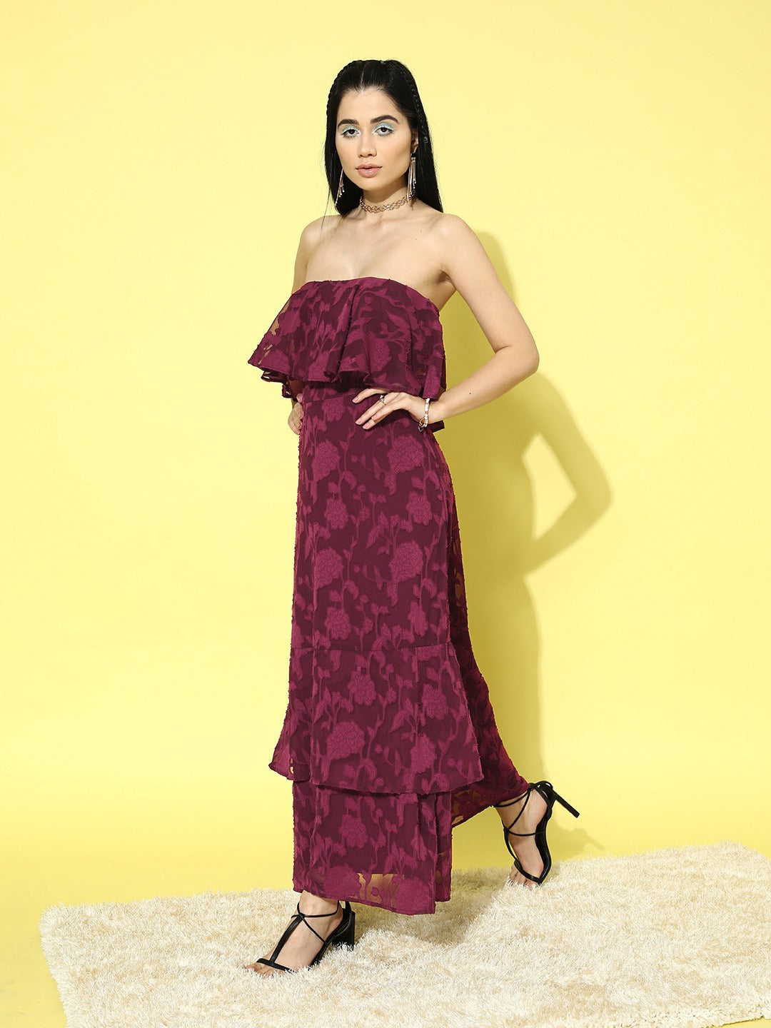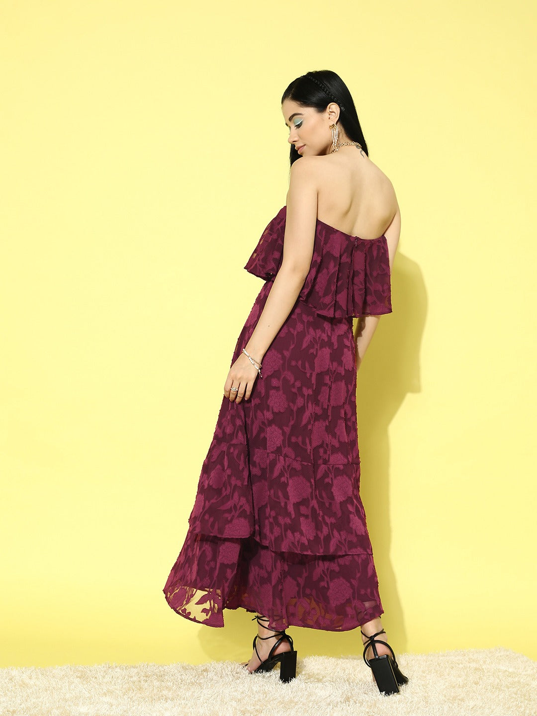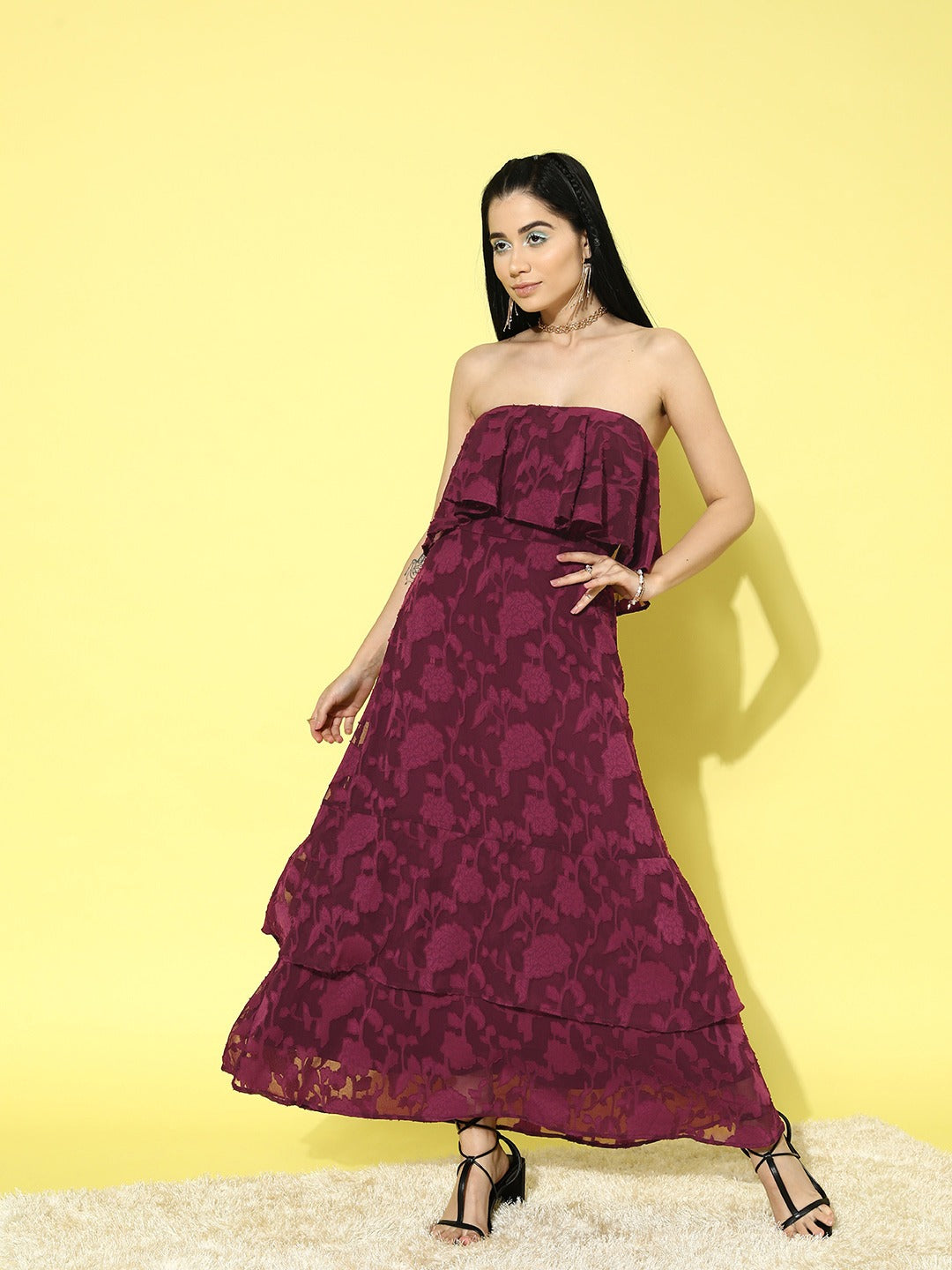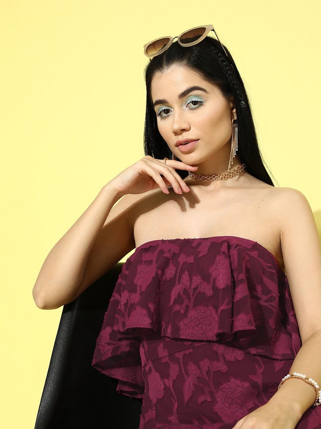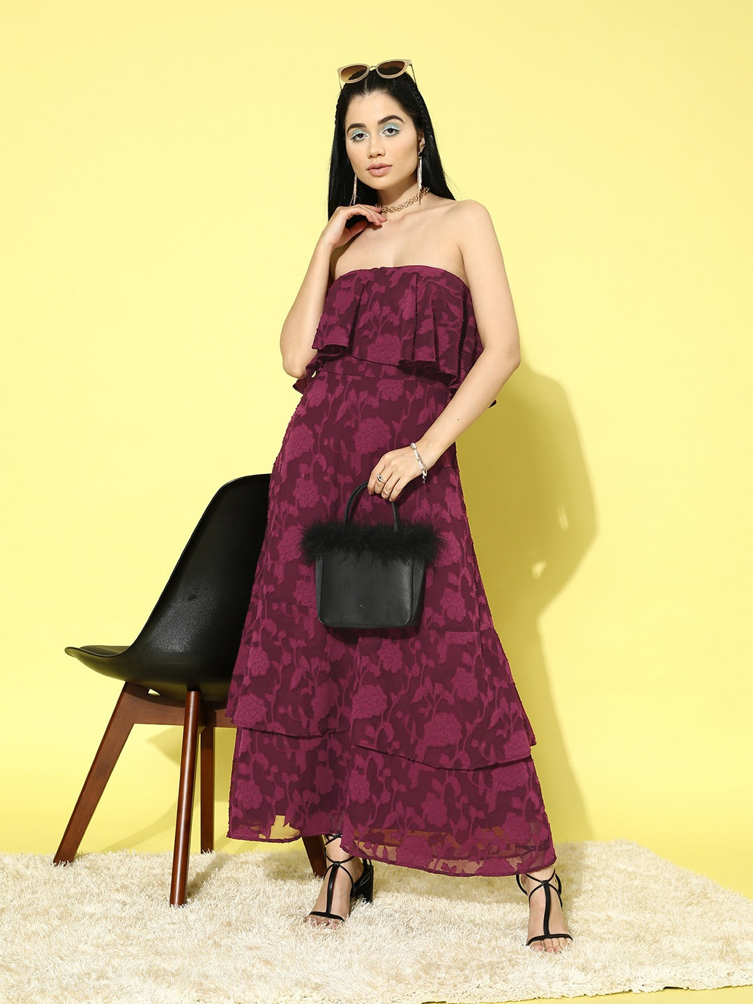 Berrylush Women Maroon Floral Pattern Strapless Neck Sleeveless Jacquard Ruffled Fit & Flare Midi Dress