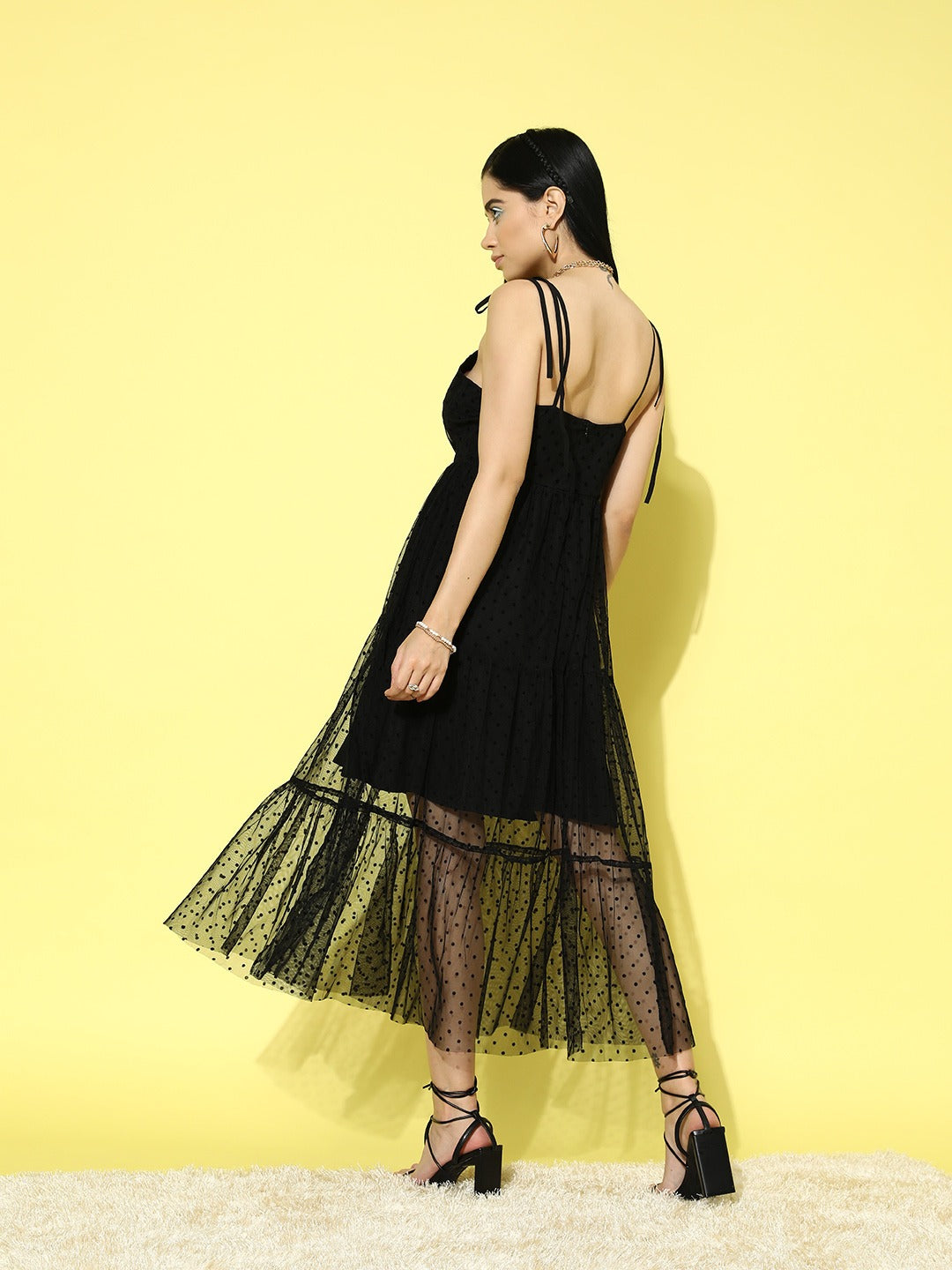 Berrylush Women Solid Black Dobby Weave Sweetheart Neck Tie-Up Straps Semi-Sheer Net Tiered Fit & Flare Mini Dress