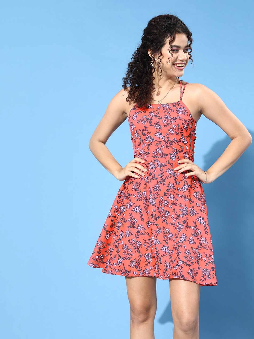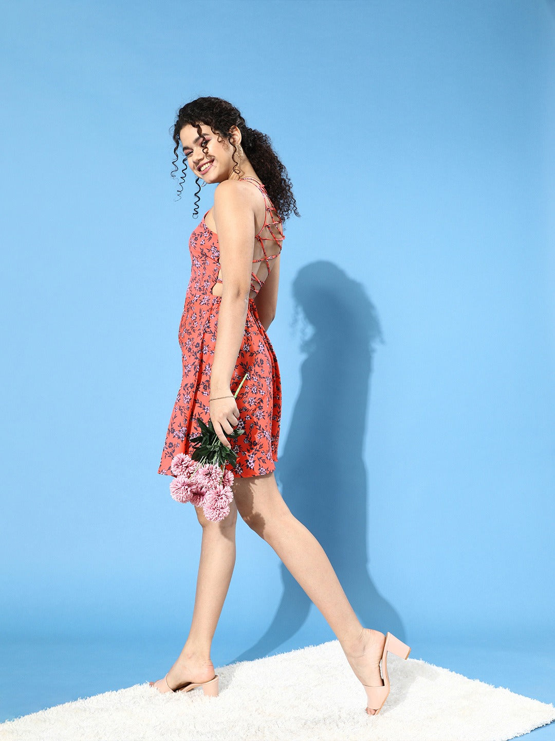 Berrylush Women Orange Floral Printed Crepe Fit & Flare Mini Dress