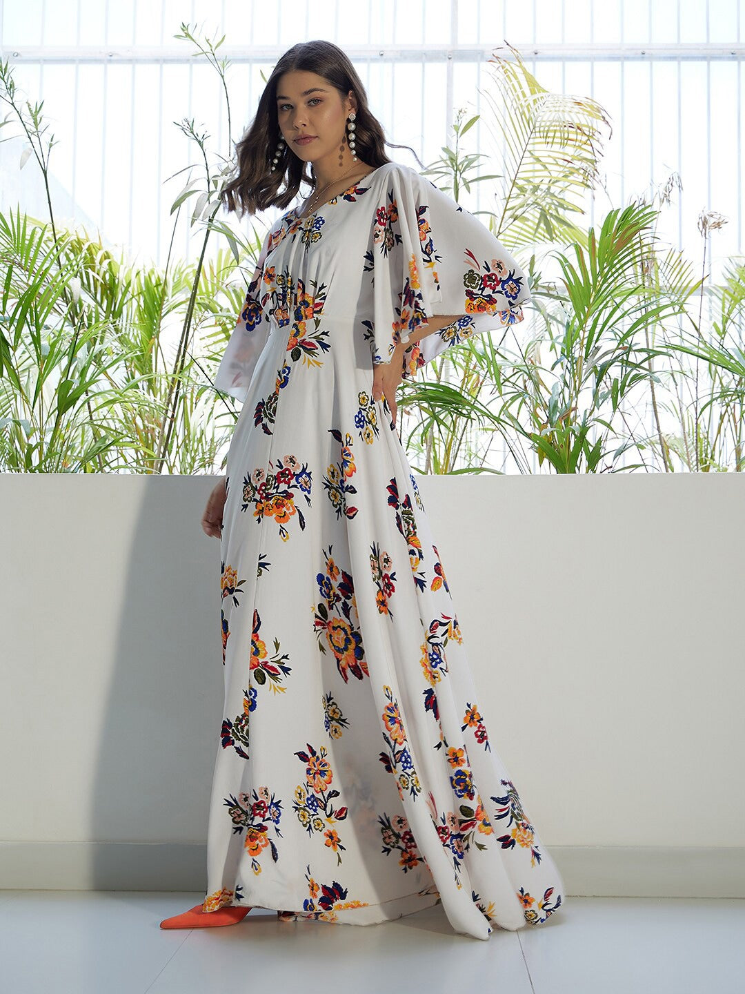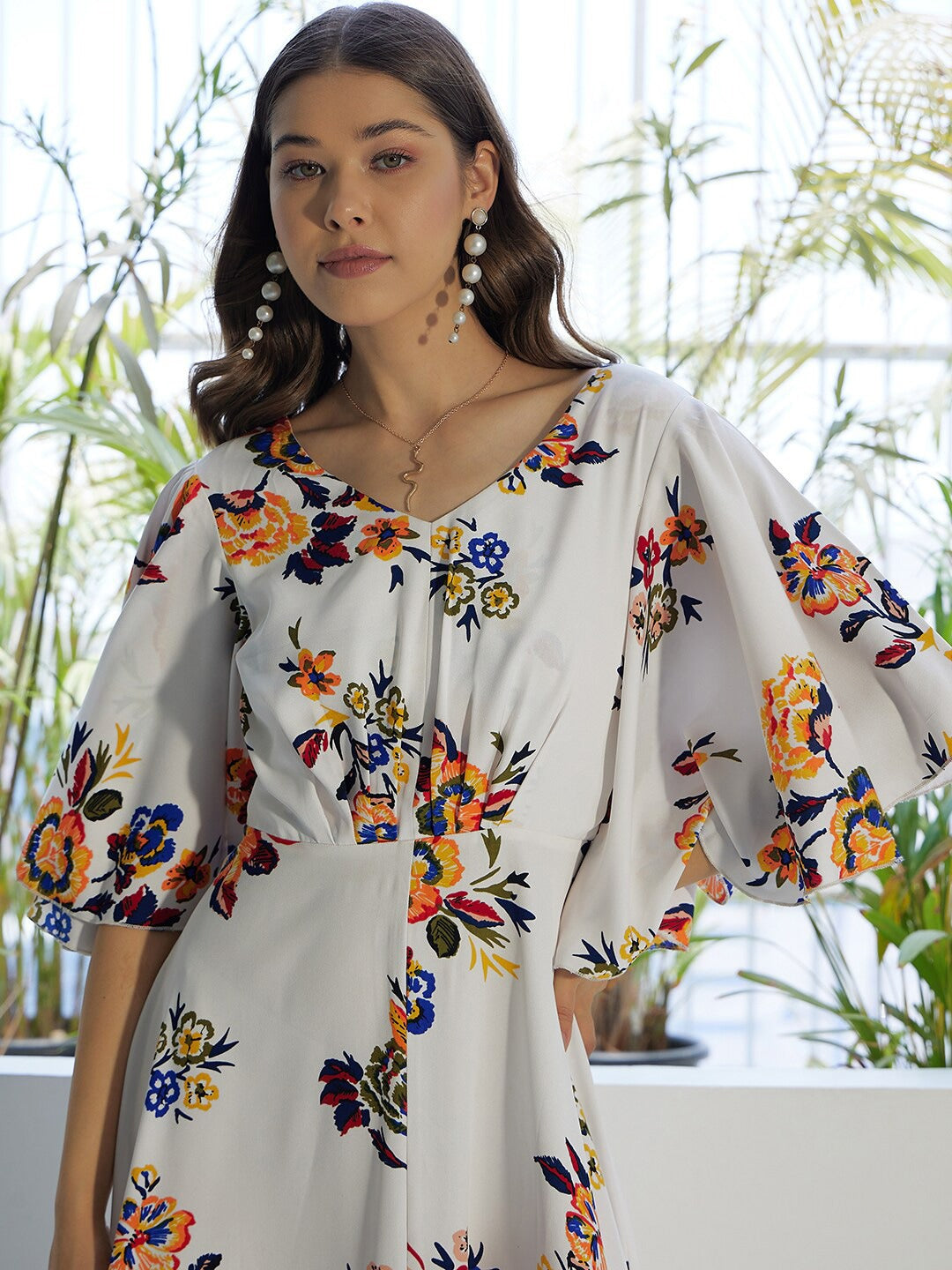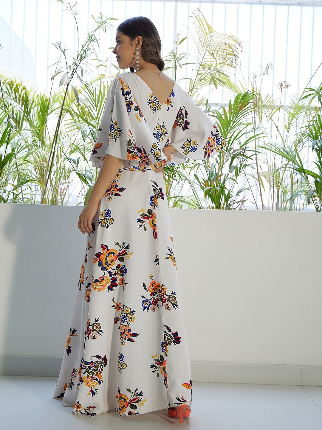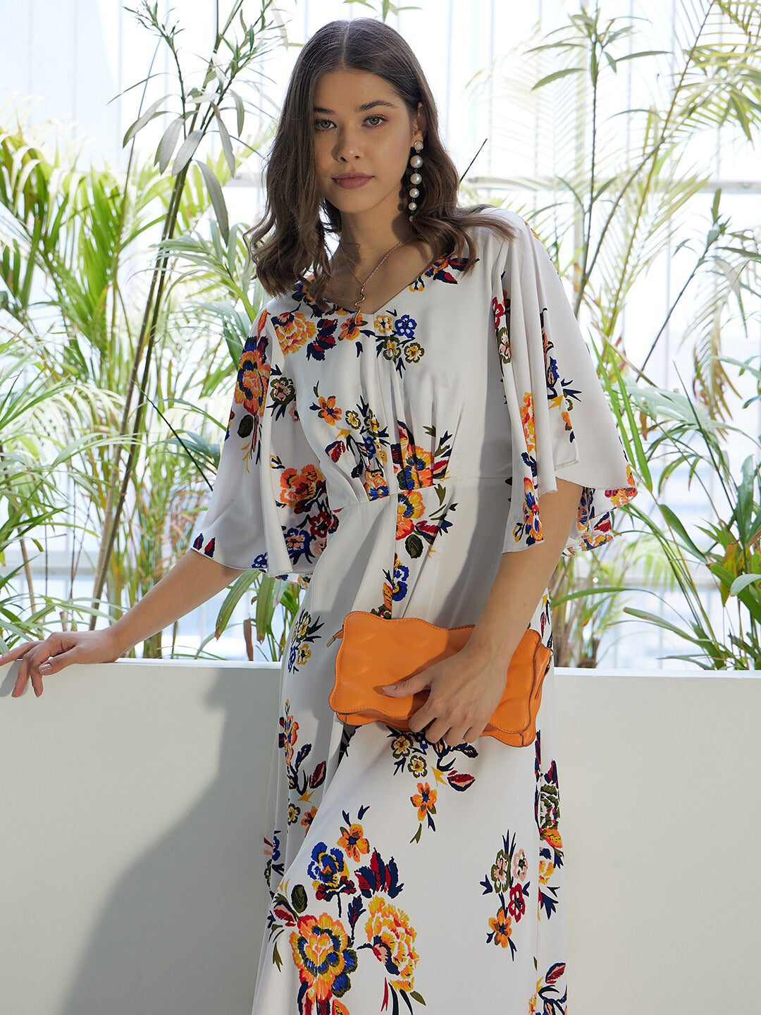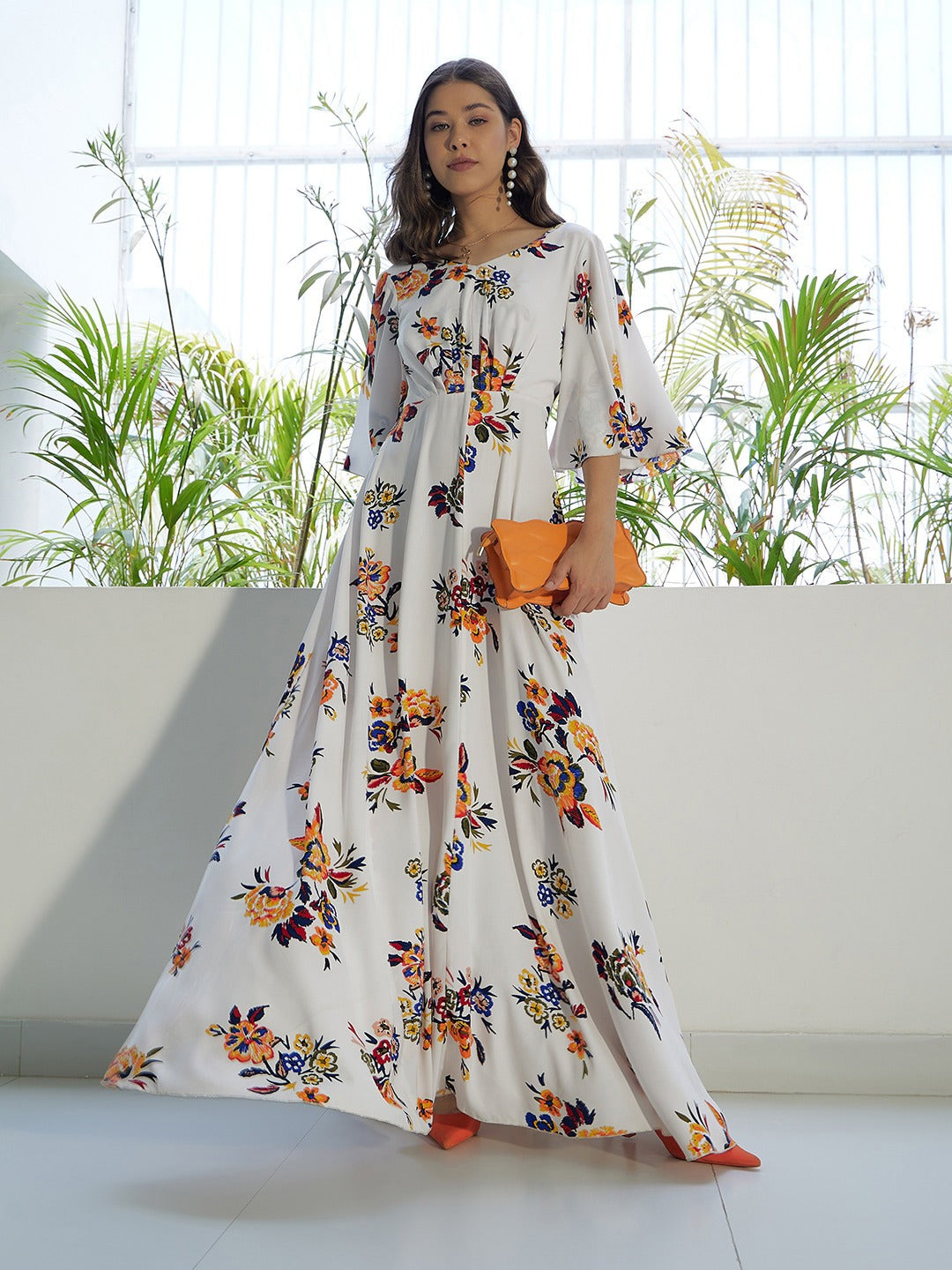 Berrylush Women White & Orange Floral Printed V-Neck Bell Sleeves Flared Maxi Dress