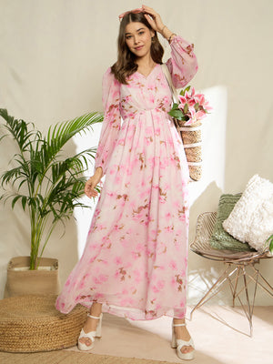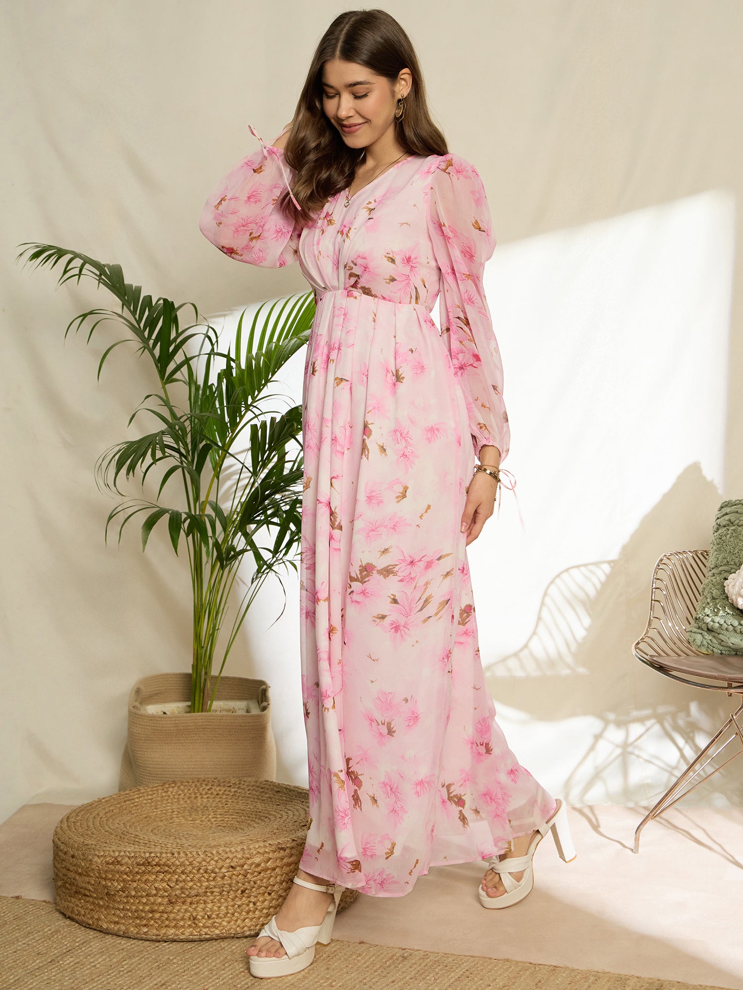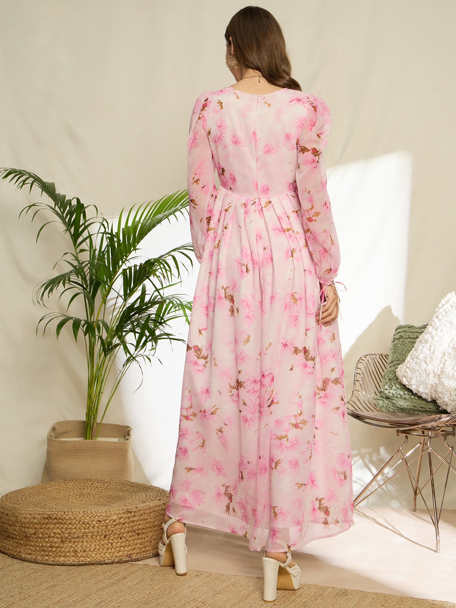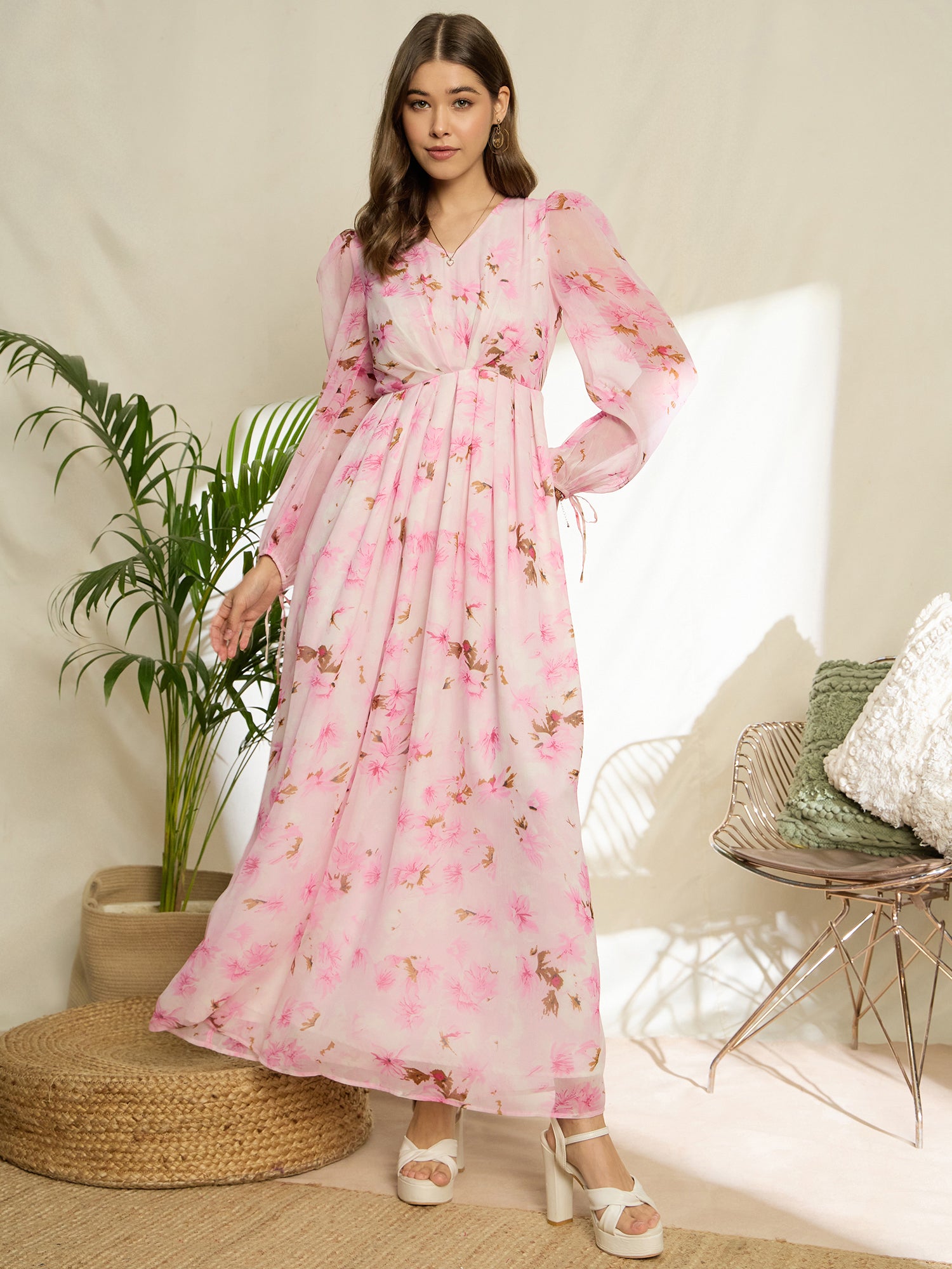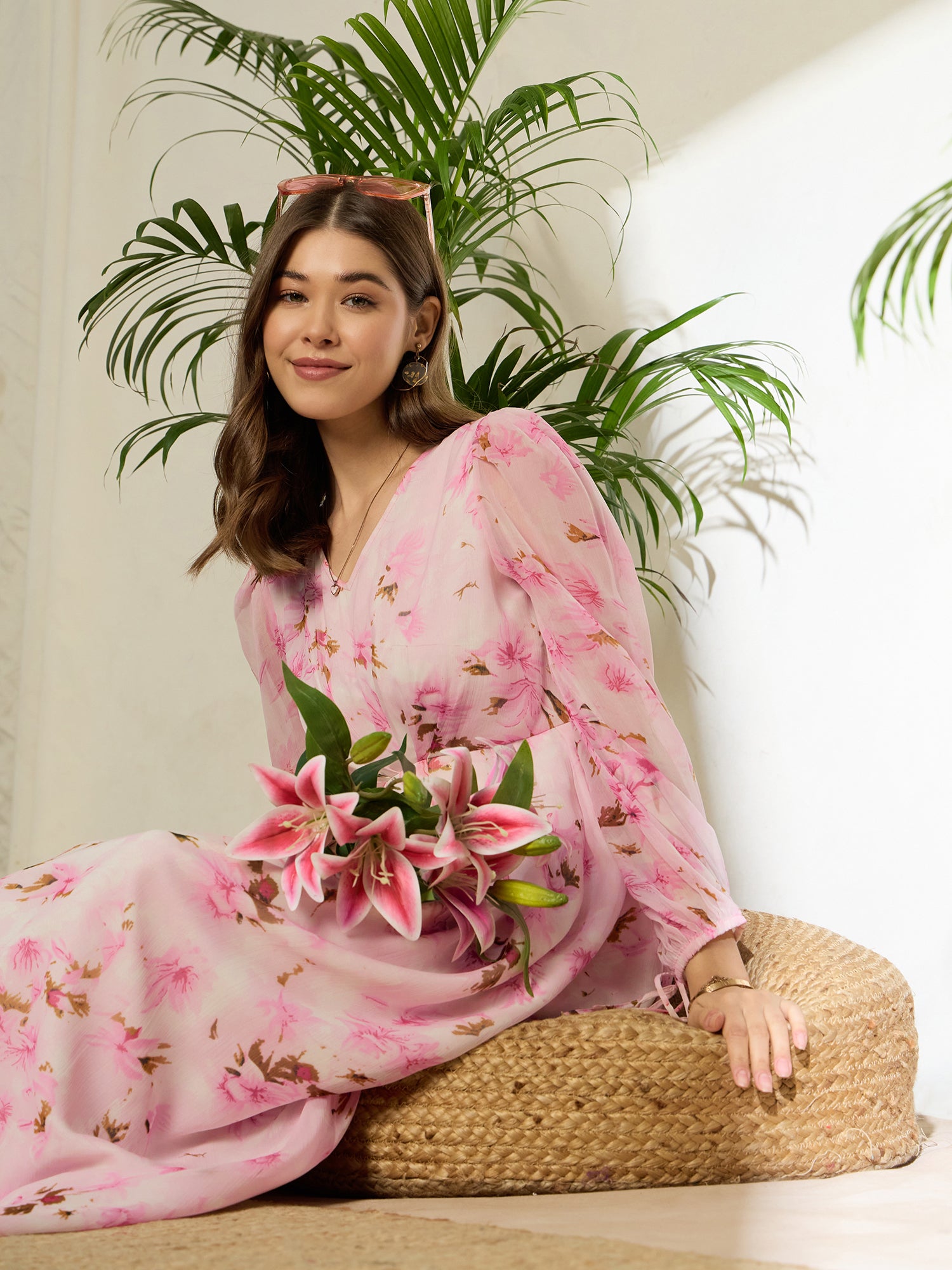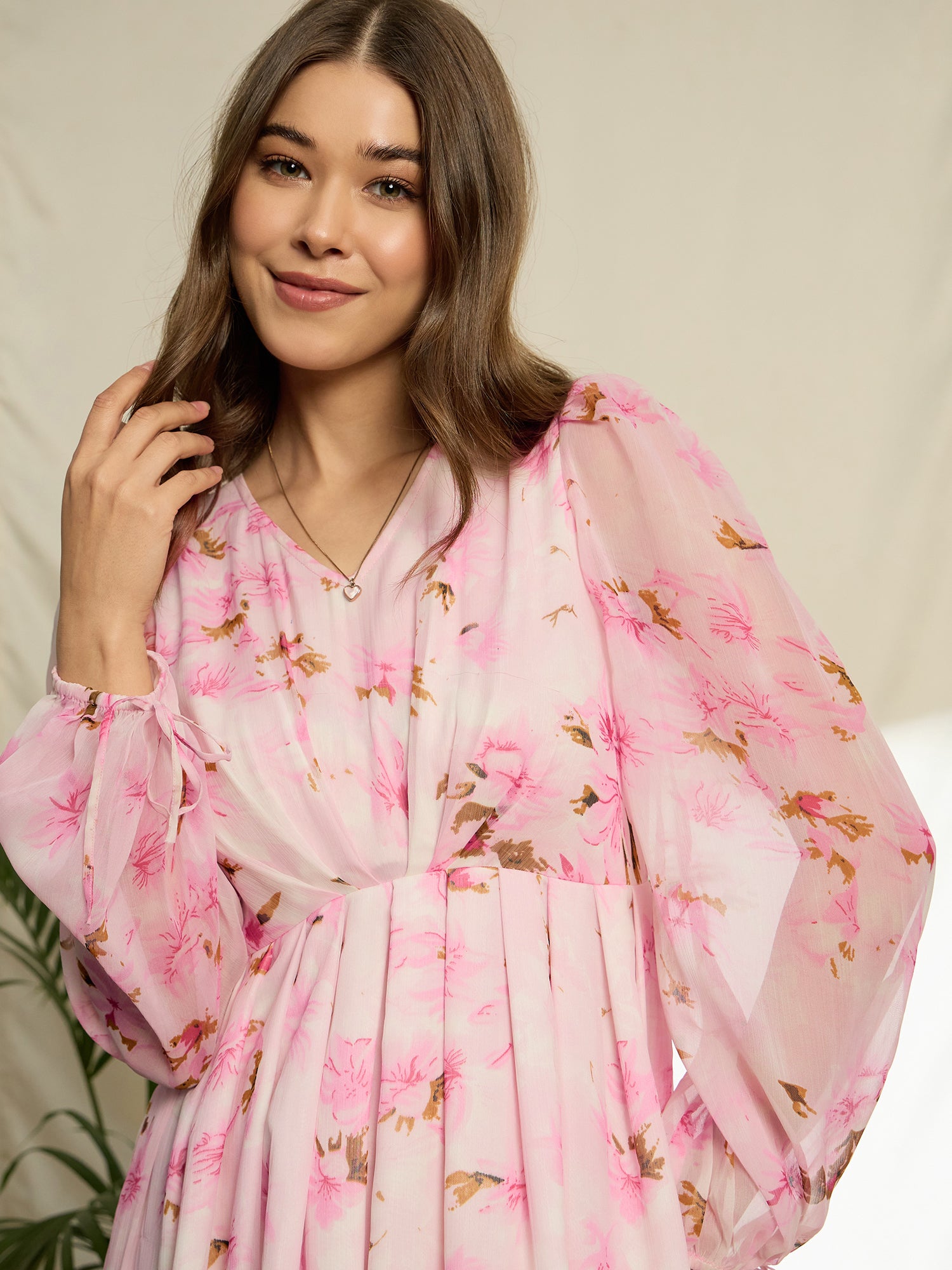 Berrylush Women Pink Floral Printed V-Neck Bishop Tie-Up Cuff Sleeves Back Concealed Zipper-Up Pleated Maxi Dress
