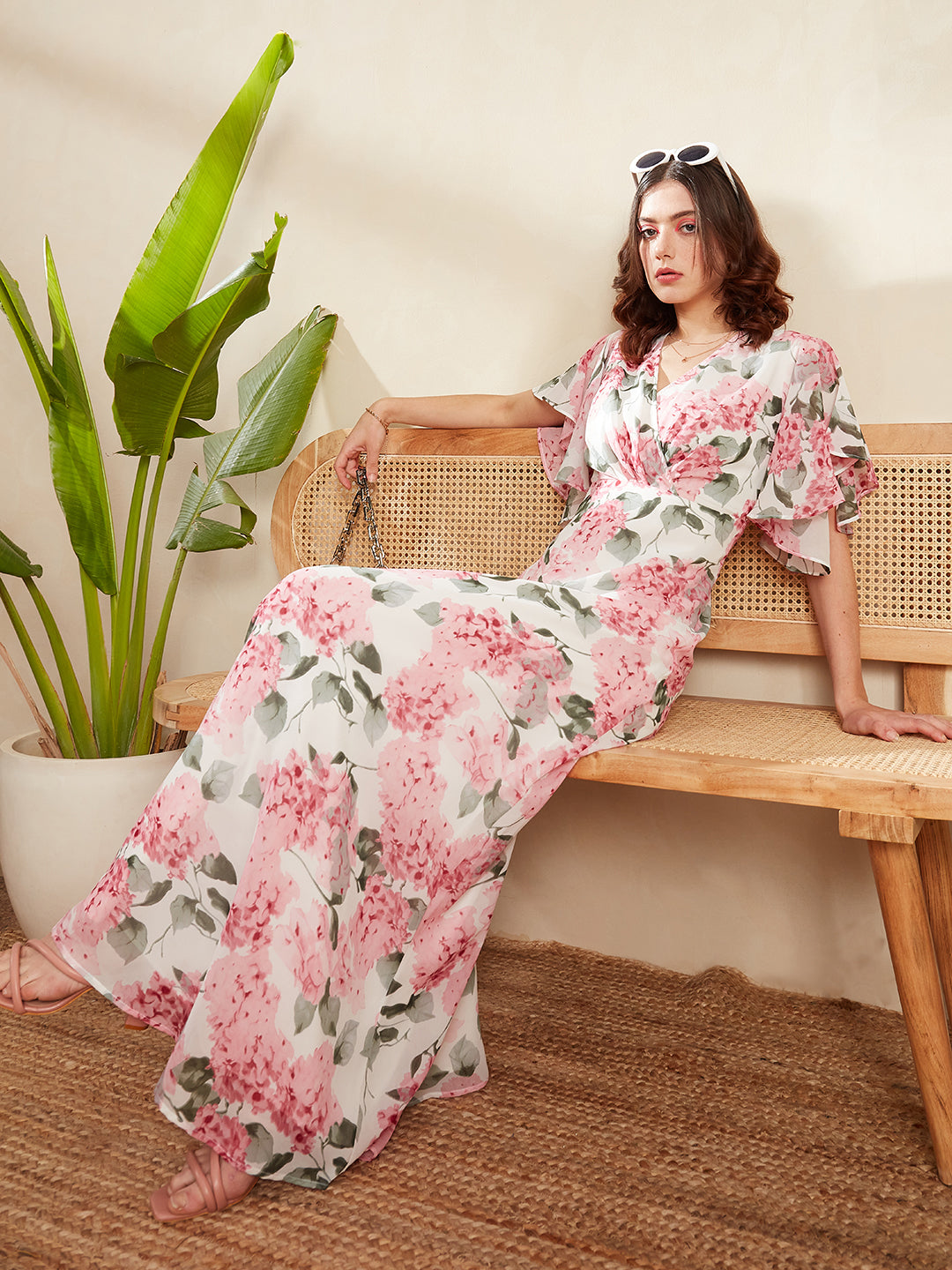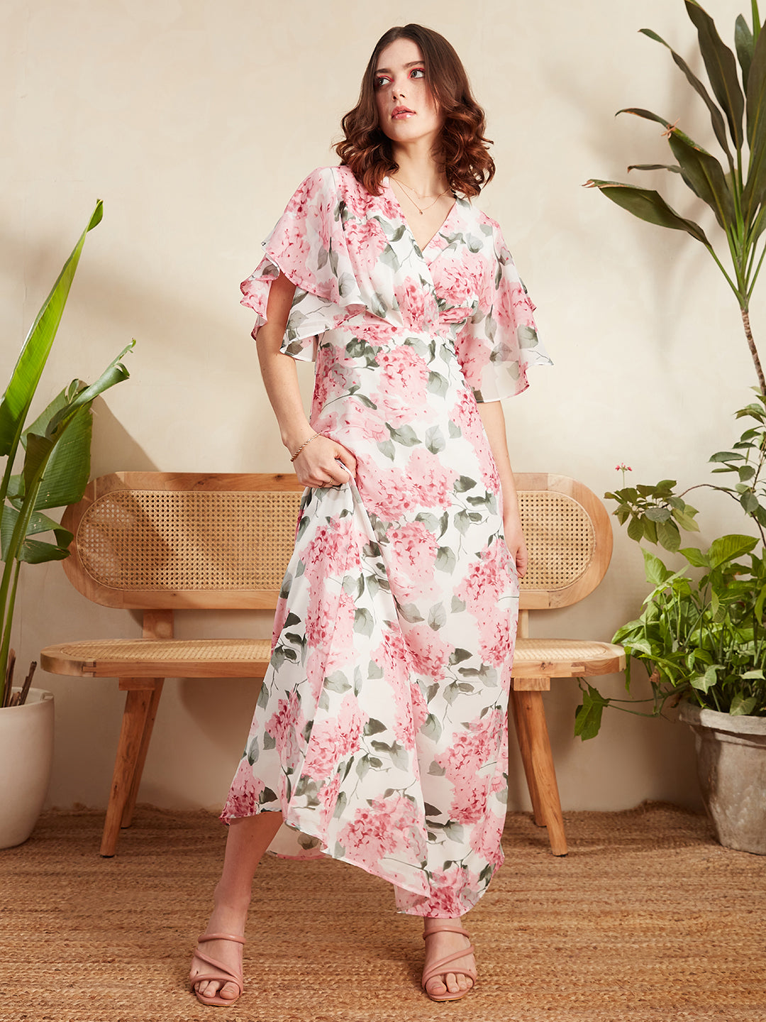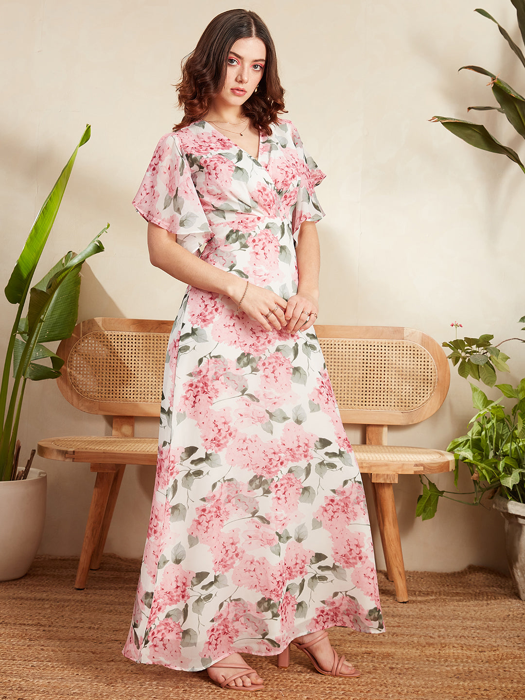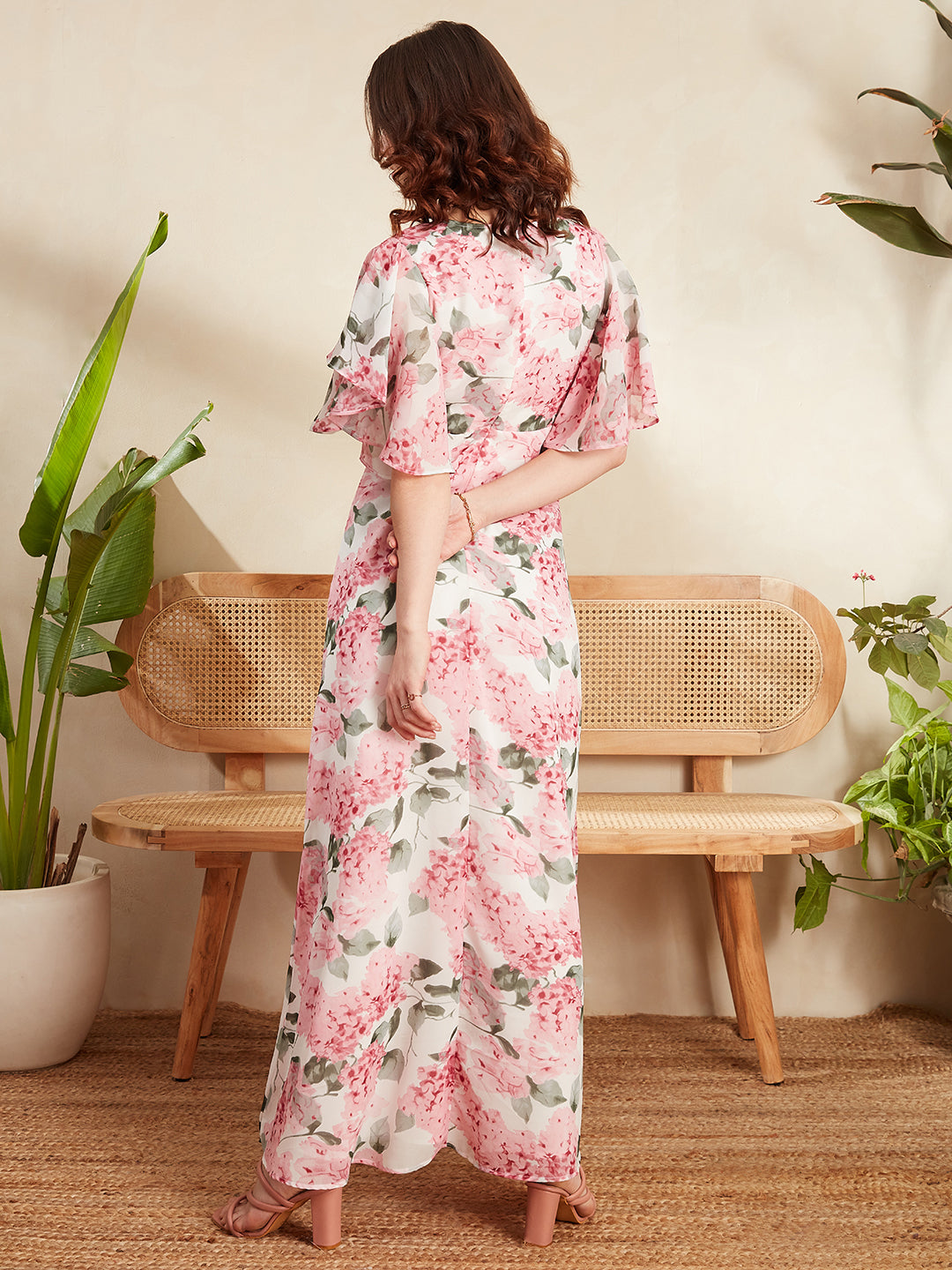 Elevate your party wardrobe with the enchanting charm of Berrylush's White & Pink Floral Printed V-Neck Flutter Sleeve Pleated Maxi Dress. Embrace a blend of elegance and whimsy in this beautifully crafted piece, where delicate florals dance across a pristine white polyester fabric, creating an irresistibly feminine appeal. The deep V-neck accentuates your silhouette while flutter sleeves add a playful touch to your movements. Designed for those ethereal moments, its pleated surface and flared hemline ensure you'll float through any event with grace. Perfectly opaque for comfort, this maxi dress promises to be the centerpiece of every celebration - ensuring all eyes are on you.