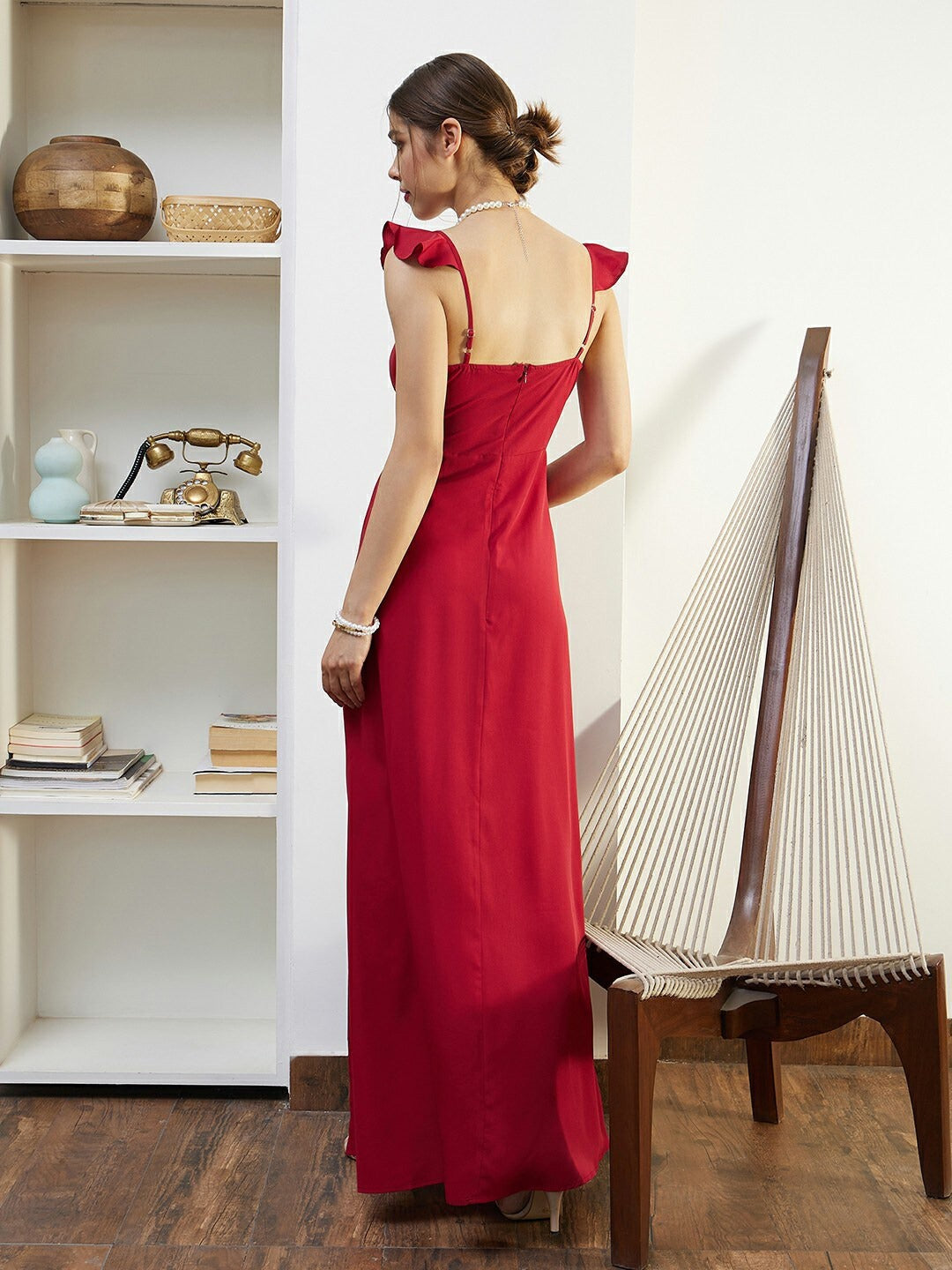 Berrylush Women Solid Red Sweetheart Neck Cut-Out Tie-Up Thigh-High Slit Straight Hem Maxi Dress