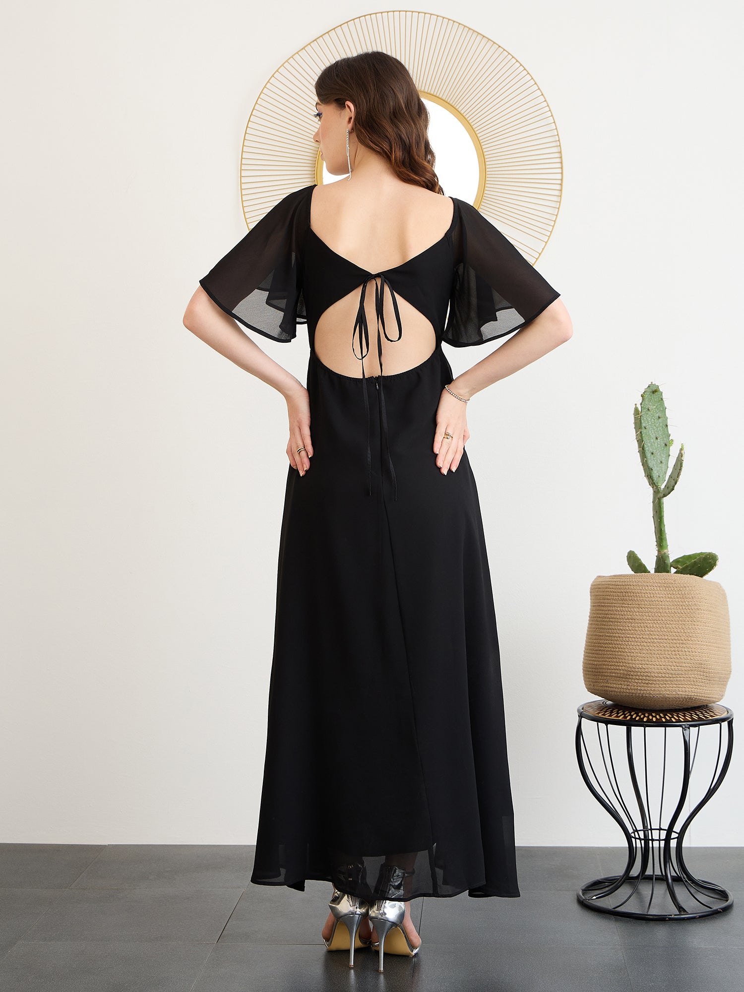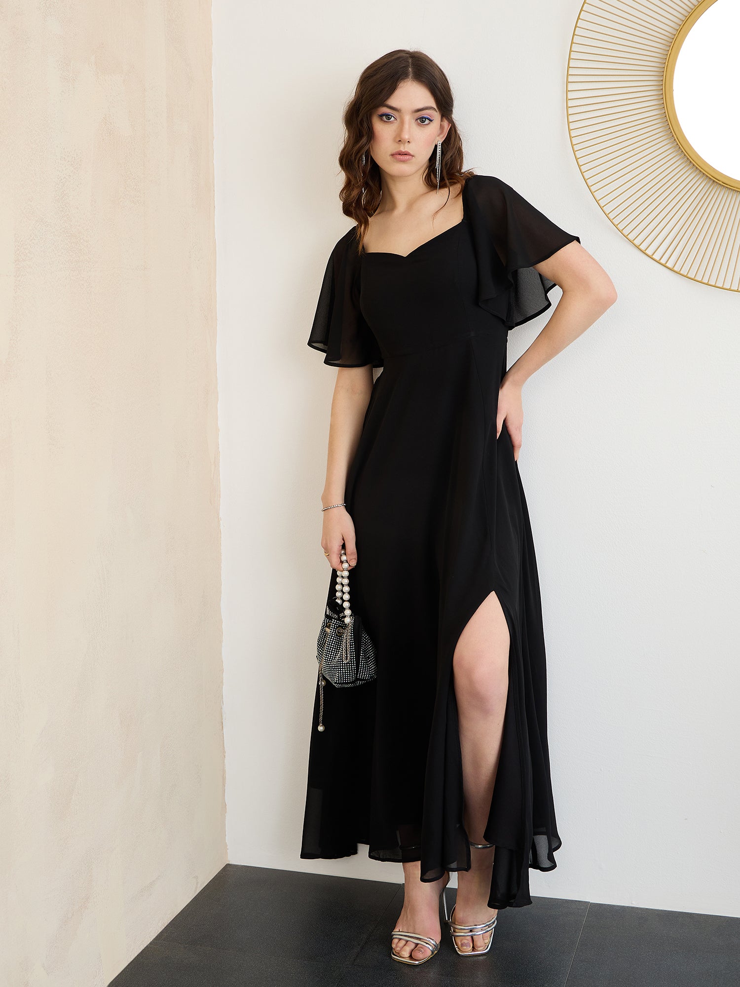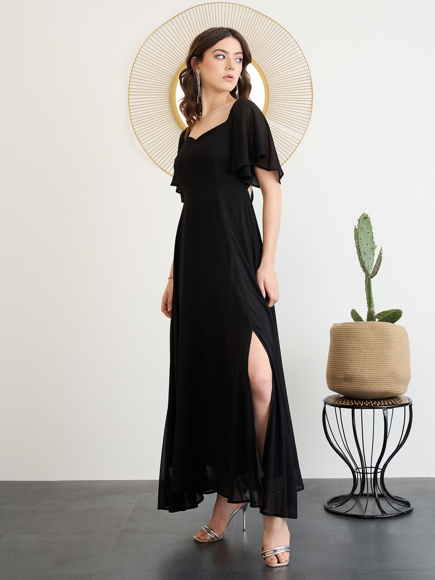 Berrylush Women Black Solid Sweetheart Neck A-Line Maxi Dress