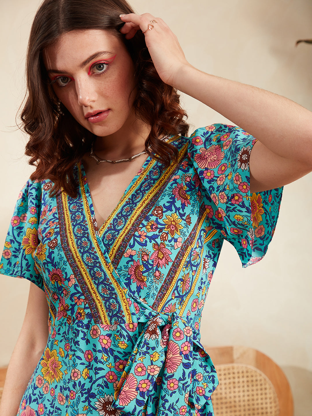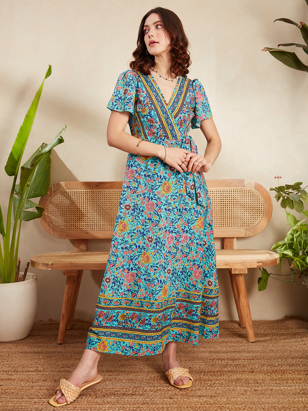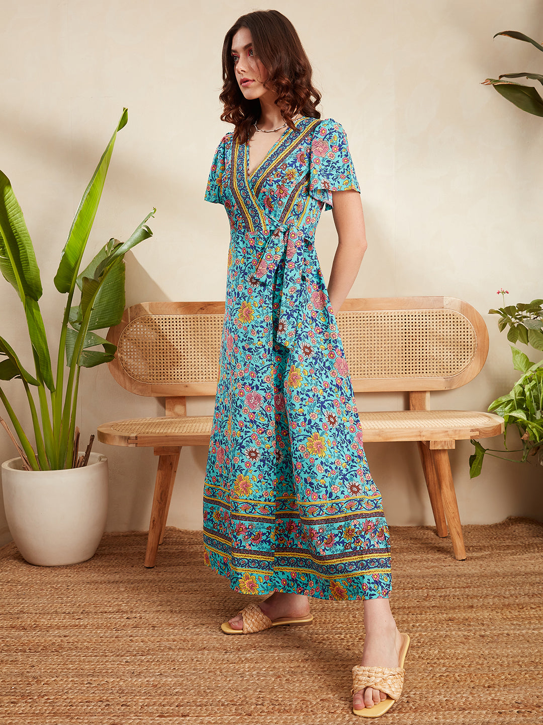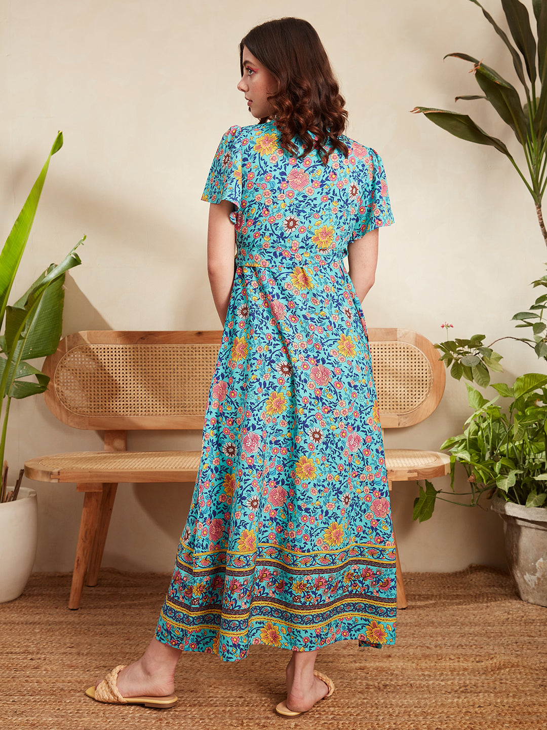 Berrylush Women Blue & Multicolour Floral Printed V-Neck Waist Tie-Up Thigh-High Slit Flared Wrap Maxi Dress