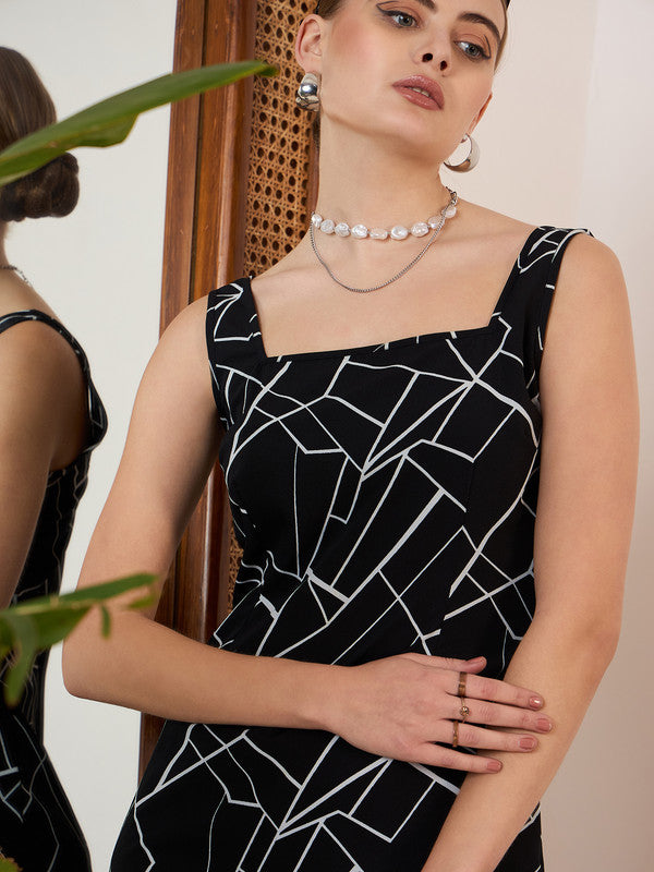 Berrylush Women Black & White Geometric Printed Square Neck Sleeveless Crepe Straight Hem Bodycon Mini Dress