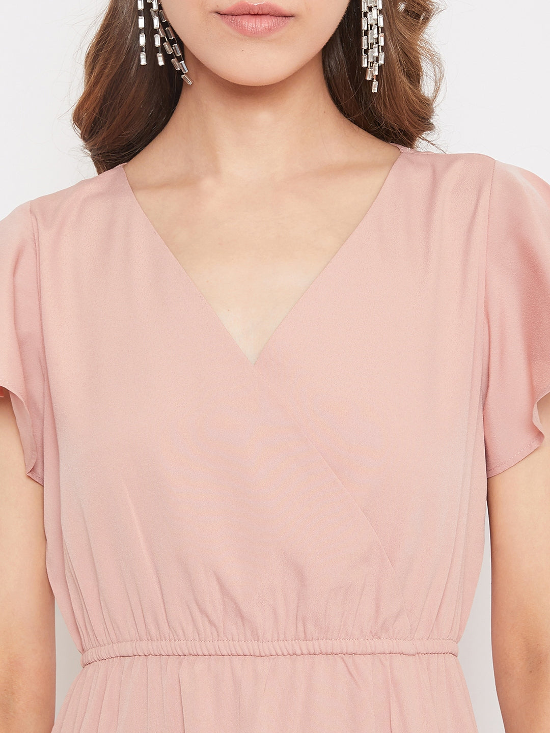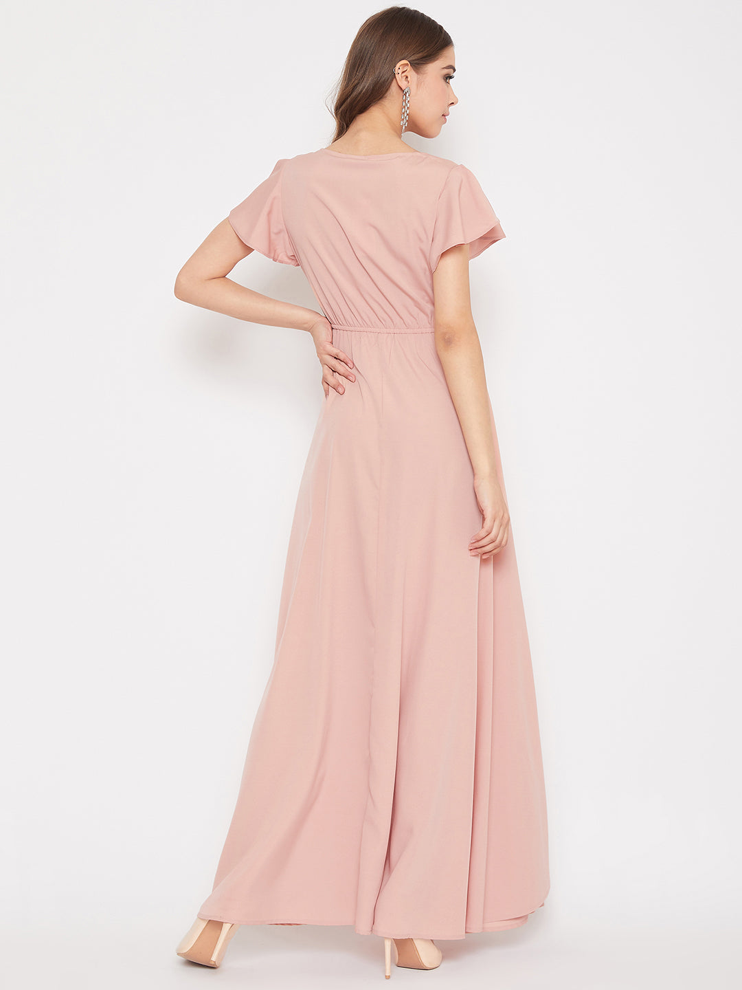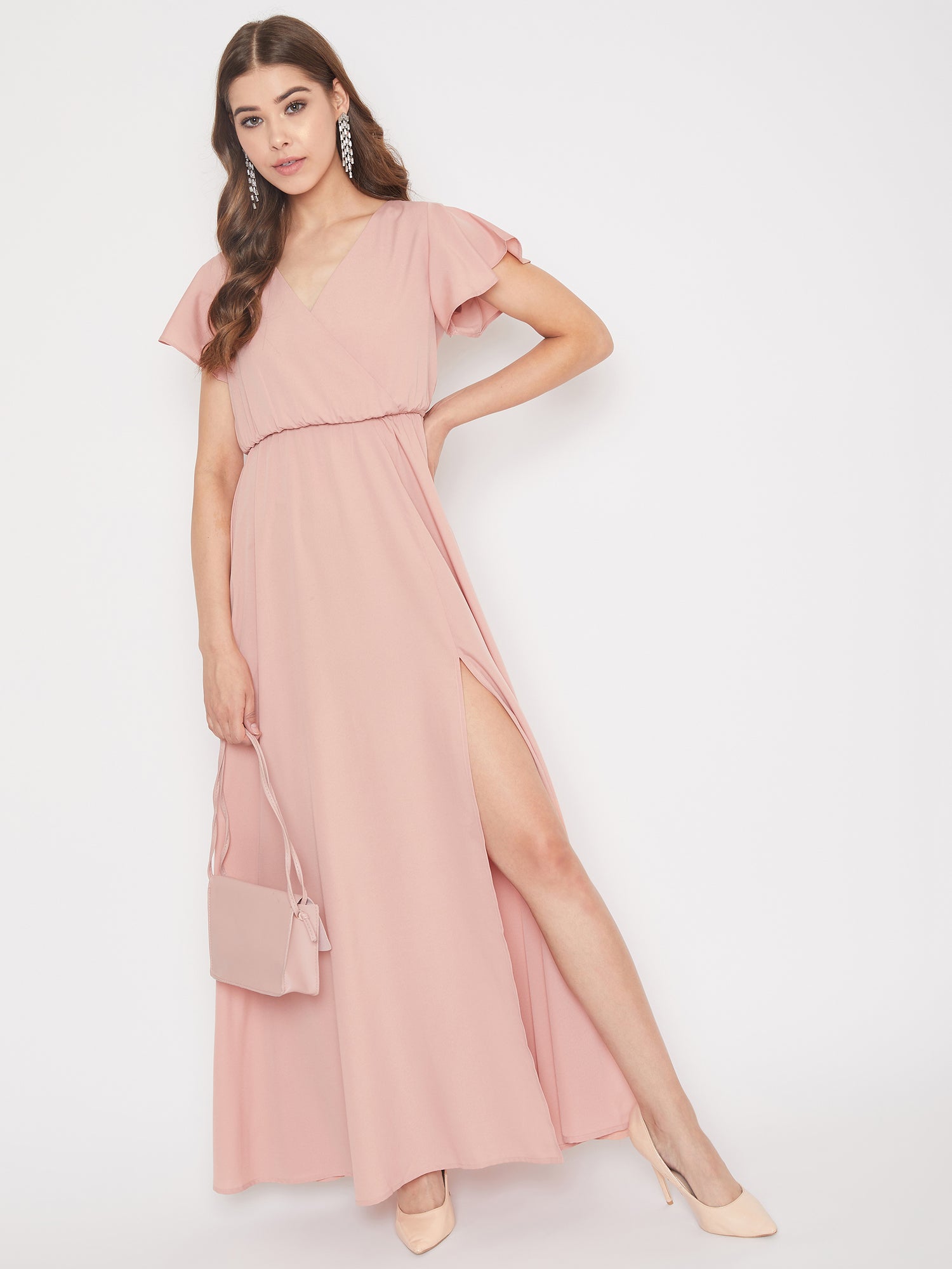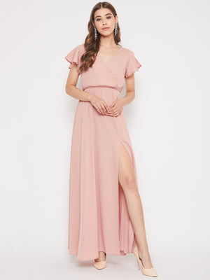 Berrylush Women Solid Pink V-Neck Thigh-High Slit Flared Maxi Dress