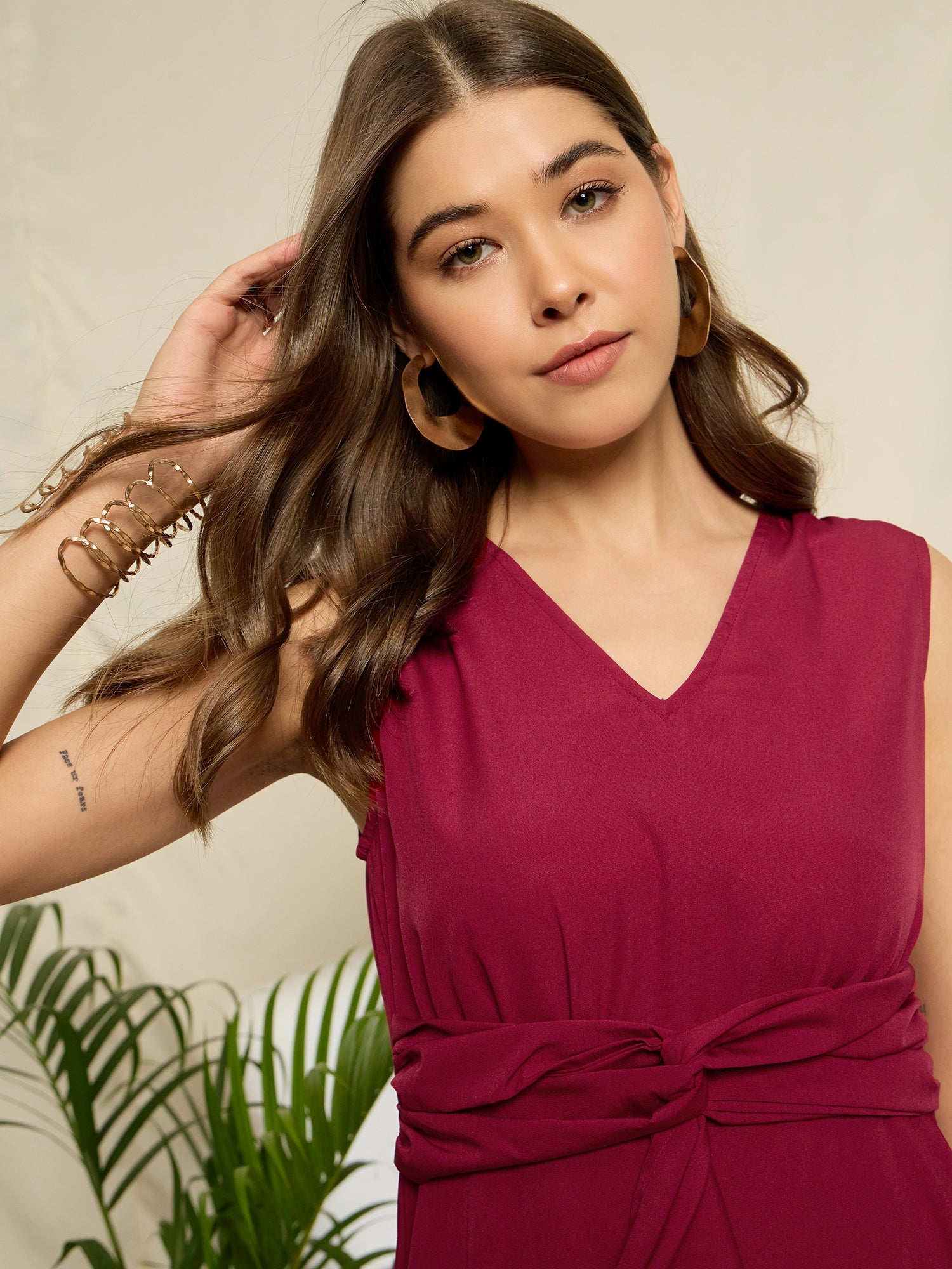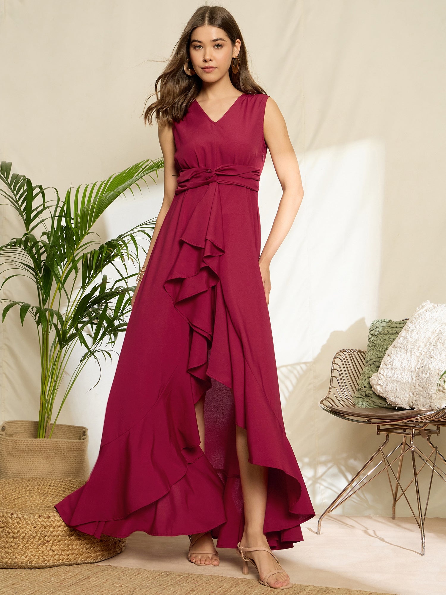 Berrylush Women Solid Red V-Neck Sleeveless High-Low Hem Ruffled A-Line Maxi Dress