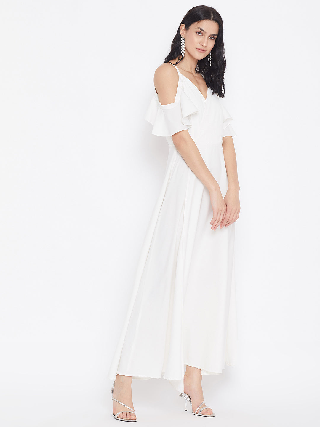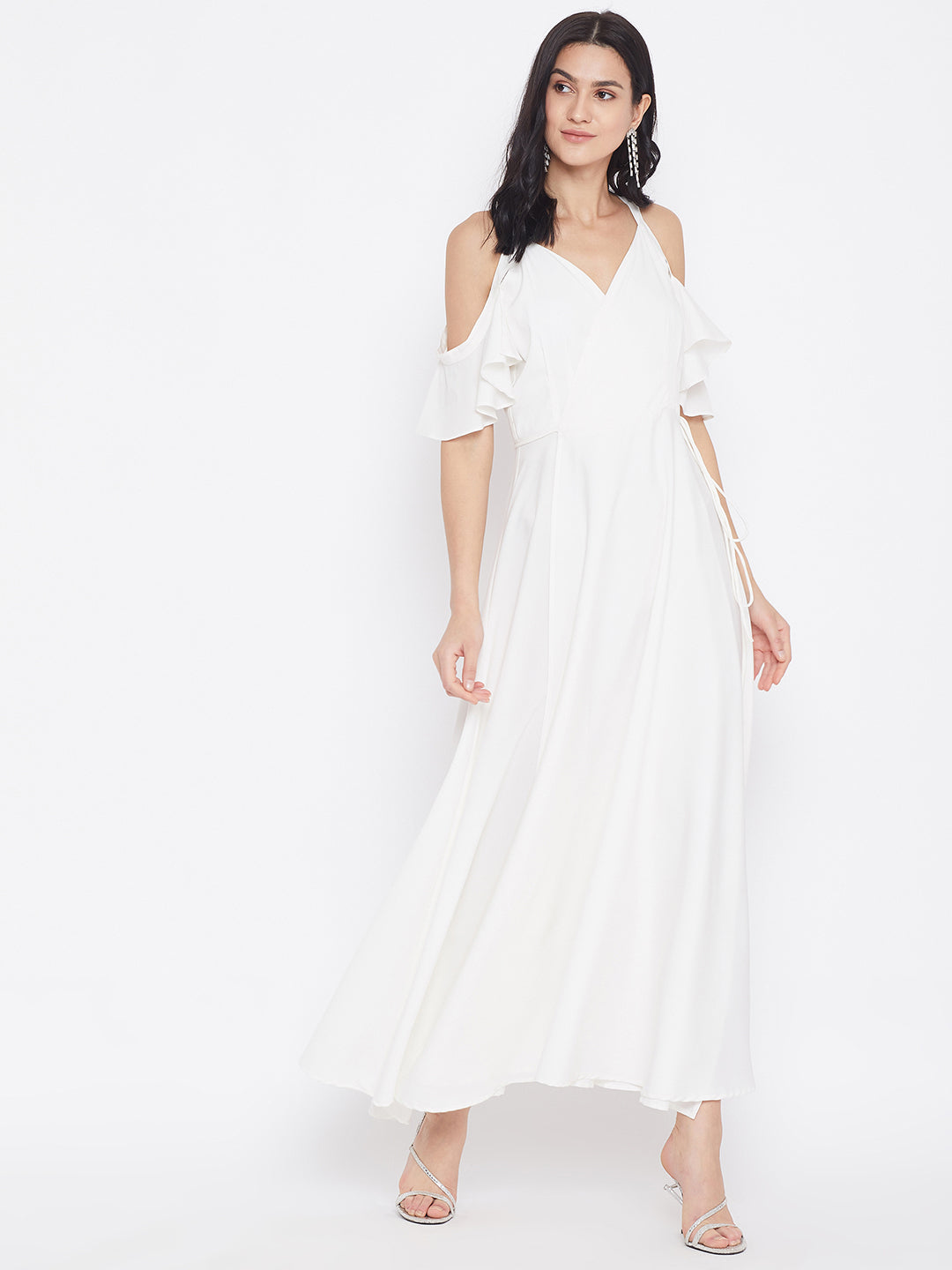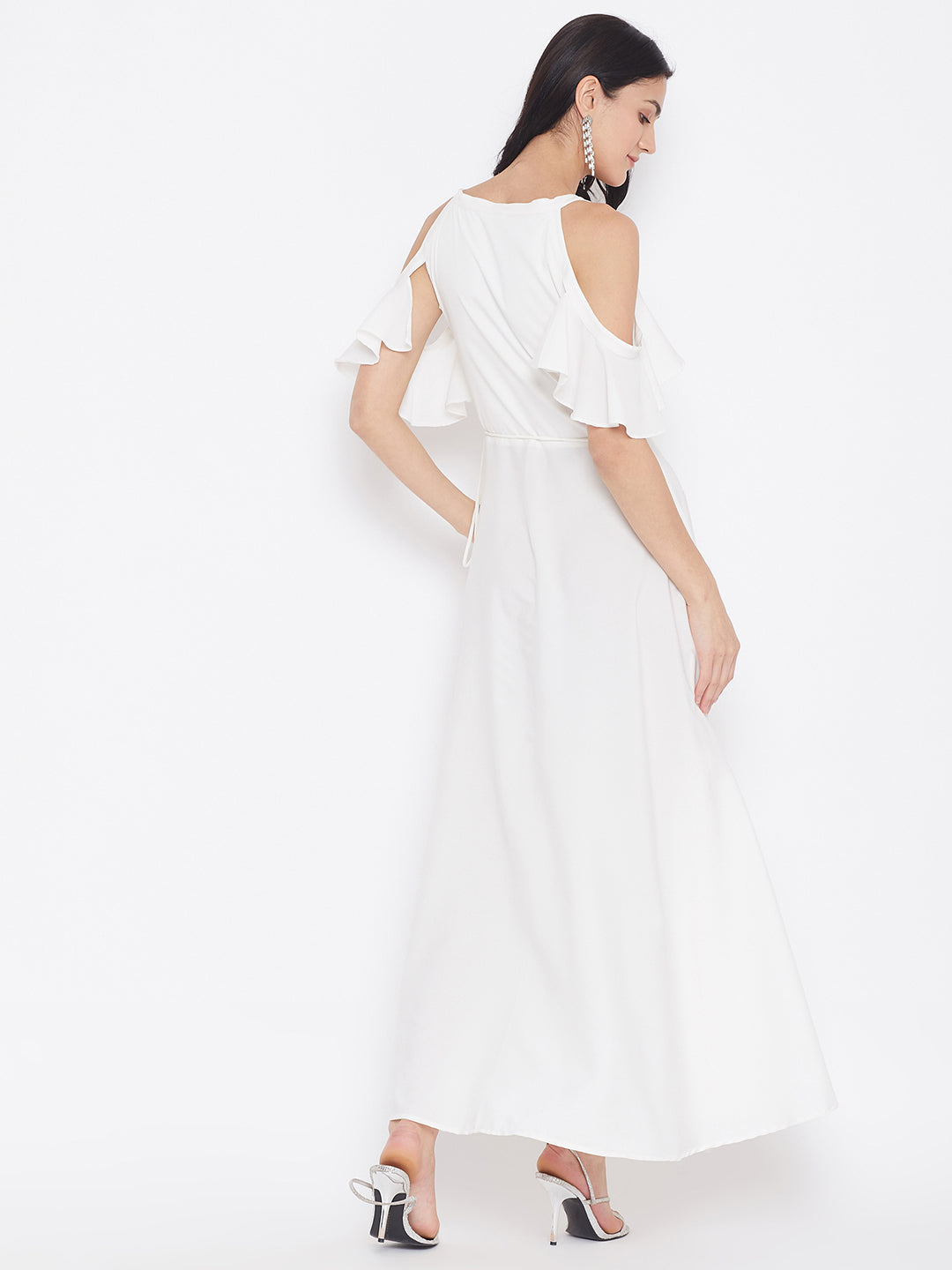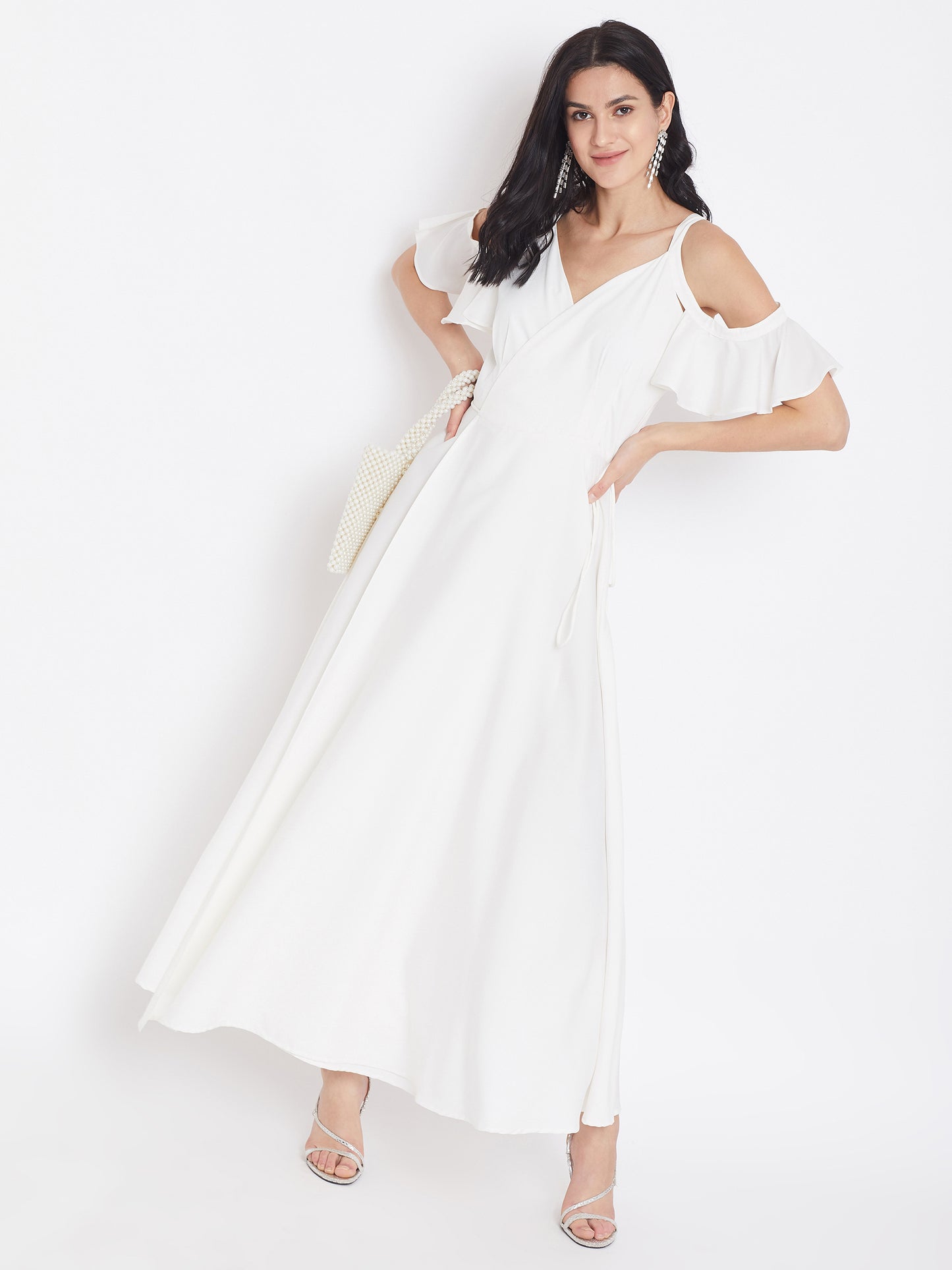 Berrylush Women Solid White V-Neck Cold-Shoulder Sleeve Tie-Up Crepe Flared Wrap Maxi Dress
