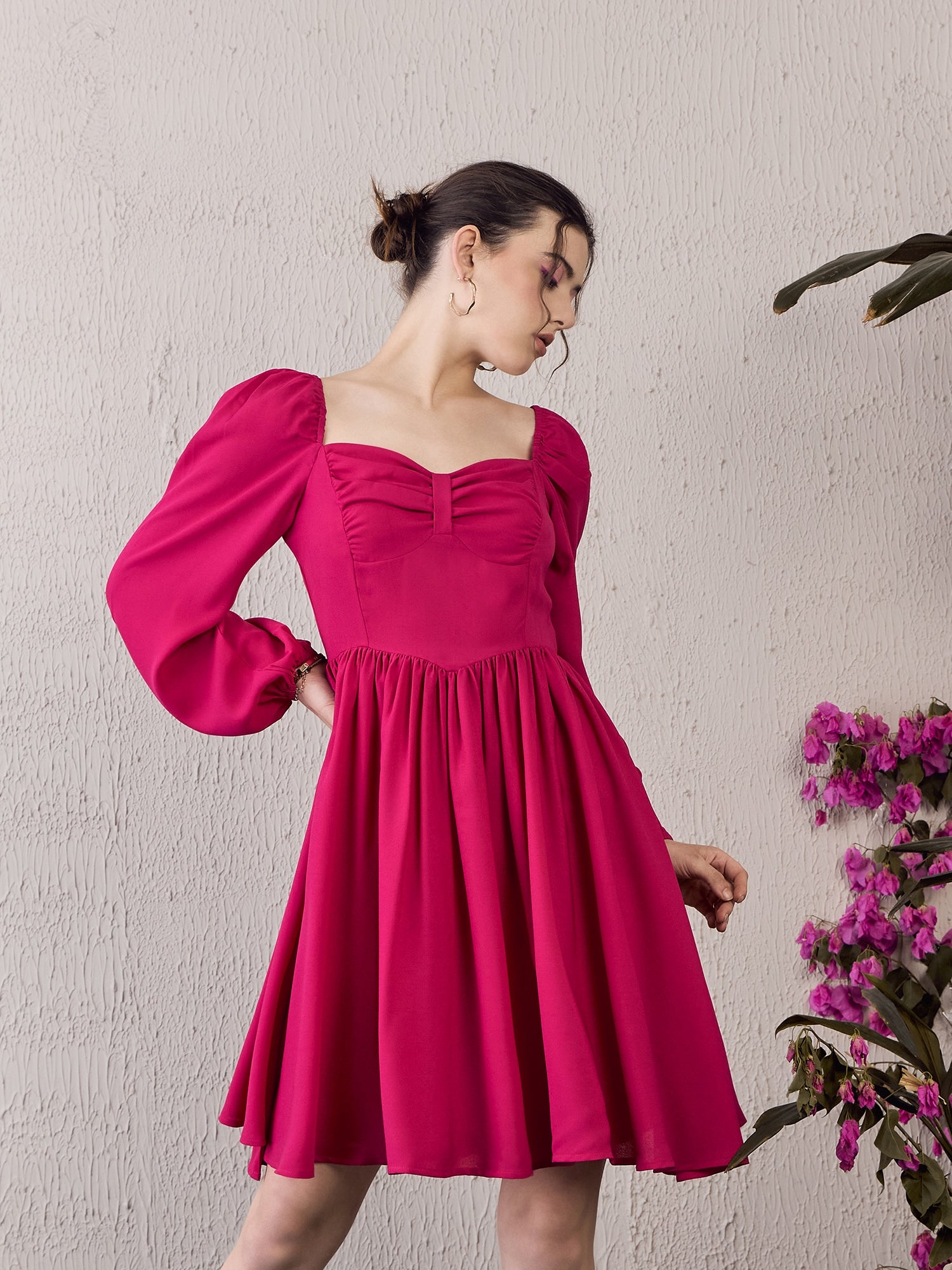 Introducing the charming Sweetheart Mini Dress by Berrylush, perfect for adding a splash of romance to your casual outings. This solid pink dress captivates with its delicate sweetheart neckline and enchanting long puff sleeves—feminine details that highlight a flirty vibe. Crafted from smooth polyester, the pleated bodice leads into a fit & flare skirt that playfully sways as you move, ending in a flirtatious flared hemline just above the knees. The concealed back zipper ensures an uninterrupted silhouette with total ease of wear while guaranteeing opaqueness wherever you go. Embrace your delightful side with this exquisite piece!