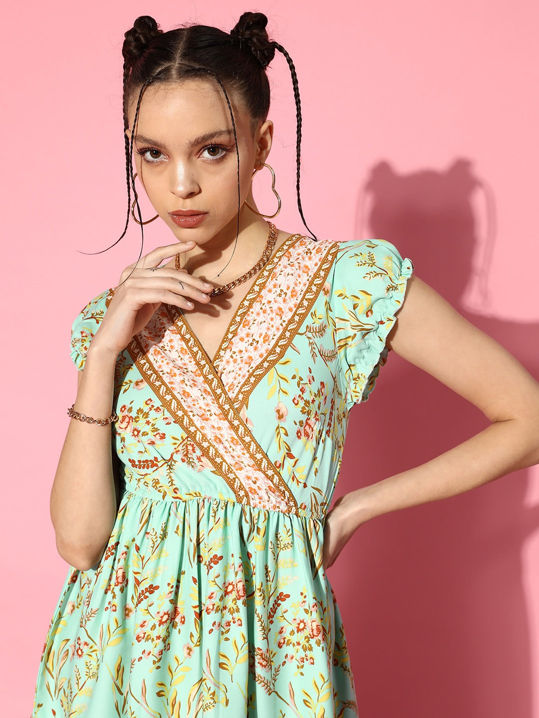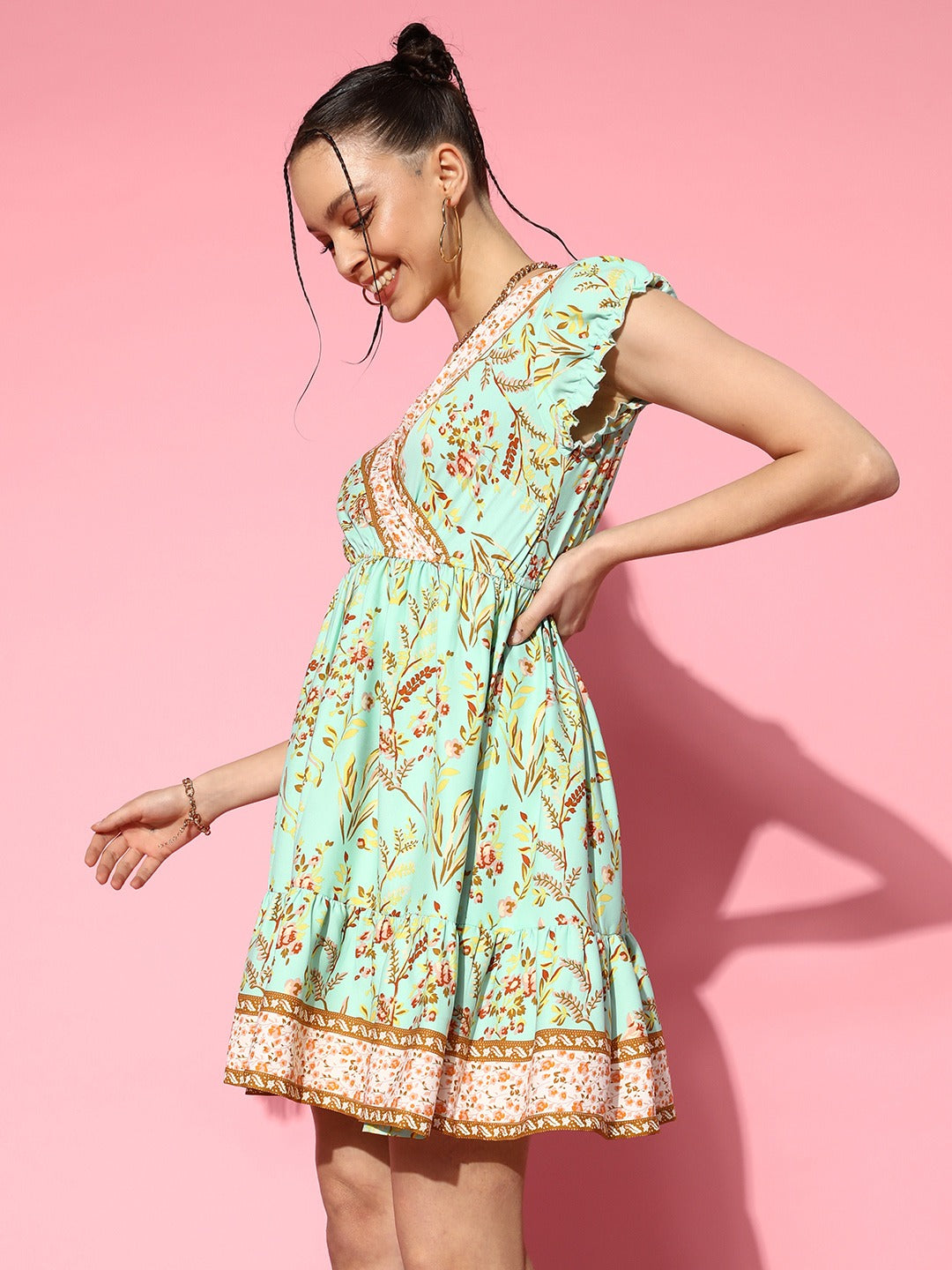 Berrylush Women Sea Green & Multicolour Floral Printed V-Neck Cap Sleeves Flared A-Line Mini Dress