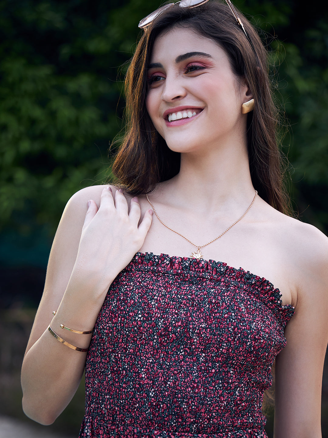Make a statement wherever you go, by wearing this cute Black & Red Floral Printed Strapless Neck Sleeveless Smocked A-Line Mini Dress from Berrylush. Adorned with a mesmerizing amalgam of black and red floral print that lends this dress a captivating appearance with a tinge of royalty vibe. Showcasing a flared hemline that enhances the overall volume of this dress with an astonishing vibe and a bouncy drape. Also, the woven weave improves the structural integrity and durability of this dress to withstand wear and tear issues. Wear this dress with a pair of matching pump heels, diamond earrings, and your favourite handbag for a stunning look to go on a movie date.