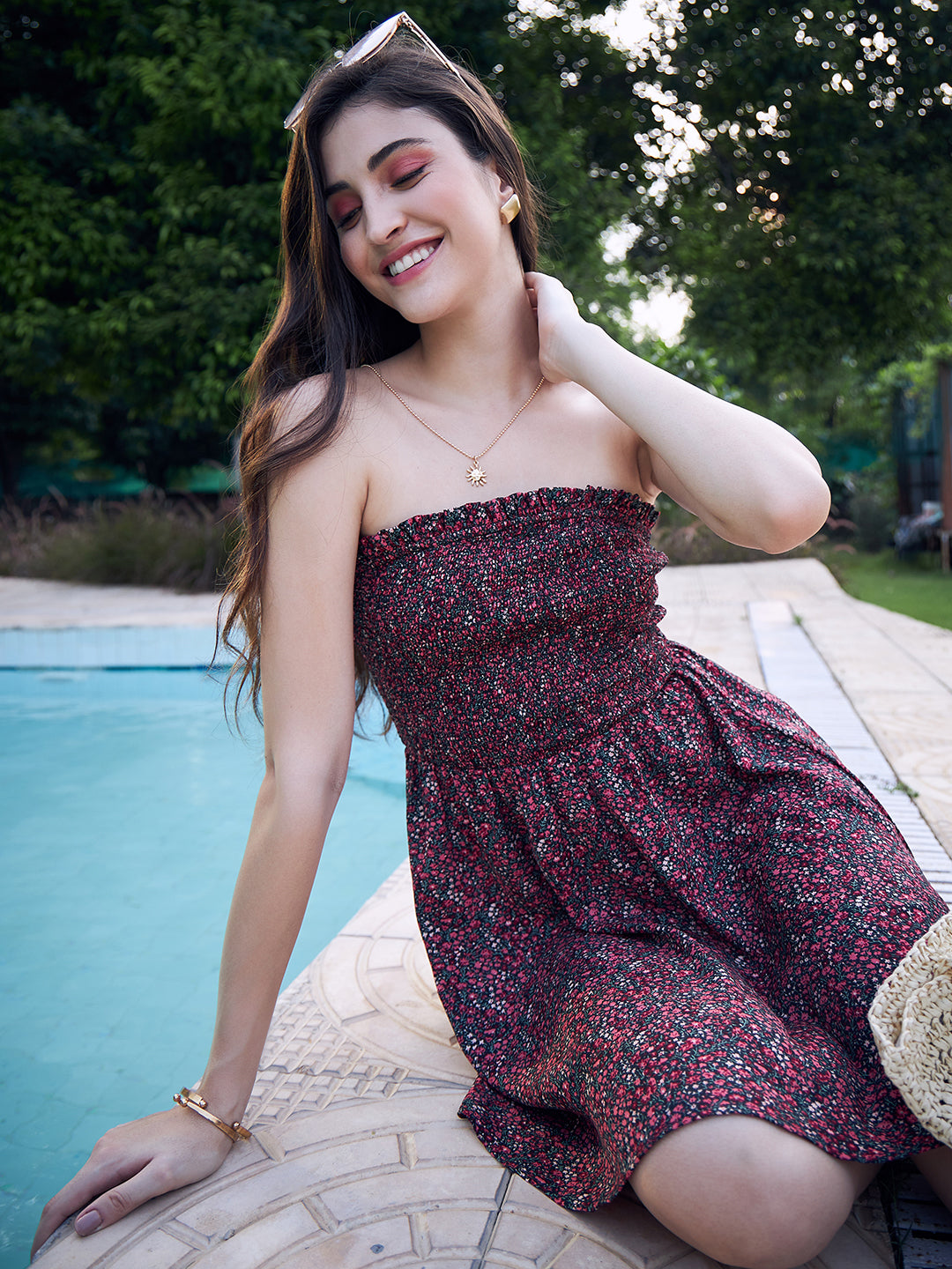 Berrylush Women Black & Red Floral Printed Strapless Neck Sleeveless Smocked A-Line Mini Dress