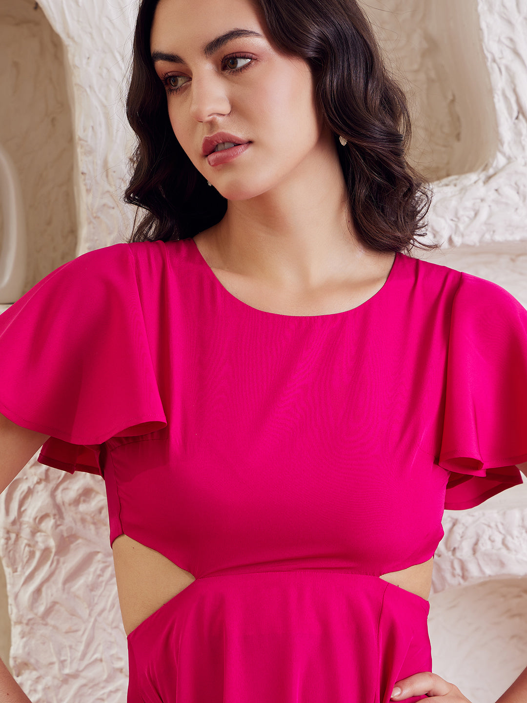 Keep your casual closet ready for seasonal change with versatile and voguish pieces just like this bedazzling Solid Pink Round Neck Cut-Out Crepe Thigh-High Slit Fit & Flare Maxi Dress from Berrylush. Adorned with a beautiful amalgam of pink shade and a solid pattern that gives this dress a charismatic appearance with a bold aura. Featuring short-flared sleeves to offer your arms proper and voluminous coverage with a hint of retro trend. Made from the finest quality polyester fabric that offers this dress lightweight and breathable creation to keep your body comfortable for a prolonged duration. Create a fashion-forward look by wearing this maxi dress with black block heels, floral stud earrings, and a cute side bag.