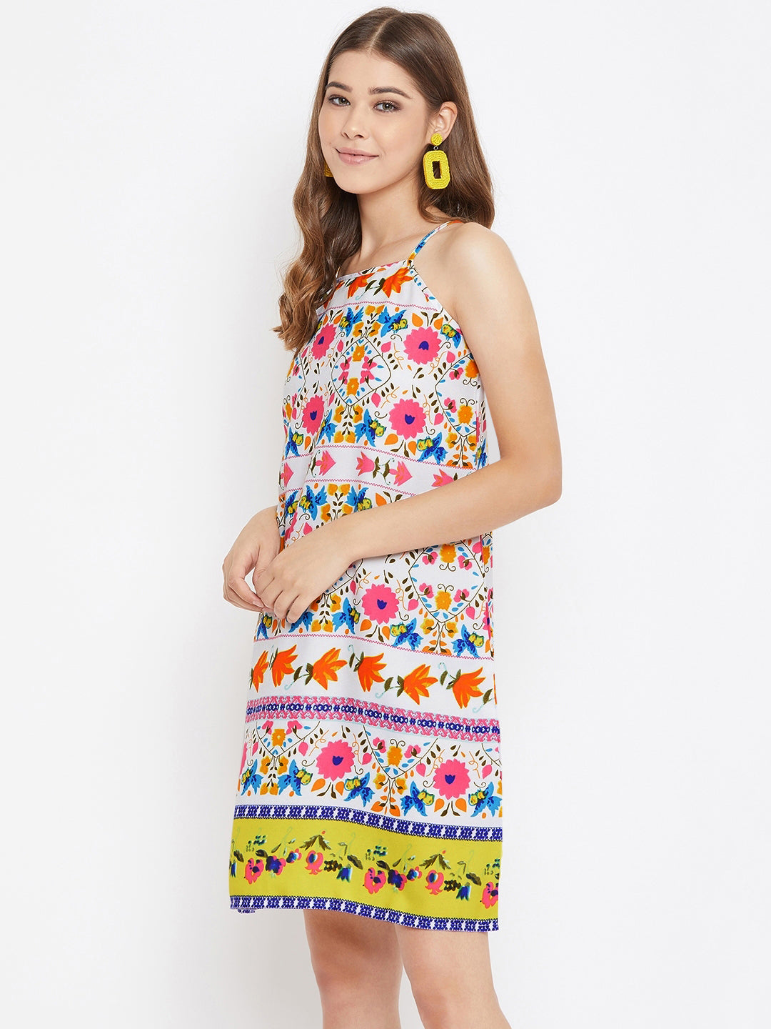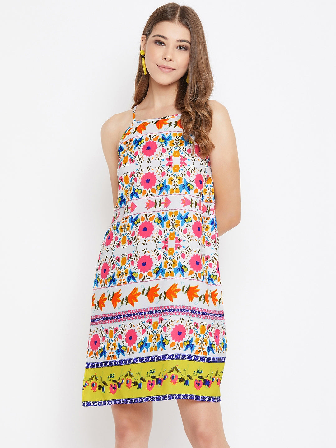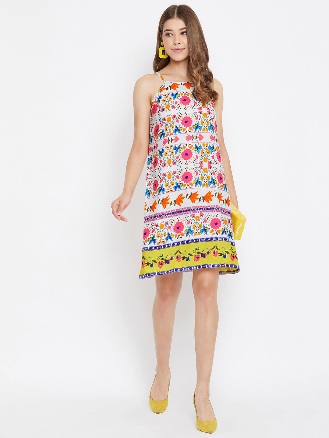 Create an attractive look by wearing this mesmerising Multicoloured Floral Printed Halter Neck A-Line Mini Dress from Berrylush. The allover multicoloured floral print adds a chic flair to this dress and with the sleeveless design, your arms stay ventilated and stylish all day long. The halter neck adds up more voguish punch to your neckline and shoulders. The regular fit design makes this mini dress apt for your casual makeover. The white shade keeps you cool and relaxed amidst the summer days and the back comes with a smart keyhole that enhances the beauty of your back part in a fancy way. Match this mini dress with matching high heels and a tote bag to complete your overall look. Decorate your summer look with high styled apparel from Berrylush.