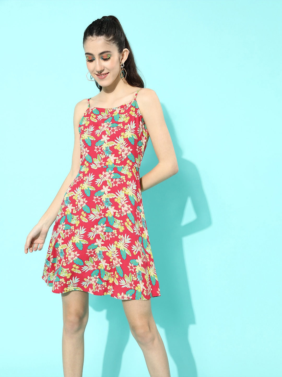 Berrylush Women Magenta Floral Printed Round-Neck Crepe A-Line Mini Dress