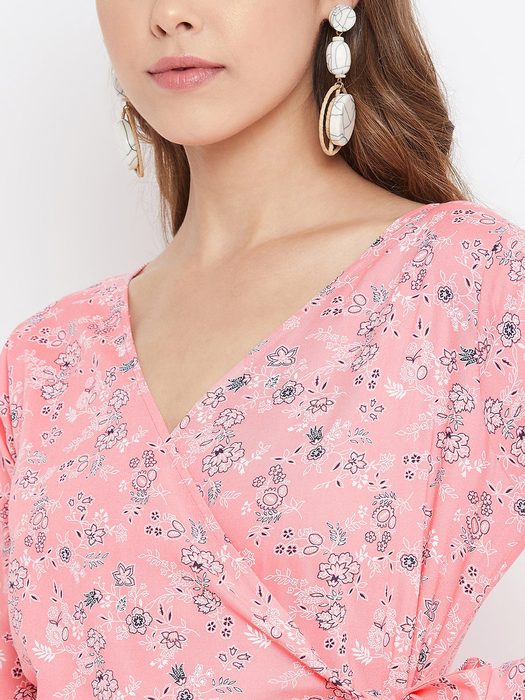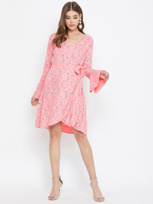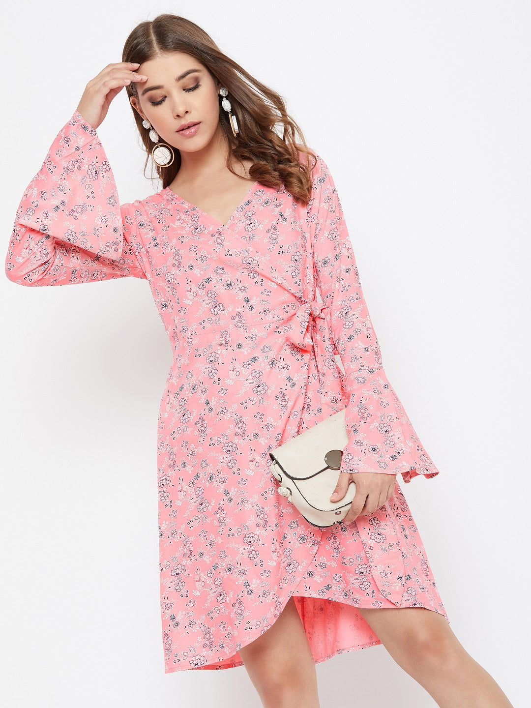 Berrylush Women Pink Floral Printed V-Neck Tulip Hem Wrap Fit & Flare Mini Dress