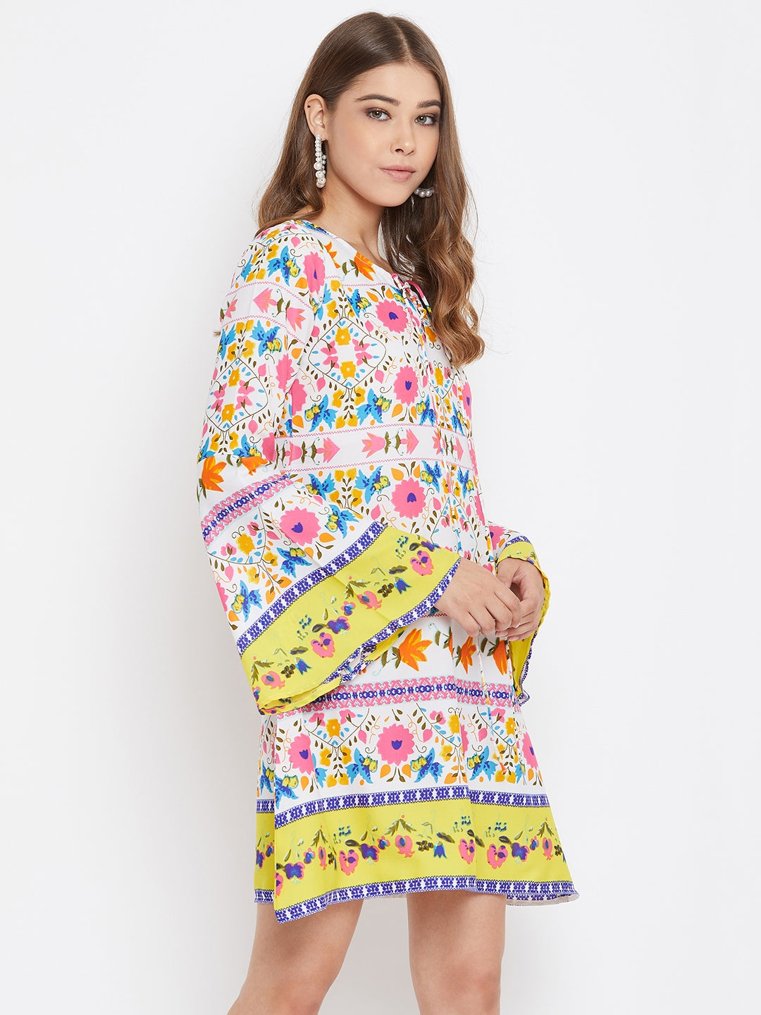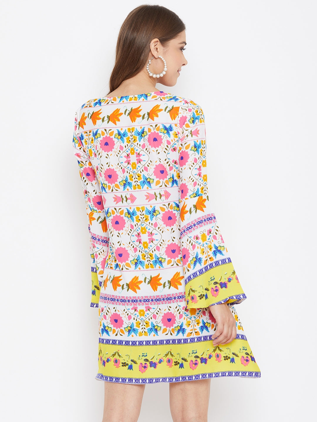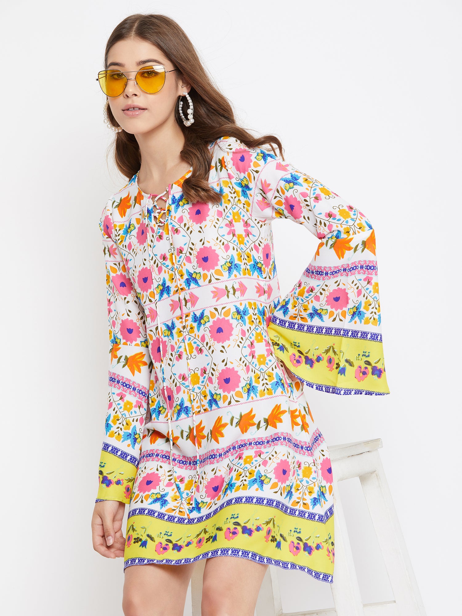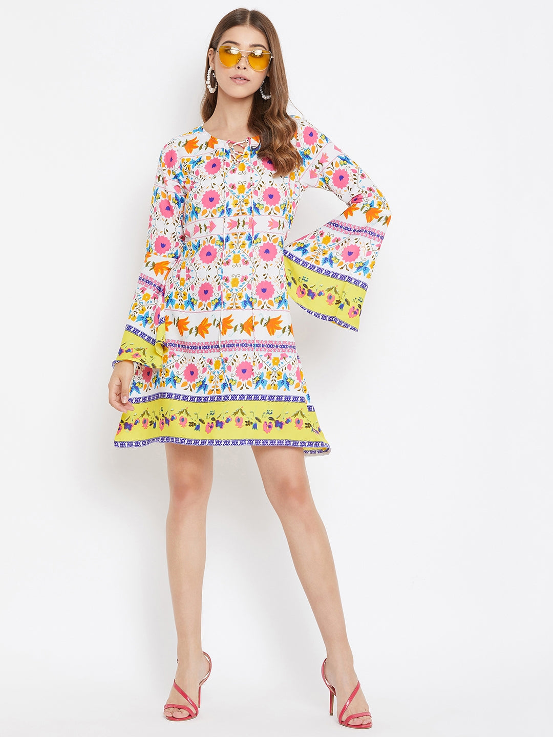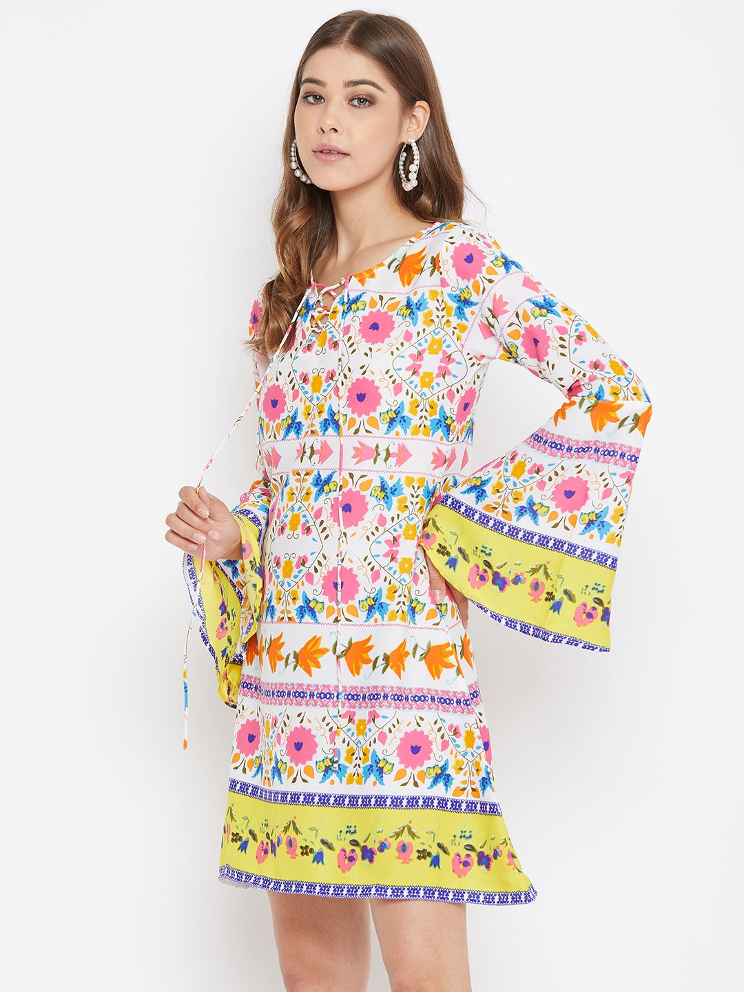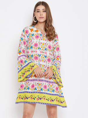 Berrylush White Floral Printed A-Line Mini Dress speaks of an extraordinary journey that starts with a gleeful boho charm. White decorative retro floral motif with a chic lace tie neckline fills a joyous punch to this modish outlook. To give a dramatic feel to this enchanting attire, the retro floral motif has been matched with long bell sleeves that further produce airy flexibility. This spring stride with the designer's favorite A-line silhouette gives your outline a taller & slimmer approach. Bring back the 60's retro spice by matching this fascinating floral outfit with gladiator pumps, a wide headscarf, and a dramatic round sunglass. Bring a butterfly-like mural into your wardrobe from Berrylush.