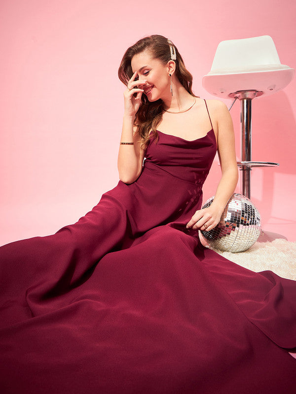 Berrylush Women Solid Maroon Cowl Neck Sleeveless Lace-Up Backless Thigh-High Slit Flared Maxi Dress