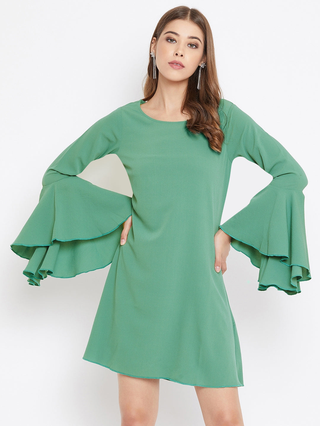 Feel free to call for a gleaming spark in your casual look with this Solid Mint Green Flutter Sleeves A-Line Mini Dress from Berrylush. The lush mint green freshness that comes out from this dress is going to give unfading energy amidst the gloomy days of the monsoon. Flutter designed over the large sleeves fills cheerful vibes to your look. The regular cut of this mint green outfit beautifully creates a balance and saves this outfit from getting over-decorated. The round neckline on the other hand takes care of the element for an unbeatable voluptuous layout. Match this flirty outfit with white sneakers and a tiny denim sling bag and make this dress a designer piece by wearing it from Berrylush.