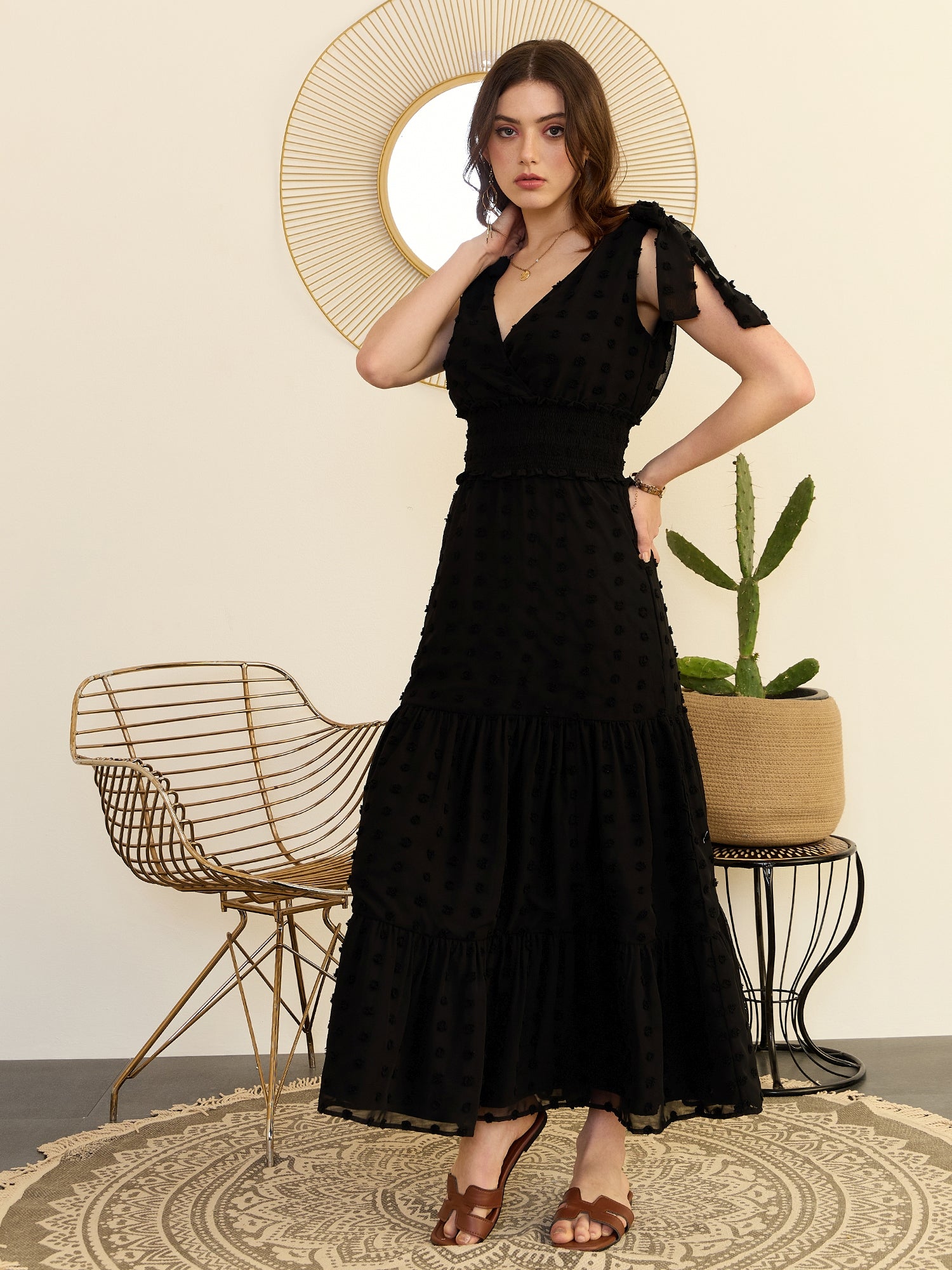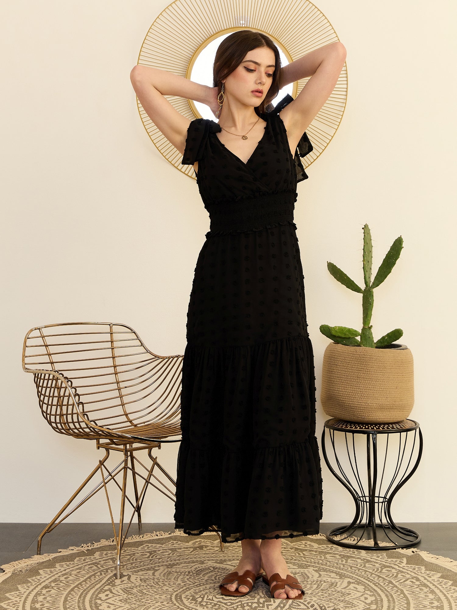 Berrylush Women Solid Black Dobby Weave V-Neck Sleeveless Tie-Up Straps Smocked Maxi Dress