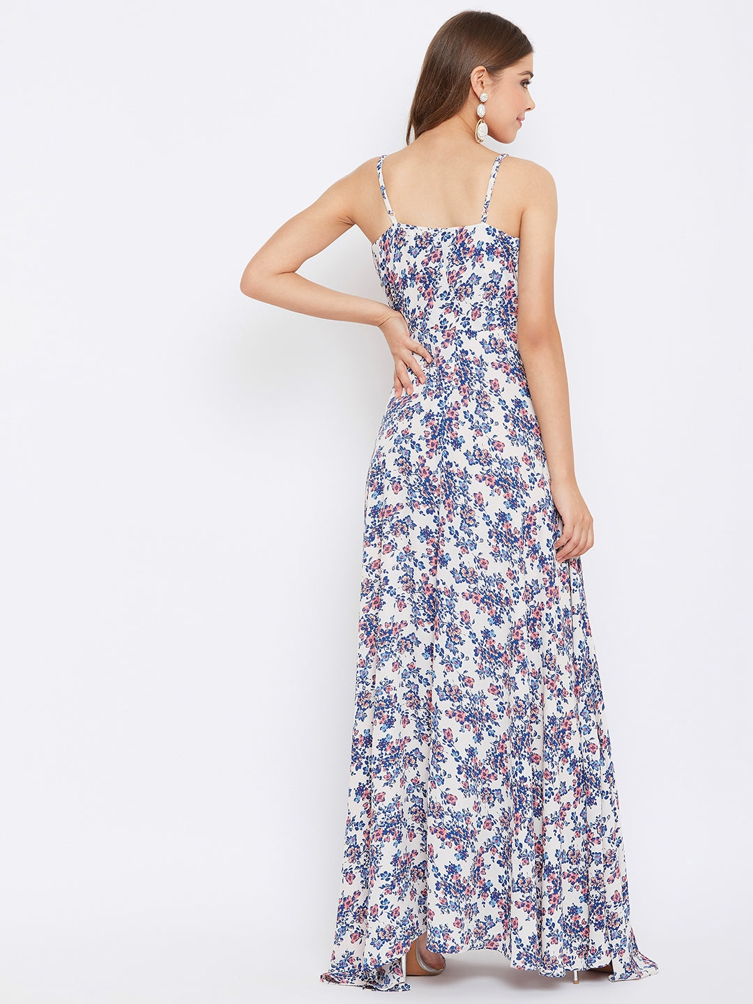 Add a fashionable vibe to your casual outing with this White Ditsy Floral Printed V-Neck Layered Maxi Dress from Berrylush. Engaging blue floral print over the solid white base colour is creating an icy cool sensation amidst the sultry summer days. The deep gorge V-neckline is making way for your chest to utter about its beautiful skin. The shoulder has got seamless strappy support which doesn't appear at the front part but does its job flawlessly. The sheathe silhouette naturally glorifies your beautiful outline of the figure and fills more confidence to carry this dress throughout the day. Match this super vibrant ditsy floral print maxi dress with stilettos and bring the icy chilling ambience with the hands of Berrylush.