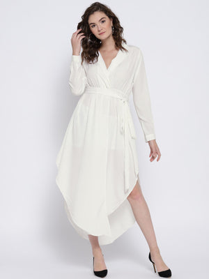 Inject a classy and free-spirited style into your casual wear collection with this captivating Solid White Shirt Collar Neck Waist Tie-Up Empire Midi Dress from Berrylush. This dress is designed with wrap styling to give an alluring shape and structure to your natural curve while illustrating an hourglass figure. The shirt collar neck and long cuffed sleeves of the dress assemble a semi-formal appearance with a refined sheen. Fashioned with asymmetrical hemline and midi length to give a proportionate and smart structure to the lower half of the dress. Wear this charming wrap dress with your favourite pair of high-heels, minimalistic jewellery, and a side bag to create a fashion statement look.