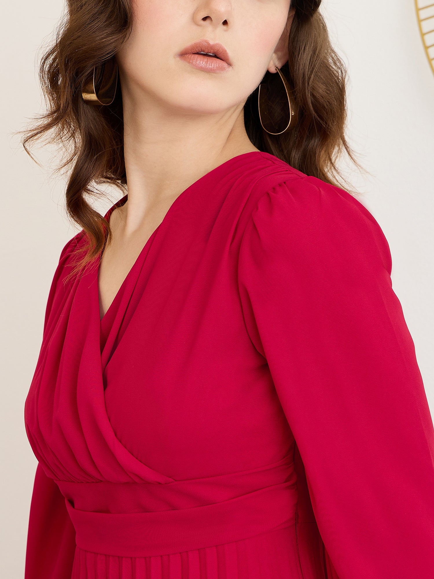 Berrylush Women Solid Red V-Neck Puff Sleeves Pleated Empire Maxi Dress