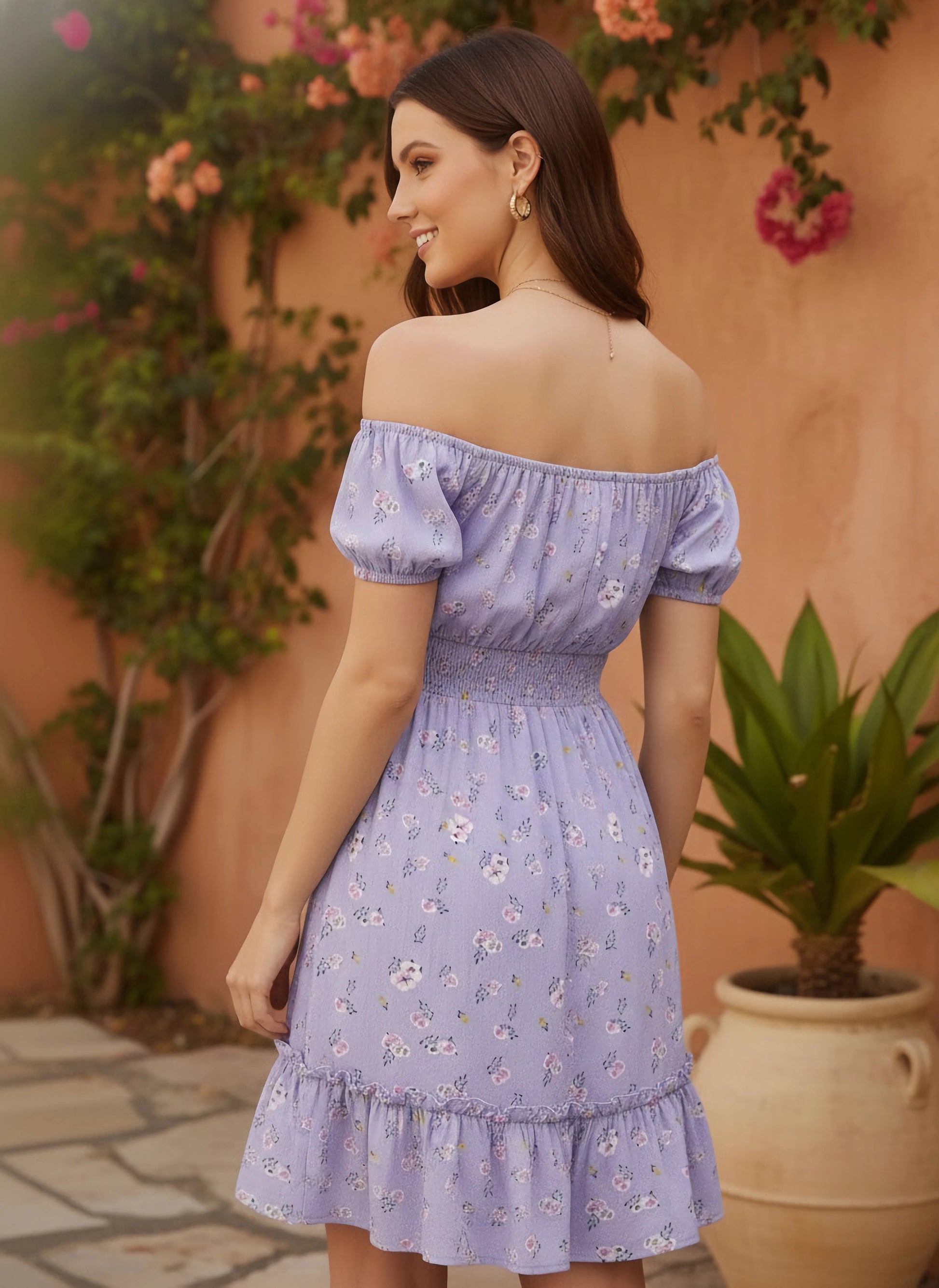 Introducing the enchanting Purple & White Floral Printed Dress from Berrylush, a whimsical addition to your casual wardrobe. Crafted with lightweight polyester fabric, this dress is designed to keep you comfortable while exuding effortless style. The off-shoulder neckline and short puff sleeves add a touch of romance, while the tie-up closure ensures a perfect fit. Featuring a vibrant floral print set against a purple and white backdrop, this dress brings nature's beauty right into your outfit. With its pleated surface styling and flared hemline creating graceful movement, the fit & flare silhouette highlights your figure beautifully in its mini-length cut. Perfect for brunches or weekend outings, let this opaque piece with woven weave texture be your go-to for an instantly put-together look that feels as delightful as it looks!