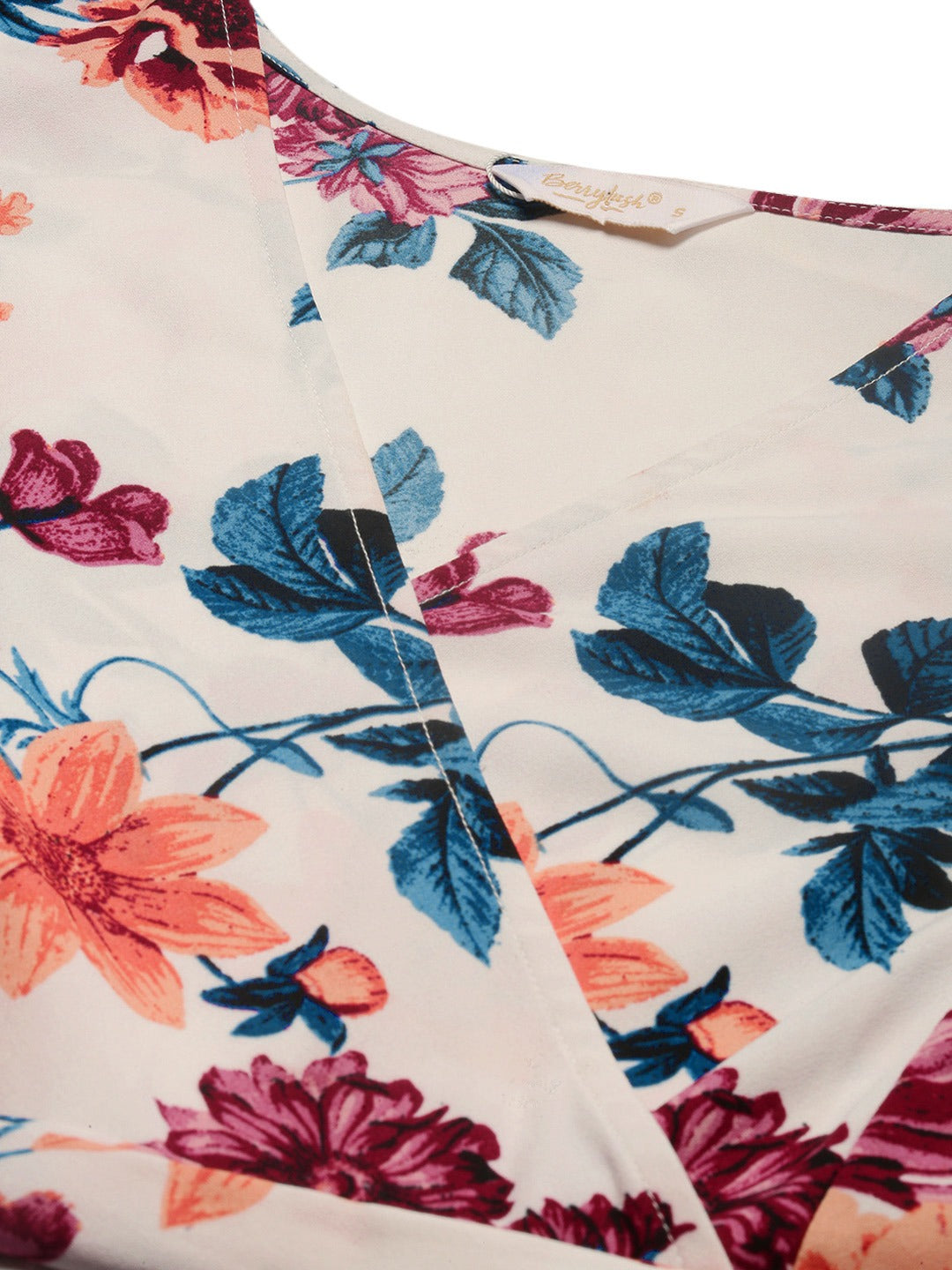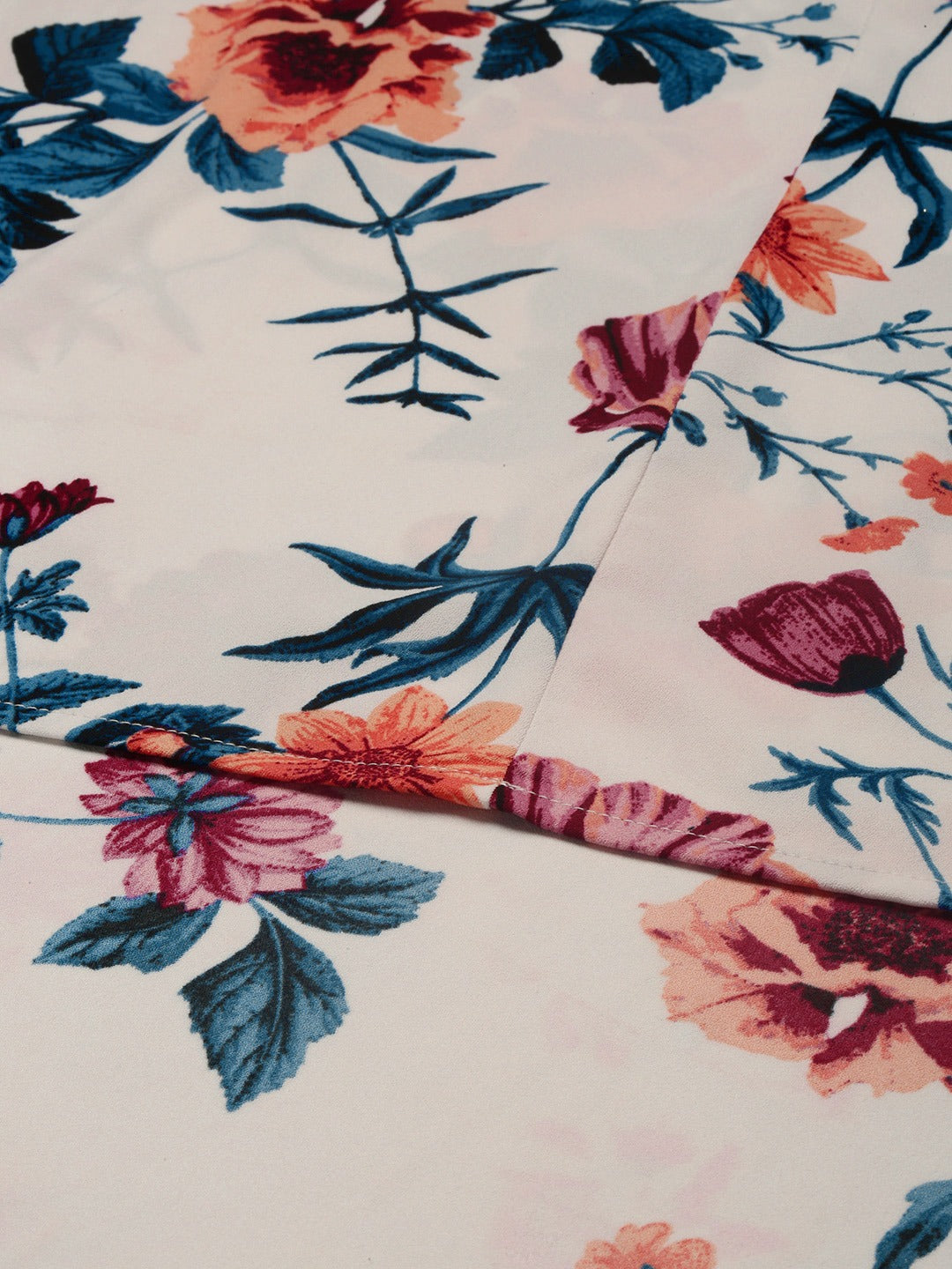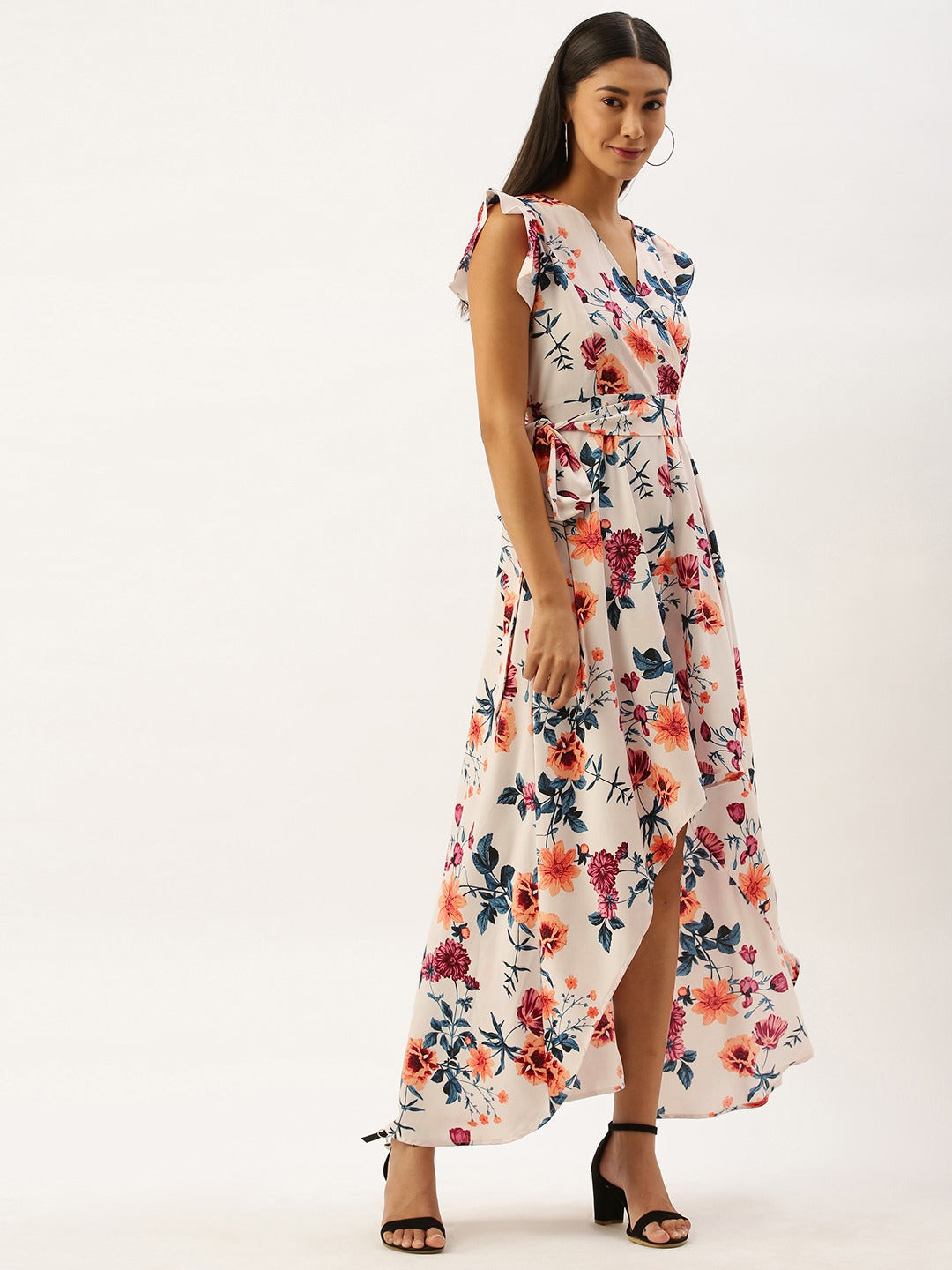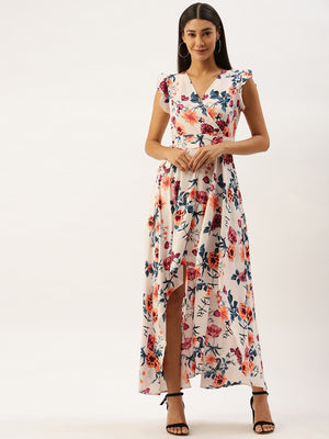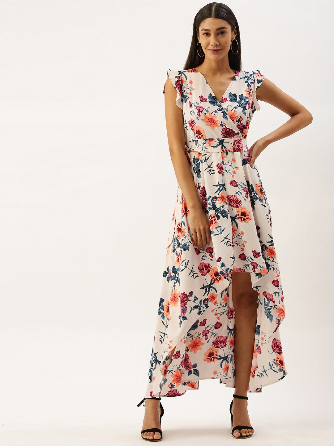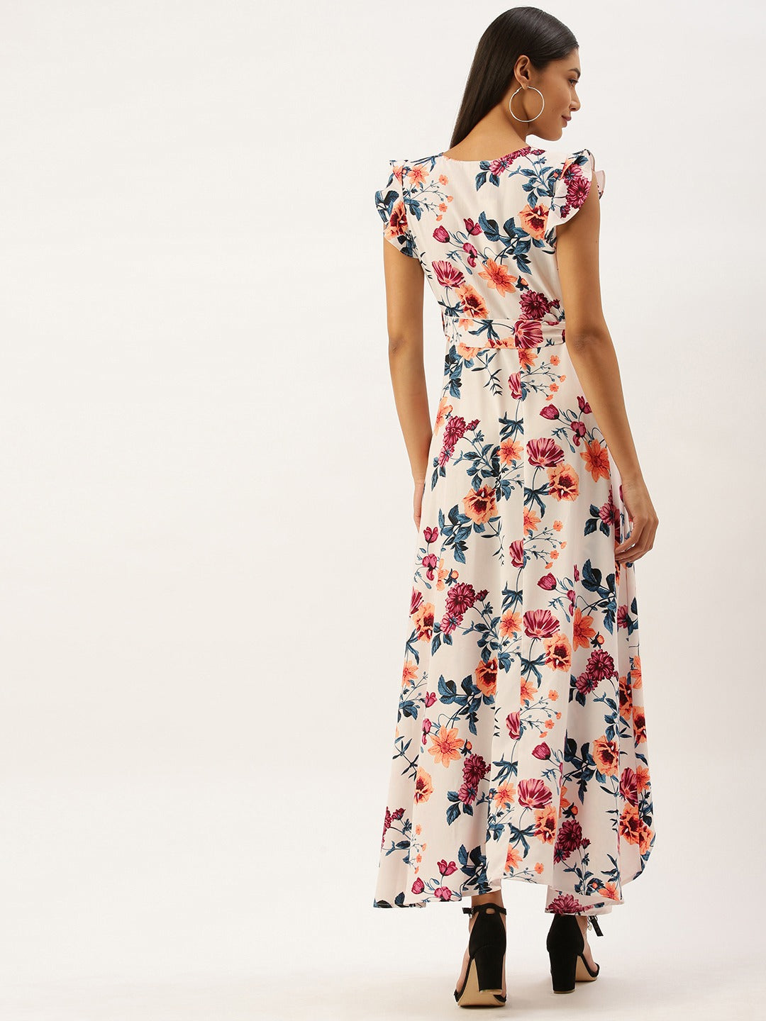 Begin a new chapter of charm by embracing Berrylush White Floral Print High Low Maxi Dress. Fill an energetic vibe to your summer trips and taste the flowery essence weaved into the fine asymmetrical hemline of this dress. Either you are planning for a grand beanfeast or confused about the apt dress for a babelicious beach fun this dress goes excellent. Moreover, with a fascinating ruffle shoulder highlighting your arms your outline gets perfect height and your overall look becomes slimmer. A fancy A-line silhouette with a V-shaped neckline makes this outfit more stylish that states your intense beauty. Pair up this maxi dress with stilettos and a maroon velvet sling bag. Experience summer's trendiest while outfitting from Berrylush.