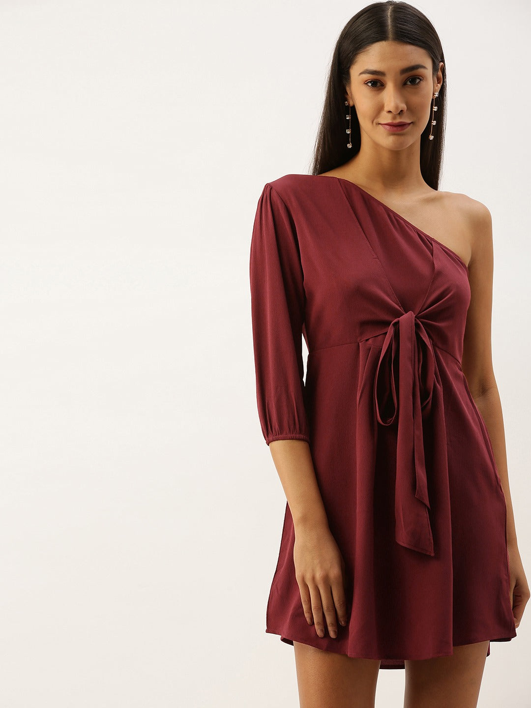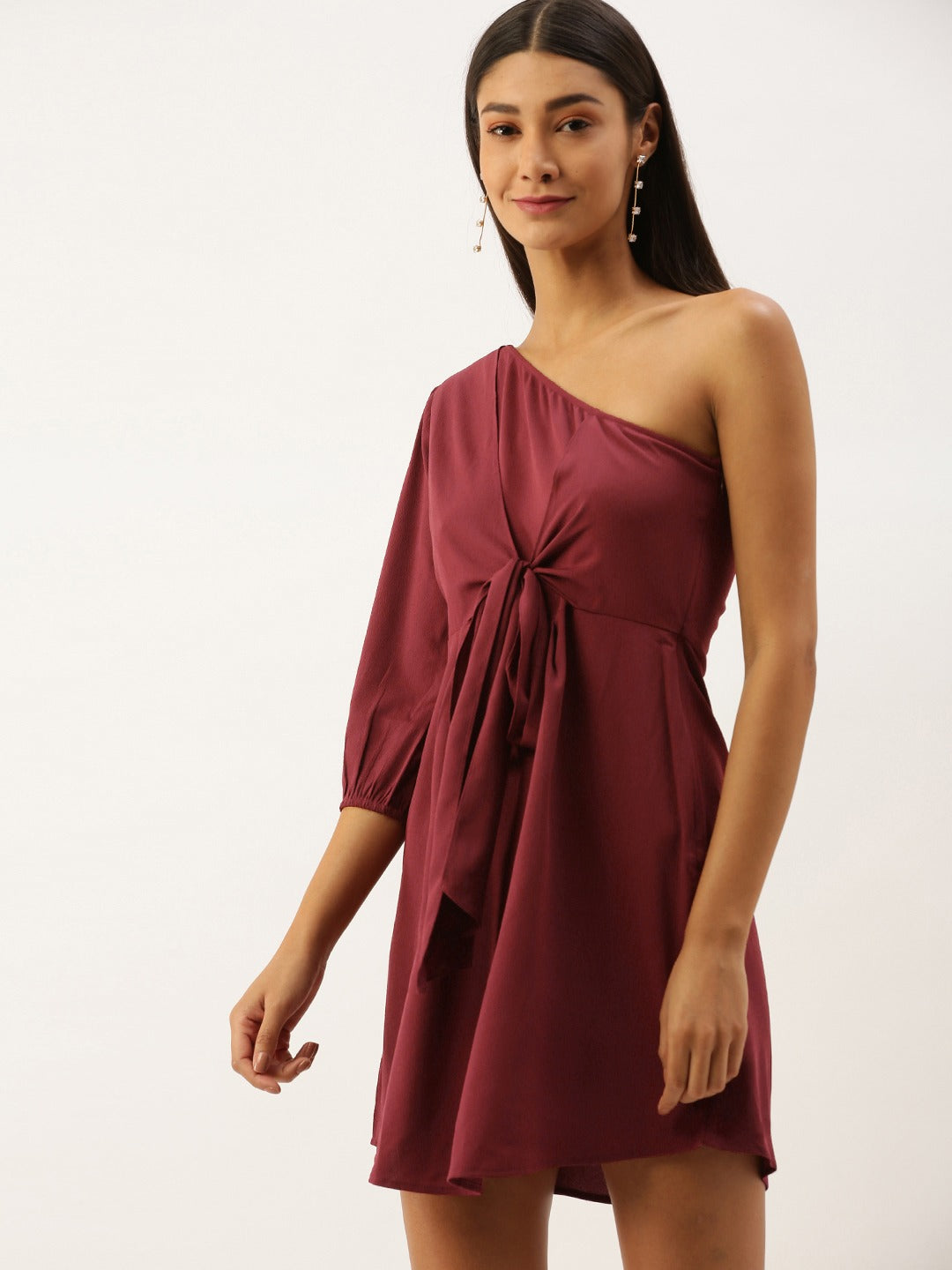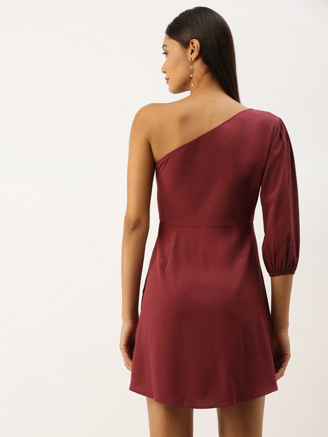 Make a statement with this Berrylush Solid Maroon One Shoulder Mini Dress. Tailored with polyester fabric, this dress feels soft against the skin to let you stay at ease round the clock. This stylish mini dress is designed with a one-shoulder neckline and a three-quarter puff sleeve to create a chic appearance. Tie-up closure at the waist with frills and pleats at the flared hem add charm to your look. The mini dress is crafted in an A-line silhouette to accentuate your curves. Carry your favorite clutch and put on your strappy heels to complete your ensemble for the day or evening parties.