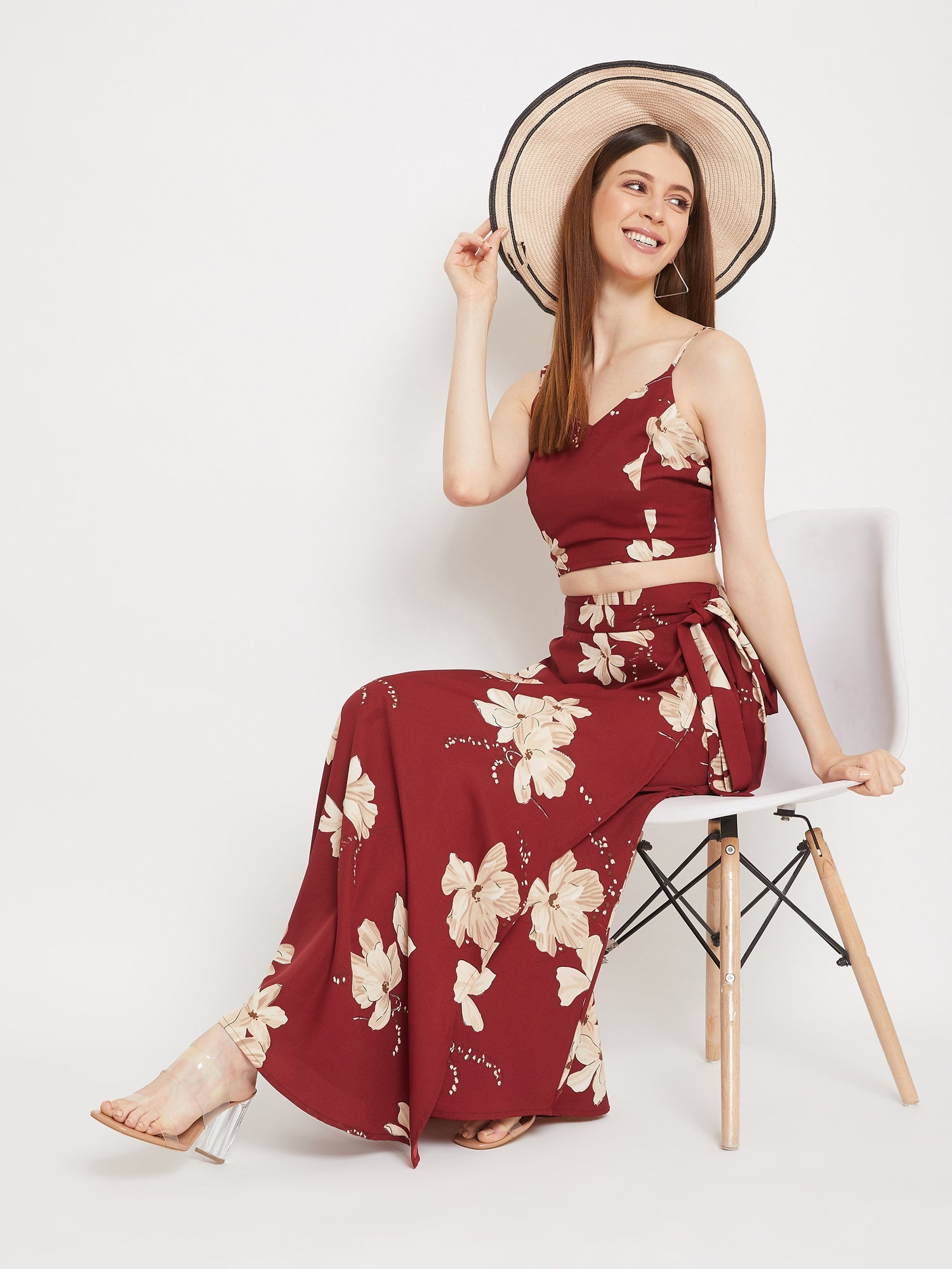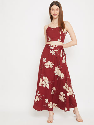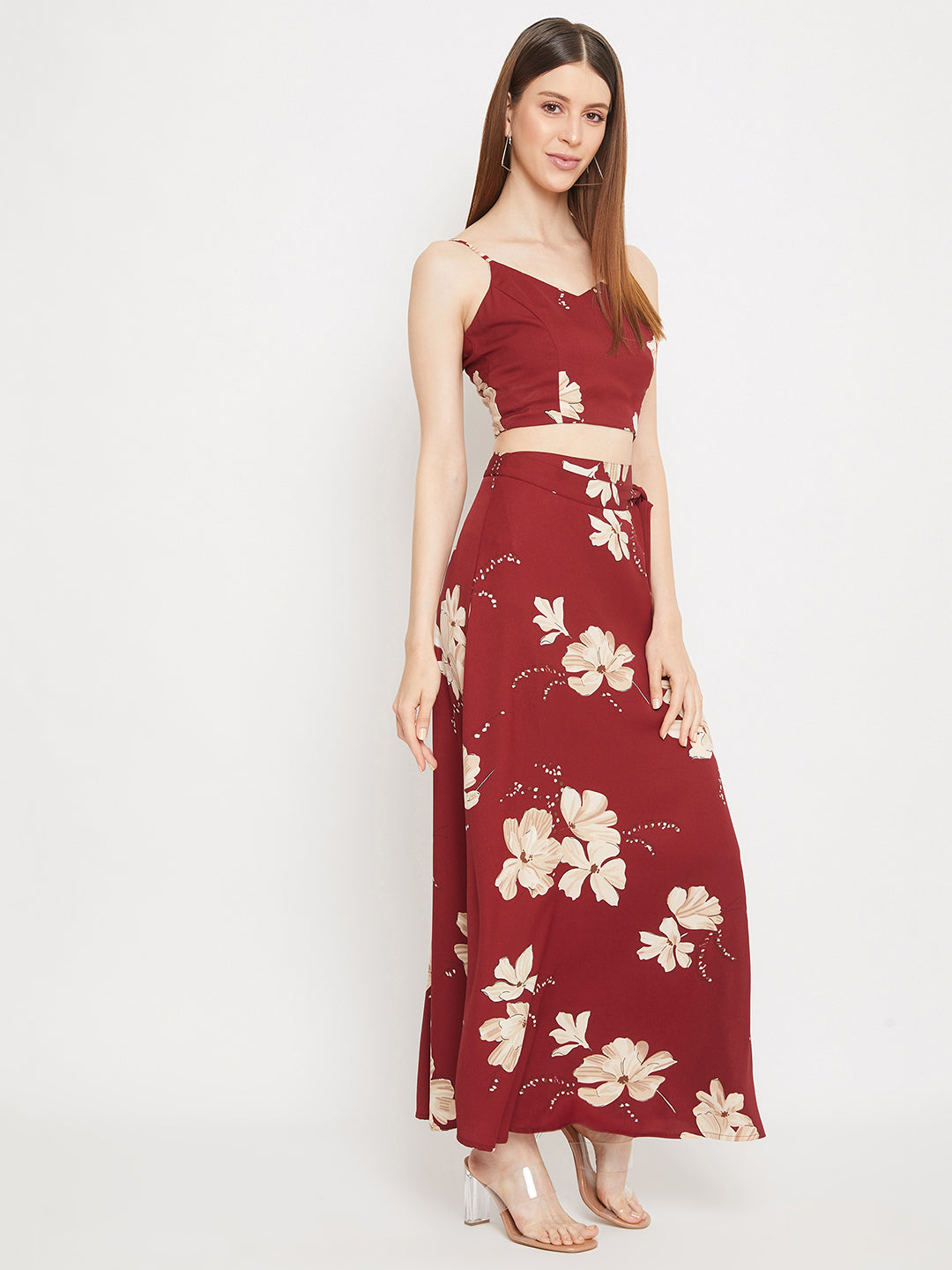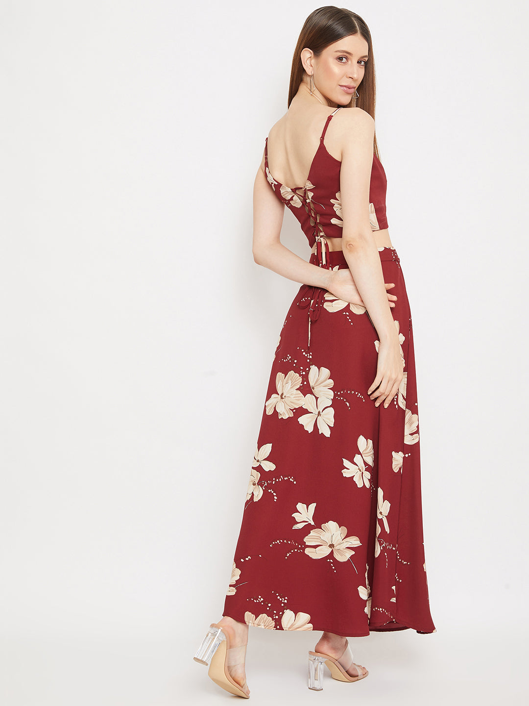 Berrylush Women Maroon Floral Printed Two-Piece Maxi Dress
