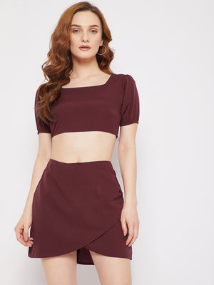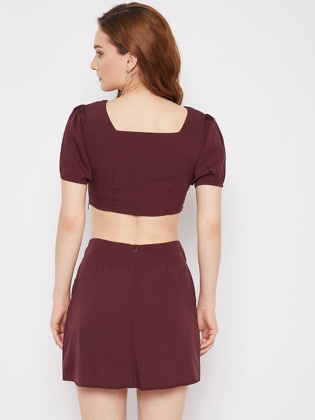 Berrylush Women Solid Maroon Square Neck Puff Sleeve Tulip Hem Co-Ordinate Mini Dress