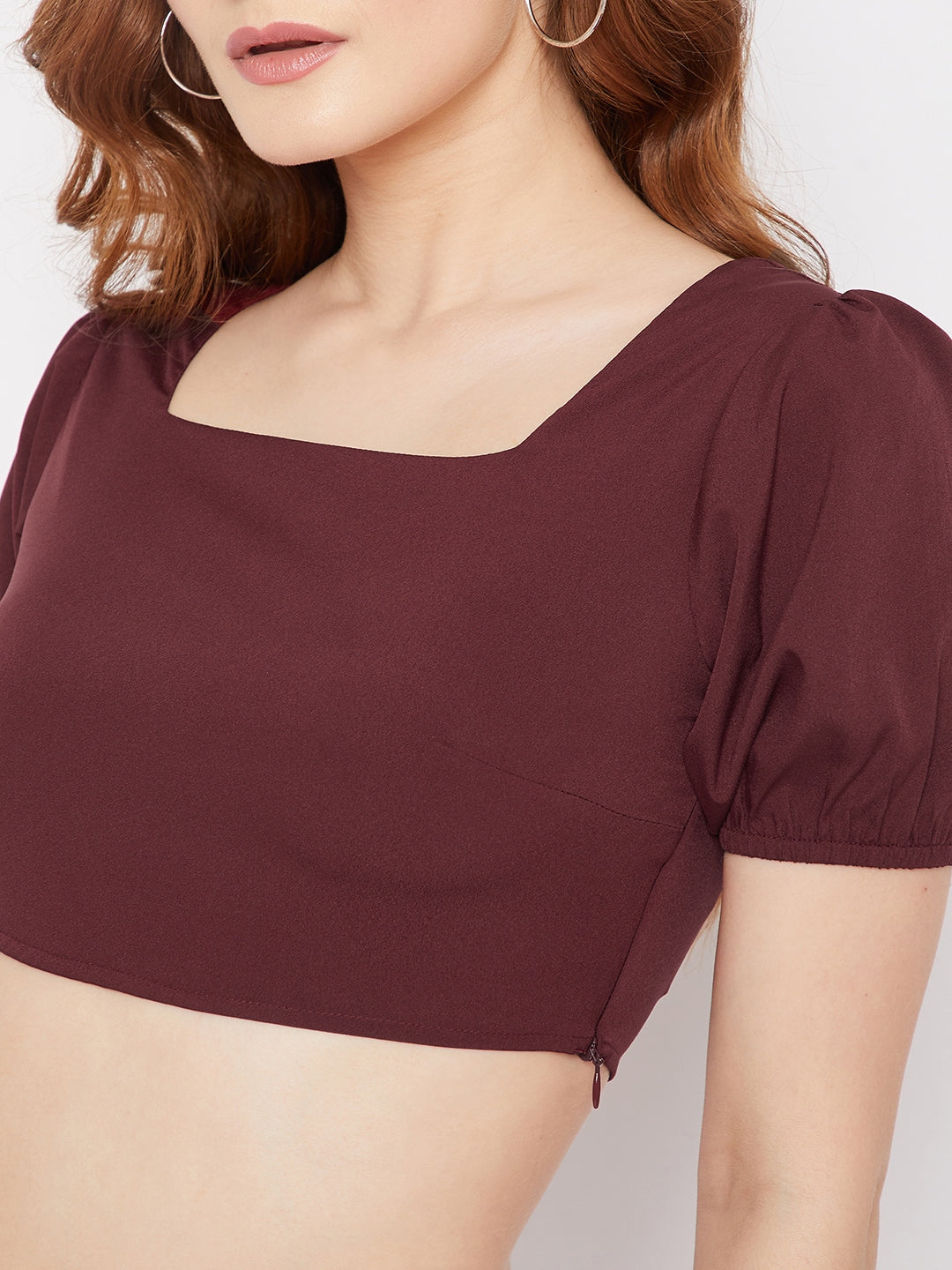 Polish up your casual wardrobe with classic and bold styles like this majestic Solid Maroon Square Neck Puff Sleeve Tulip Hem Co-Ordinate Mini Dress from Berrylush. This co-ordinate mini dress enables you to stay well-versed with the latest summer trend as it comes with a crop top designed with short puffed sleeves that gives attractive appeal to your arms and a mini skirt with a tulip hemline. Woven weave gives this two-piece mini dress an elegant structural finish. The square neck design of the crop top provides a broad shape to your neckline and the concealed zip closure offers ease wearing option. You can complete your look by pairing this astonishing two-piece mini dress with white sneakers, a side bag, and a white fashionable cap.