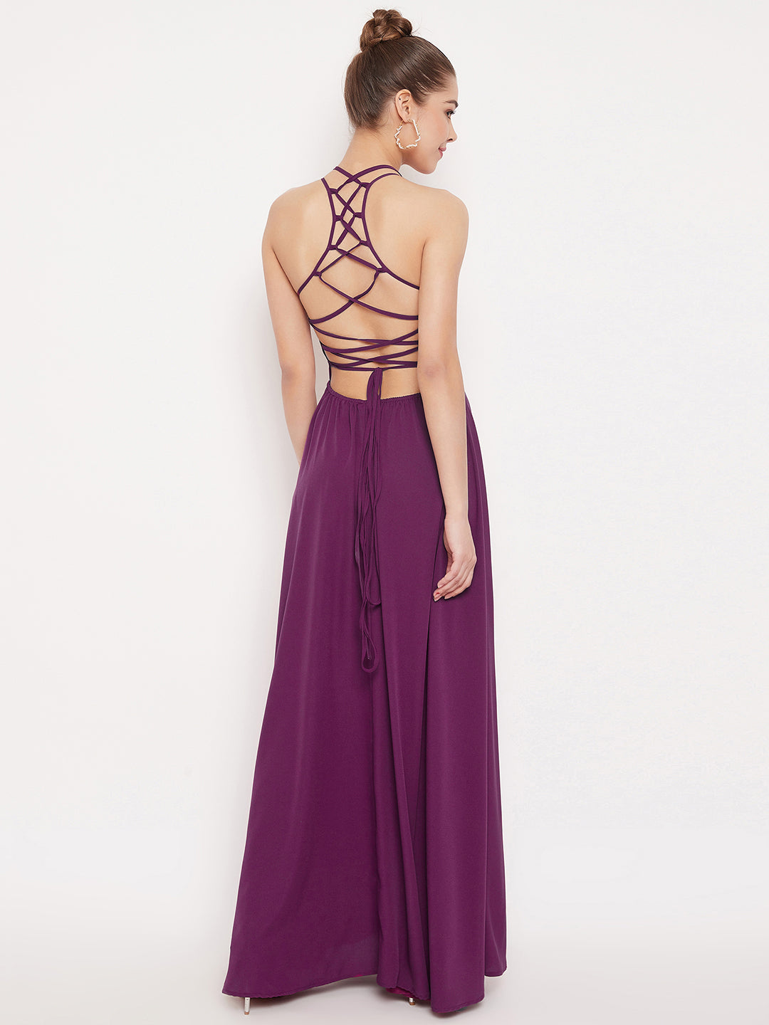 Berrylush Women Solid Purple Caged Back Halter Neck Maxi Dress