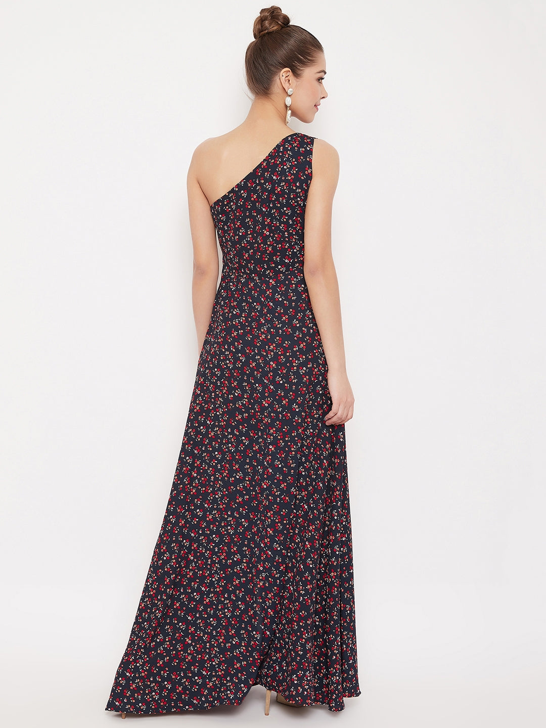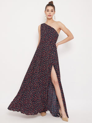 Berrylush Women Navy Blue Floral One Shoulder High Slit Maxi Dress