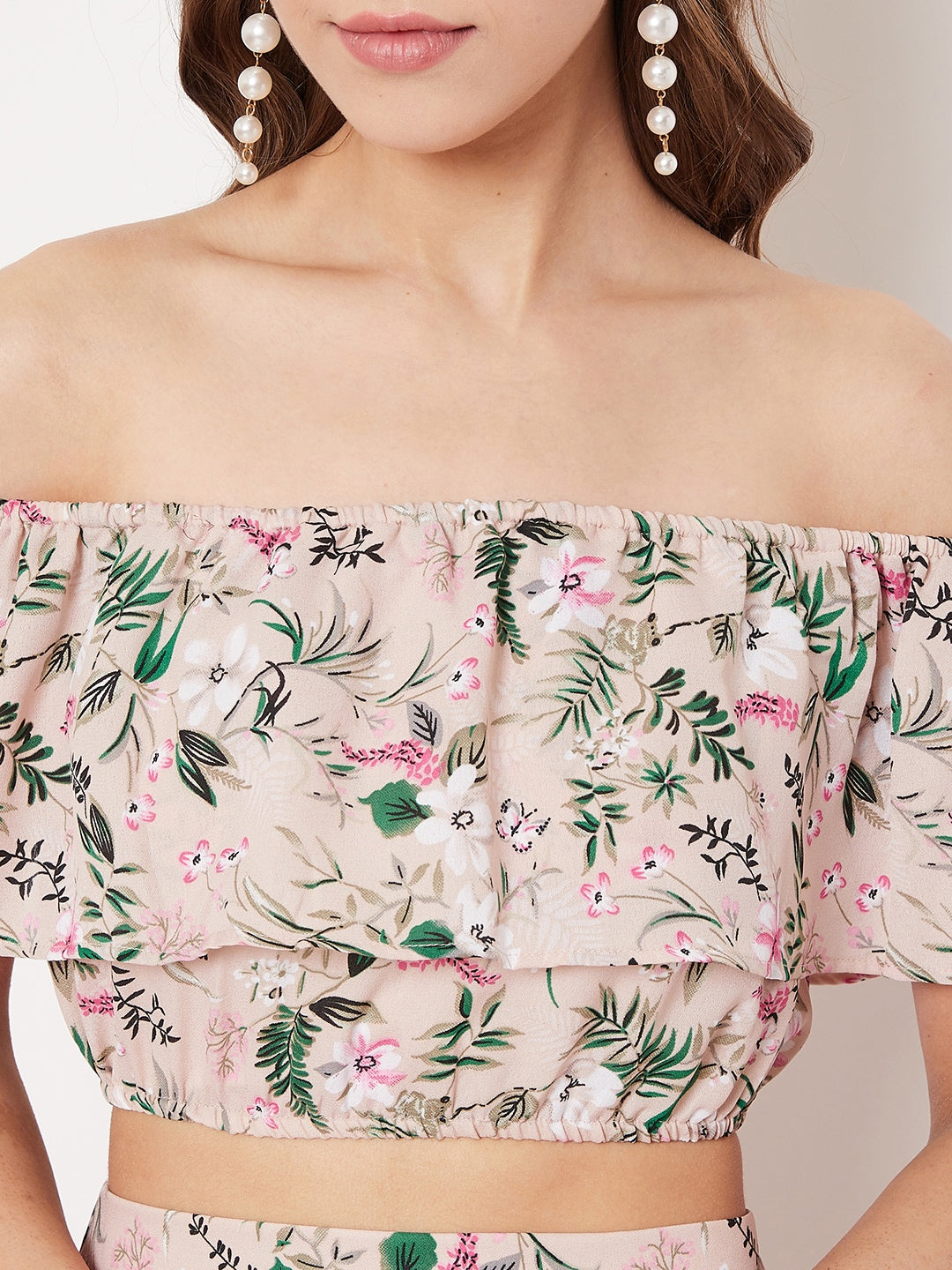 Beige printed woven co-ordinate sets dress, has an off-shoulder neck, short sleeves, concealed zip closure, and flared hem