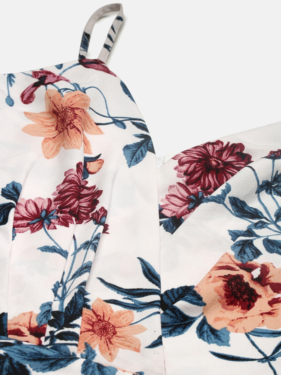 How blissful it would be when you see yourself dressed in the spring's most exquisite White Floral Printed V-Neck Maxi Dress by Berrylush. Blue floral print throughout the body further sparks of a spell that has wonderful magic in its color. The exotic look of this dress from Berrylush is also because of the strappy shoulders that create a seductive gorge over the neckline and also widens the shoulder line. The back with a concealed zip provides unmatched support and is very easy to carry for long hours. For a flowy feel, the designer gave it a long cinderella like flare-up to your ankles. Match this maxi dress with heeled pumps and grove your spring mornings with Berrylush floral outfits.