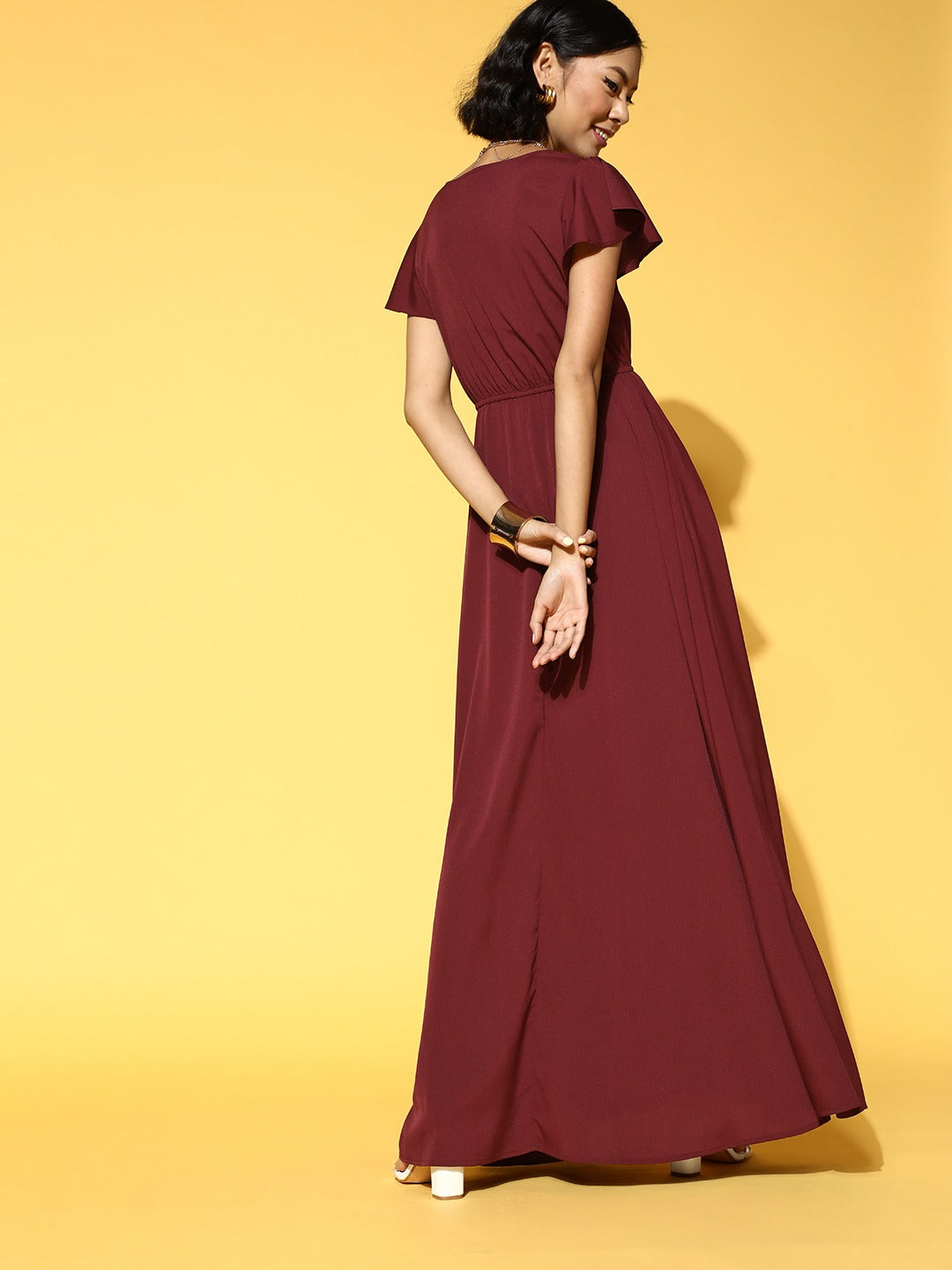 Cocktail party in town and this Berrylush Solid Maroon Maxi Dress is probably the one you are looking for. Designed with a long flared hem, this maxi dress makes for a chic outfit for casual occasions or party evenings. The short flutter sleeves fall from the shoulders to create a fashionable appearance while the cinched waist highlights your curves for a flattering look. The V-neckline of this dress accentuates your collarbones to give you an attractive appeal. Flaunt your legs through the slit detailing at the hem and put on your favorite heels and slay at the party. Complete your look by styling this maroon maxi dress with your favorite accessories.